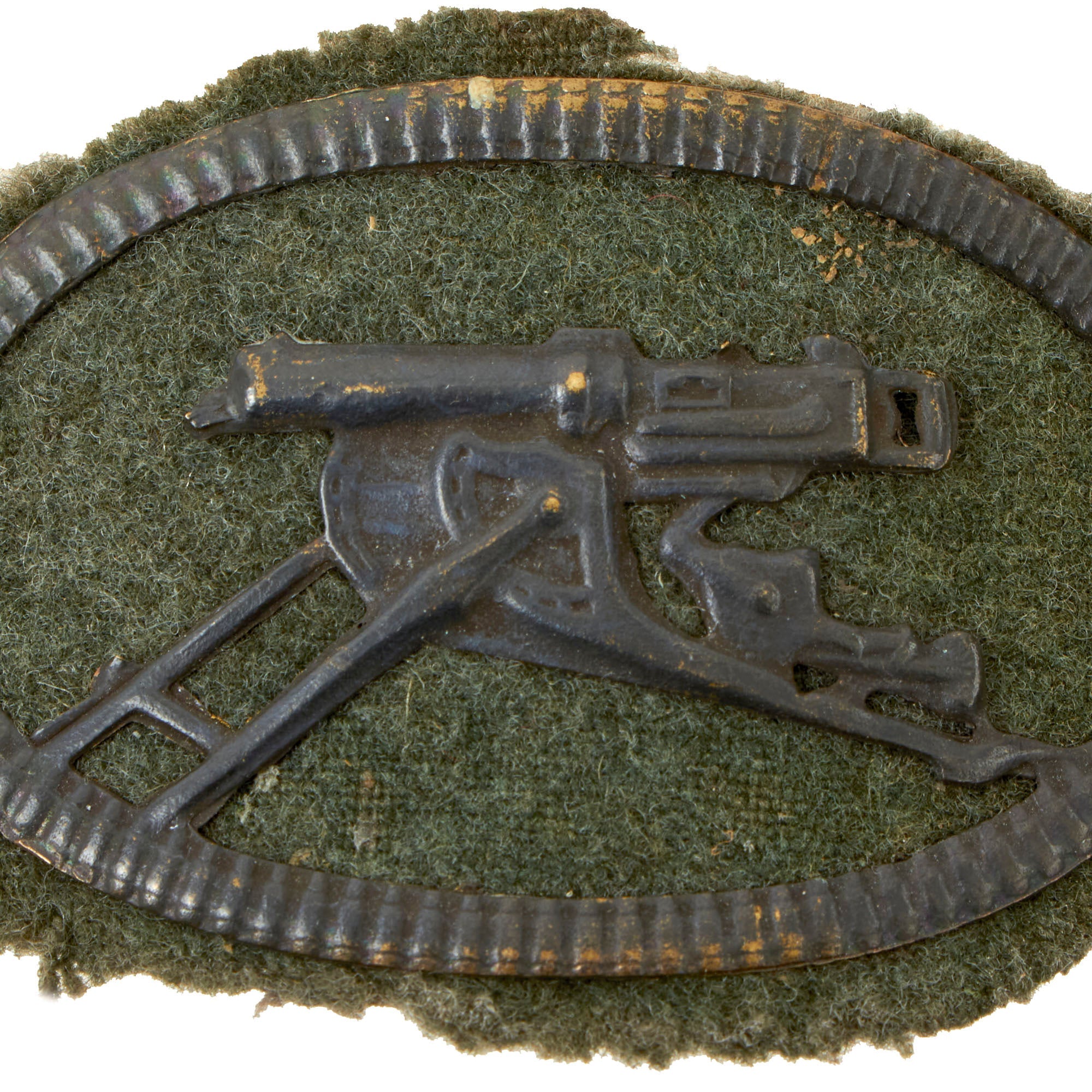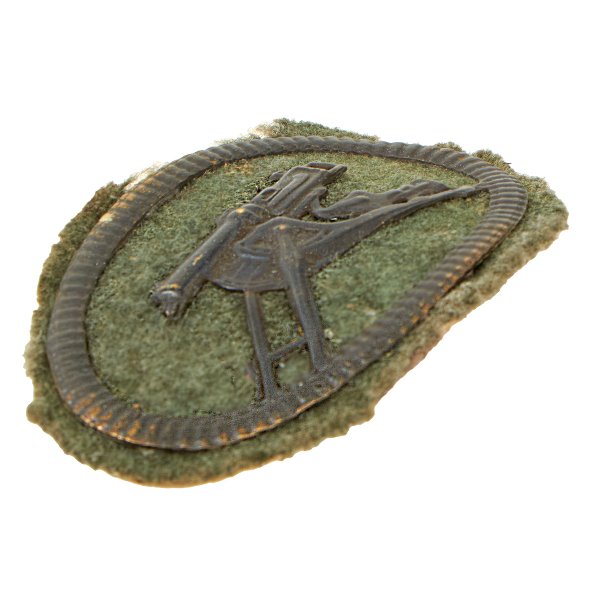 • Original Item. Only One Available. This is an iconic piece of World War I German ephemera, and the first of its kind we have offered, a Machine Gunners badge, removed from a uniform. These are heavily reproduced and it can be difficult to discern a real one, but this one is 100% correct with the cardboard backing and torn fabric from having been taken off of a uniform. These were generally 3 pieces including the machine gun plate, the felt middle piece, and a metal or cardboard backing plate for the front plate’s prongs to be inserted into.