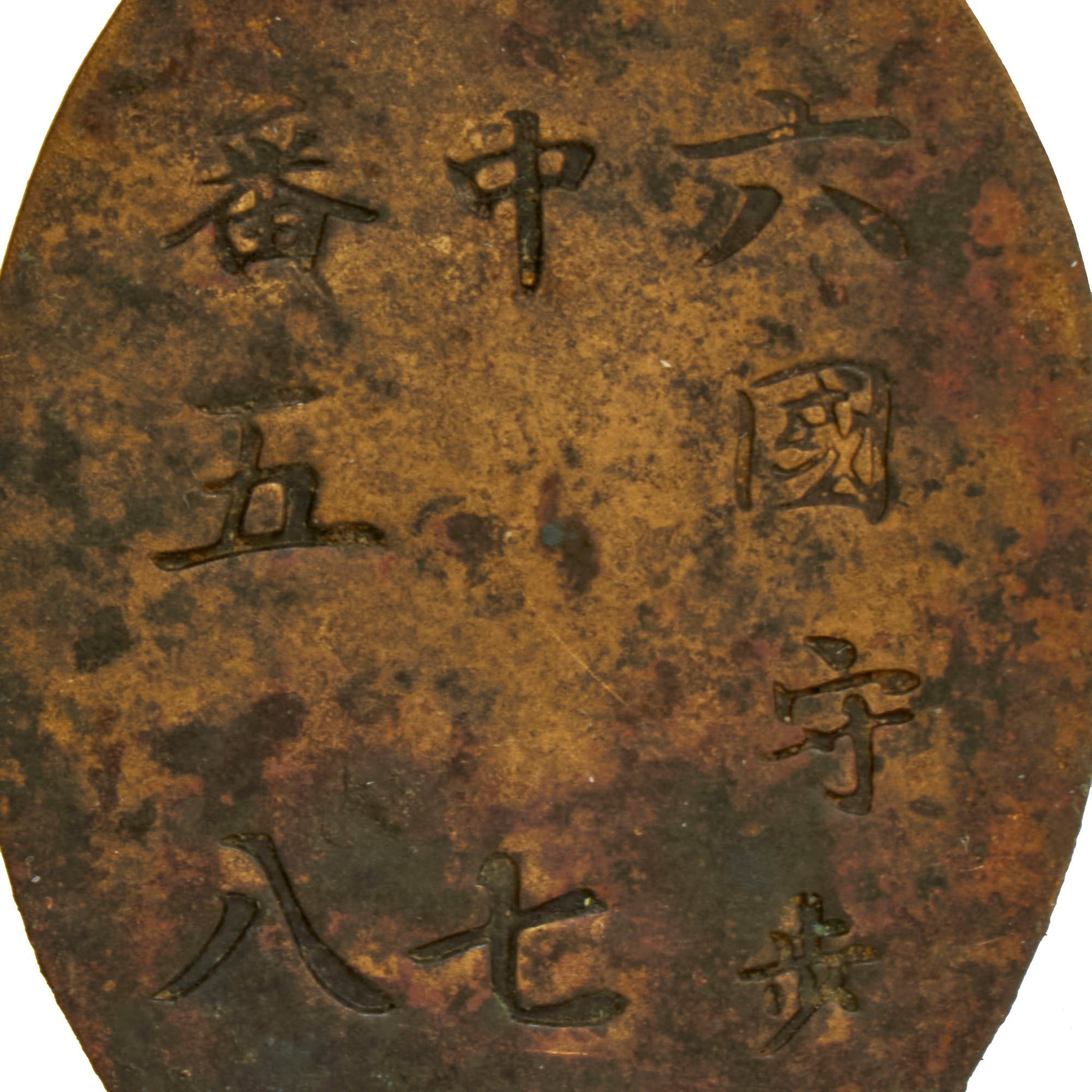 As best we can tell, this tag reads (right to left, top to bottom) 六 國 守 歩 (5th ? ? Infantry ), 中 七 (7th Company), 番 五 八 (Number 5 8). The Dog Tag measures approximately 1 ¾"H x 1 ¼"W, and the first line has a unit designation that we do not entirely recognize, and we are not sure on the second kanji. It does have a "守" modifier in the unit name. As best we can tell, this is one of many "theater" indicators, and what research we could find seems to indicate that it was in Korea or possibly China. The War Relics forum has a very nice thread on these markings, which is definitely a good place to start further research: Japanese Army Dog Tags.