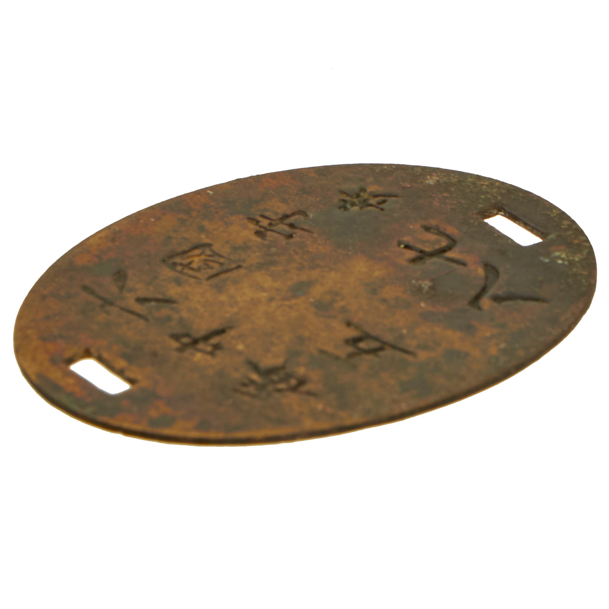 Original Item: Only One Available. This is a lovely patinated and partly legible Japanese WWII brass dog tag, which looks to be from the 5th Infantry, 7th company, soldier No. 58. Imperial Japanese Army dog tags were first introduced on 22 June, 1894 by Army Ordinance No. 63 as “Specifications and Issuing Procedures for ID tags”, immediately before the Sino-Japanese War, which broke out only a month later.