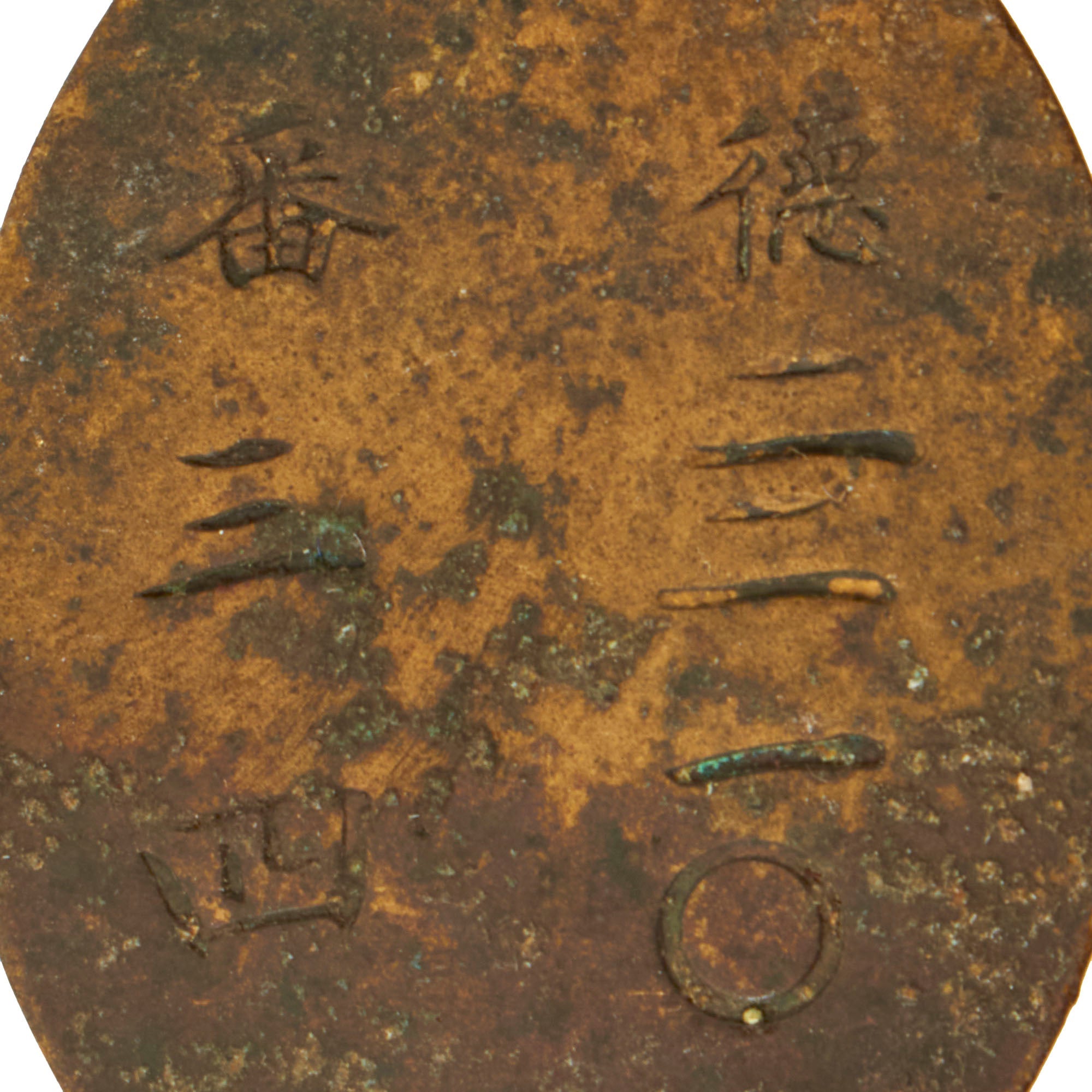 As best we can tell, this tag reads (right to left, top to bottom) 徳 二 二 一 〇 (? 2 2 1 ), 番 三 四 (Number 3 4). The Dog Tag measures approximately 1 ¾"H x 1 ¼"W, and the first line has a unit designation that we do not entirely recognize, and as best we can tell, this is one of many "theater" indicators, and what research we could find seems to indicate that it was in "Manchuria. The War Relics forum has a very nice thread on these markings, which is definitely a good place to start further research: Japanese Army Dog Tags.