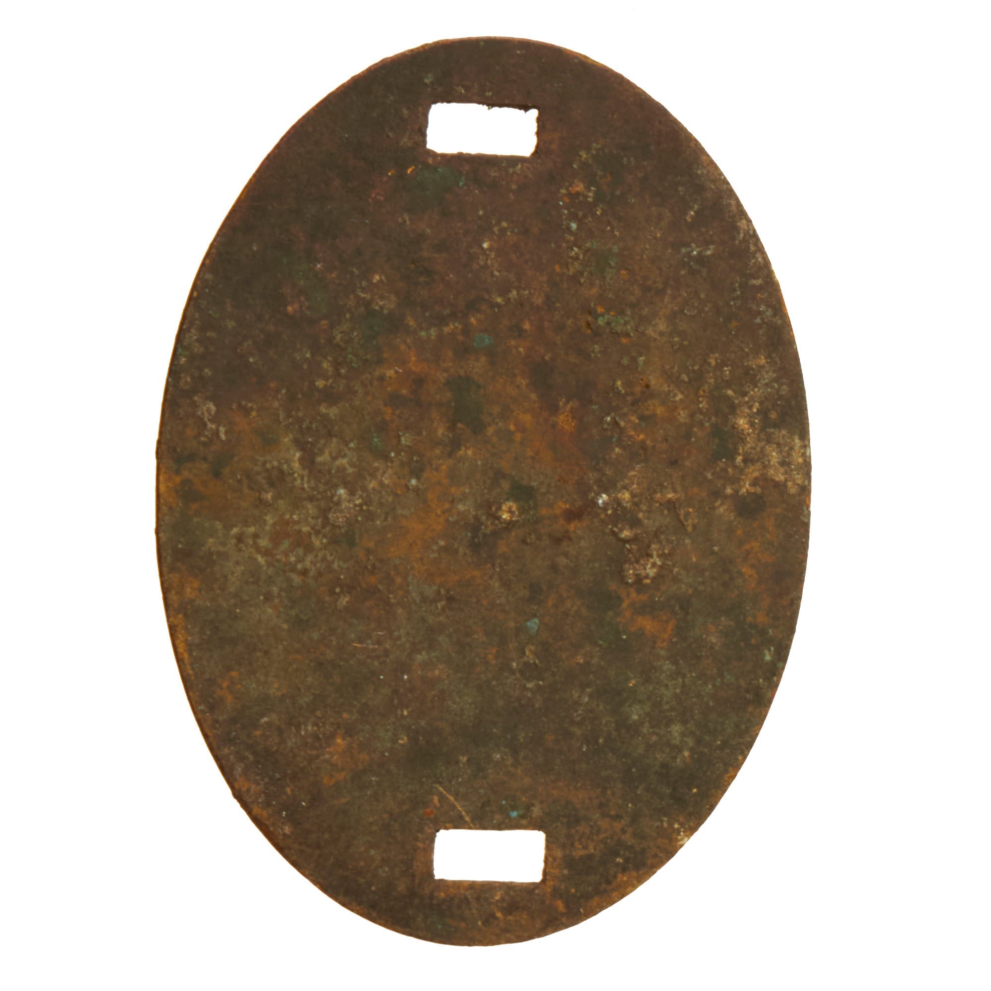 Original Item: Only One Available. This is a lovely patinated and fully legible Japanese WWII brass dog tag, which looks to be from Colonial Unit 2210, soldier No. 34. Imperial Japanese Army dog tags were first introduced on 22 June, 1894 by Army Ordinance No. 63 as “Specifications and Issuing Procedures for ID tags”, immediately before the Sino-Japanese War, which broke out only a month later.