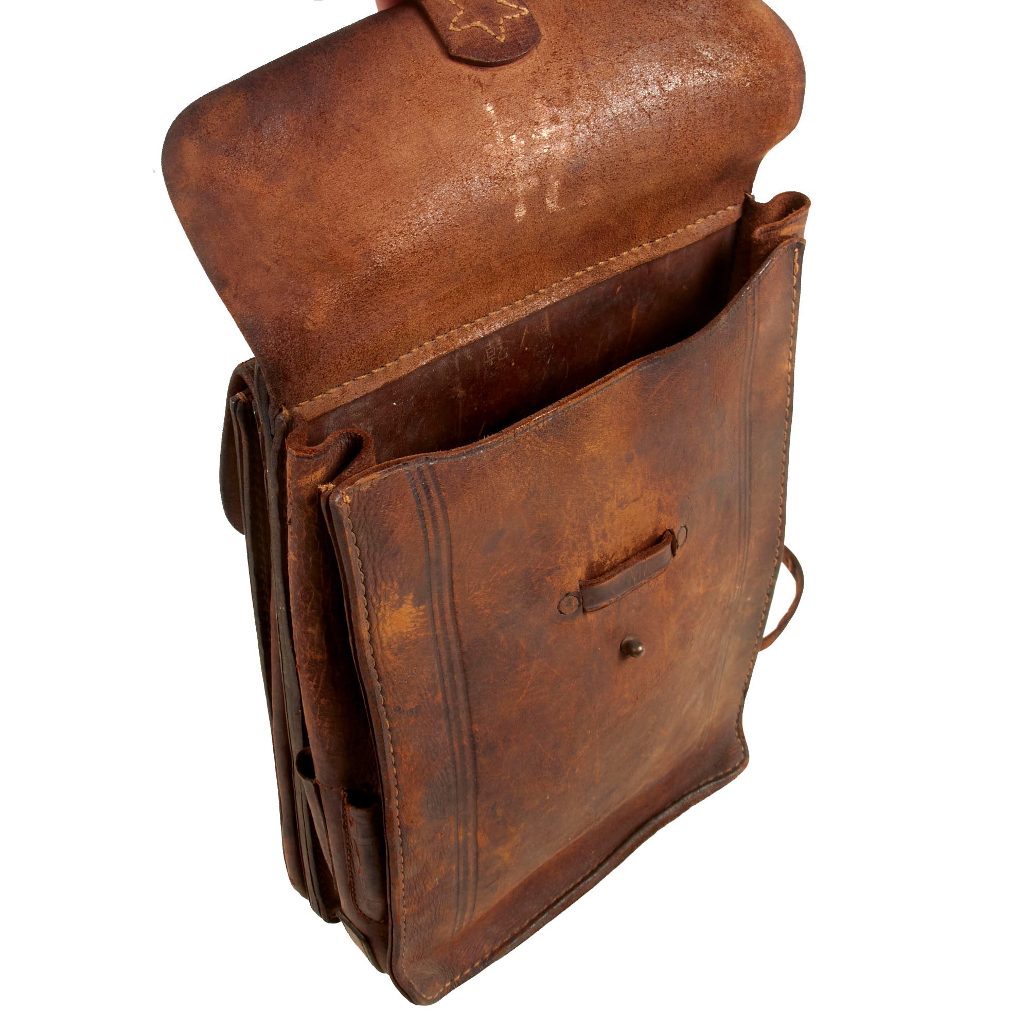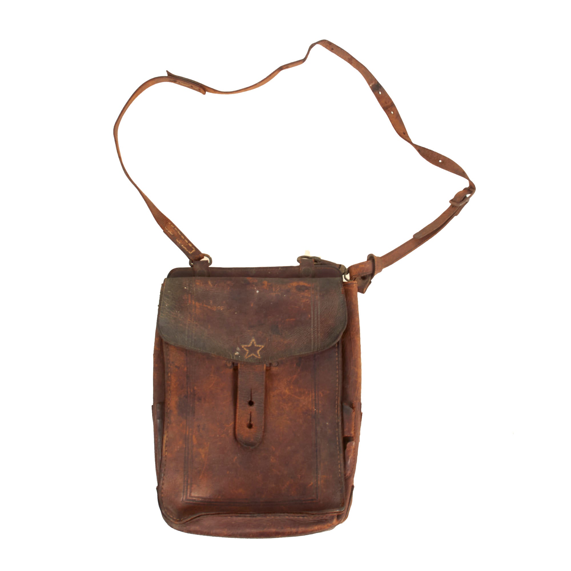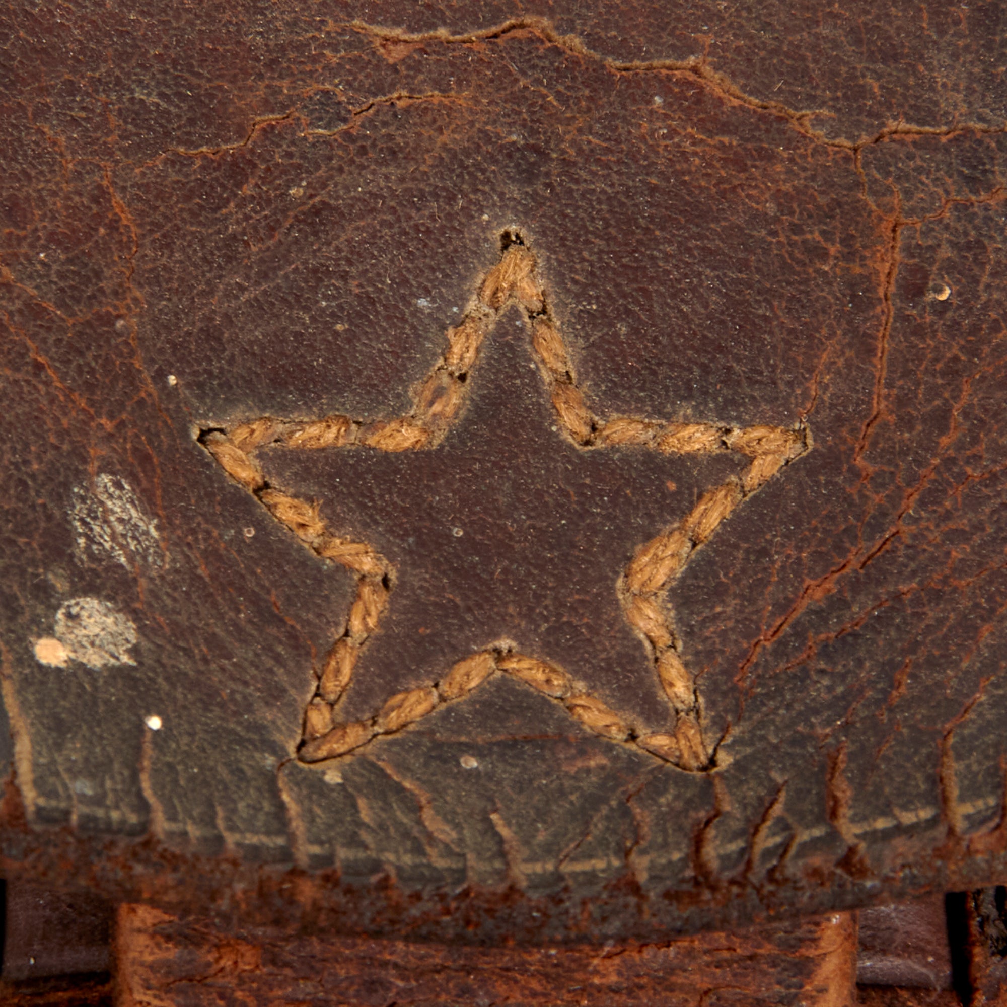 - Officer’s Leather Map Case: The map case is in very good condition, showing typical signs of wear. It is hand-stitched, and embroidered with a five-pointed star. This denotes that the owner was of officer rank within the Japanese military. From this we also know that this map case is an earlier example; the later cases were embroidered with a circle instead of a star.