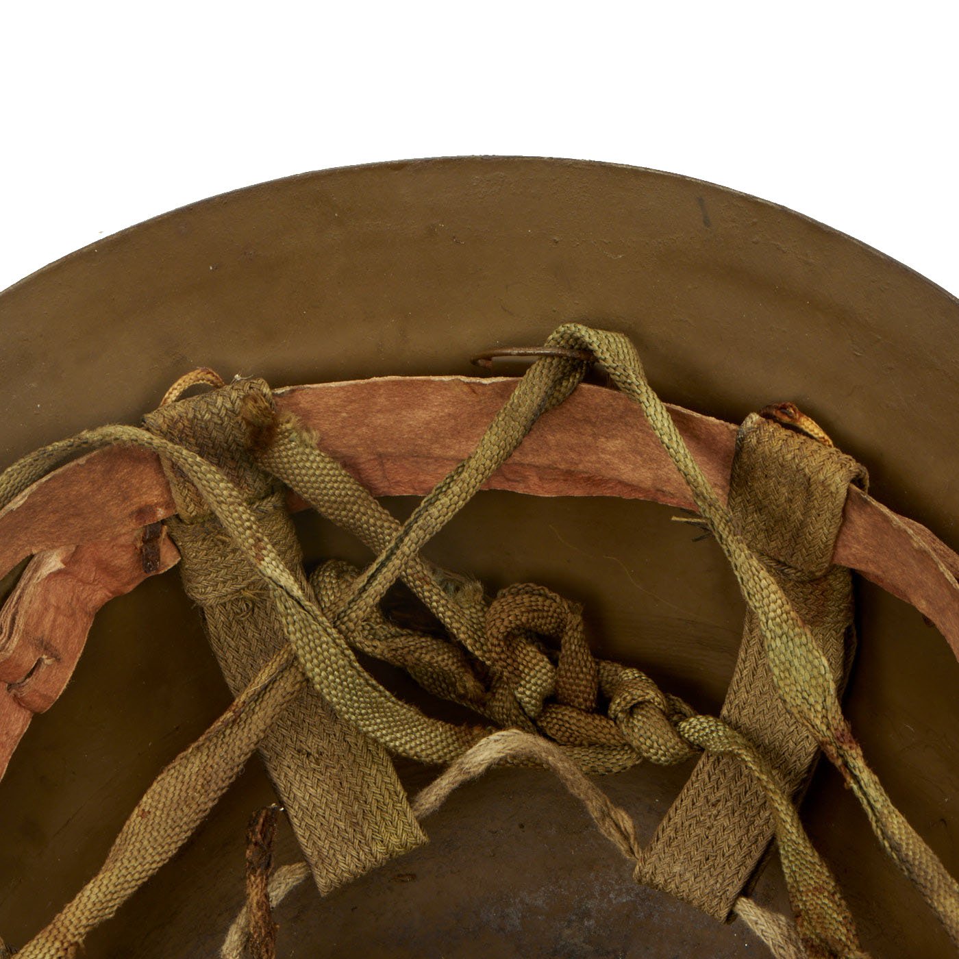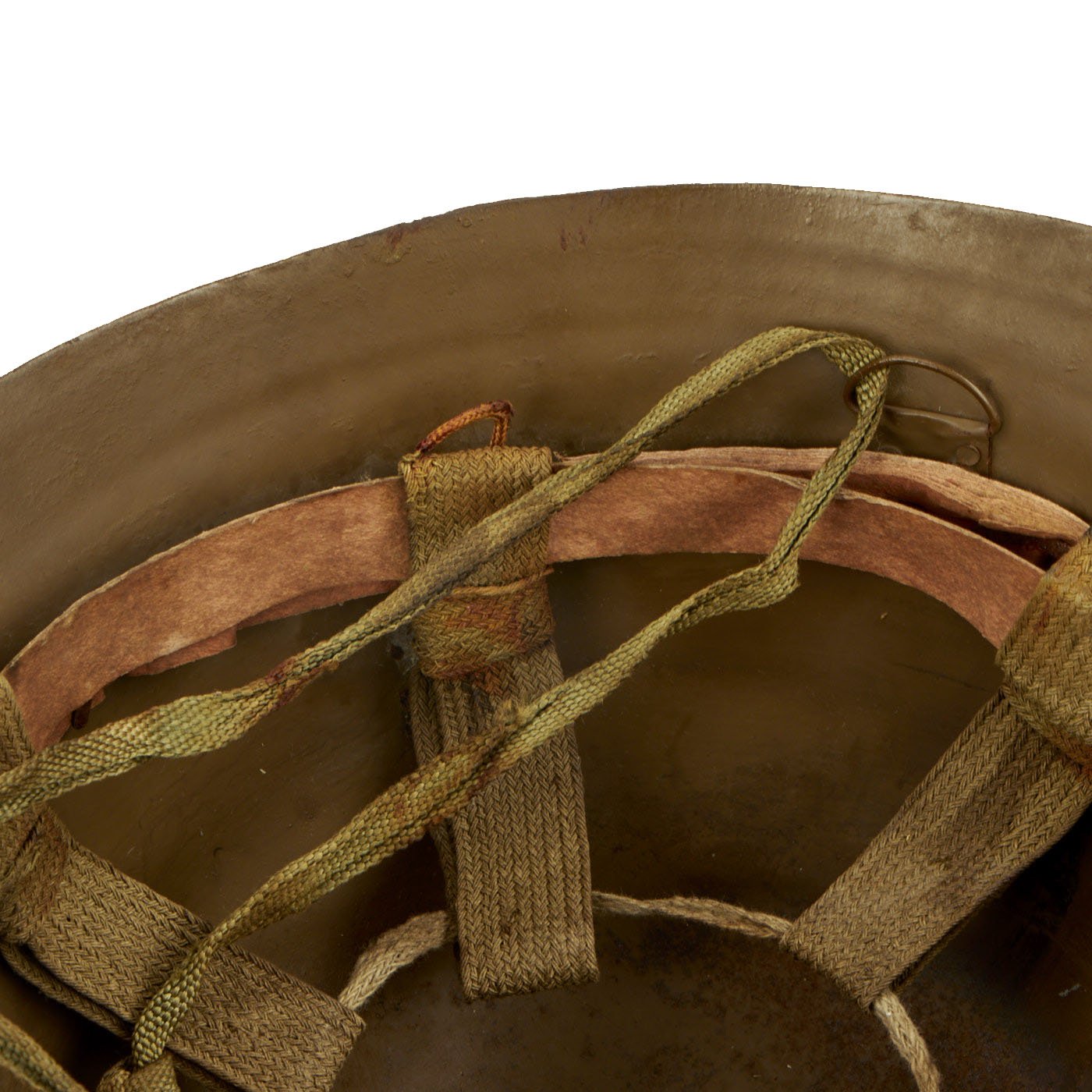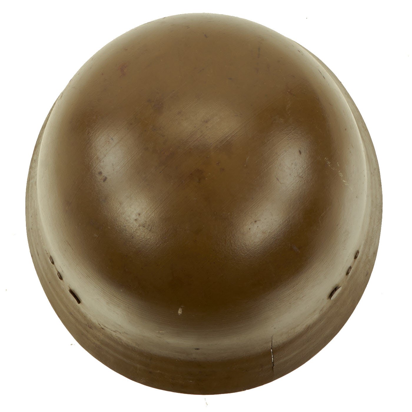 Overall condition is very good with correct brown paint. There is some scuffing and a bit of paint loss on the top, but nothing major. The liner looks to be made of light canvas and oil cloth, with a canvas chin strap. There is some staining and overall wear, but it still displays quite nicely.
