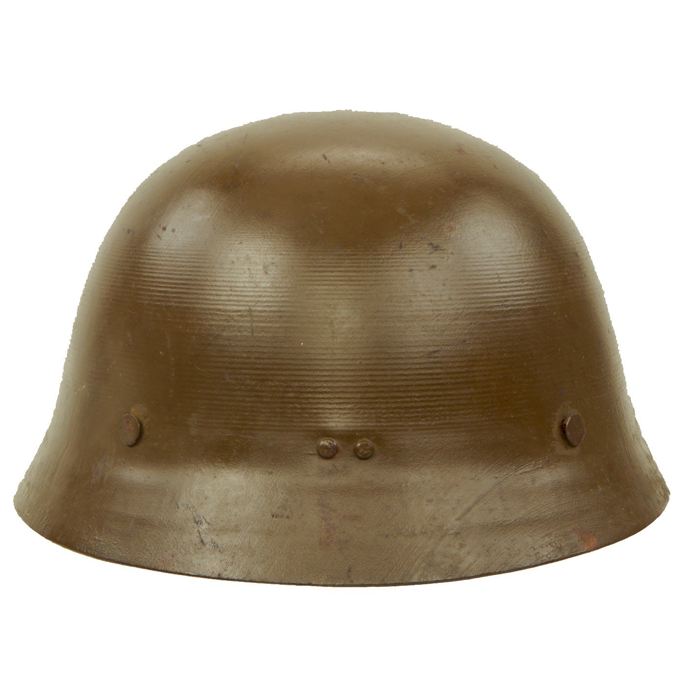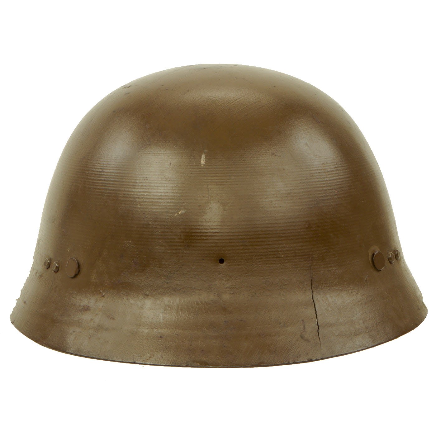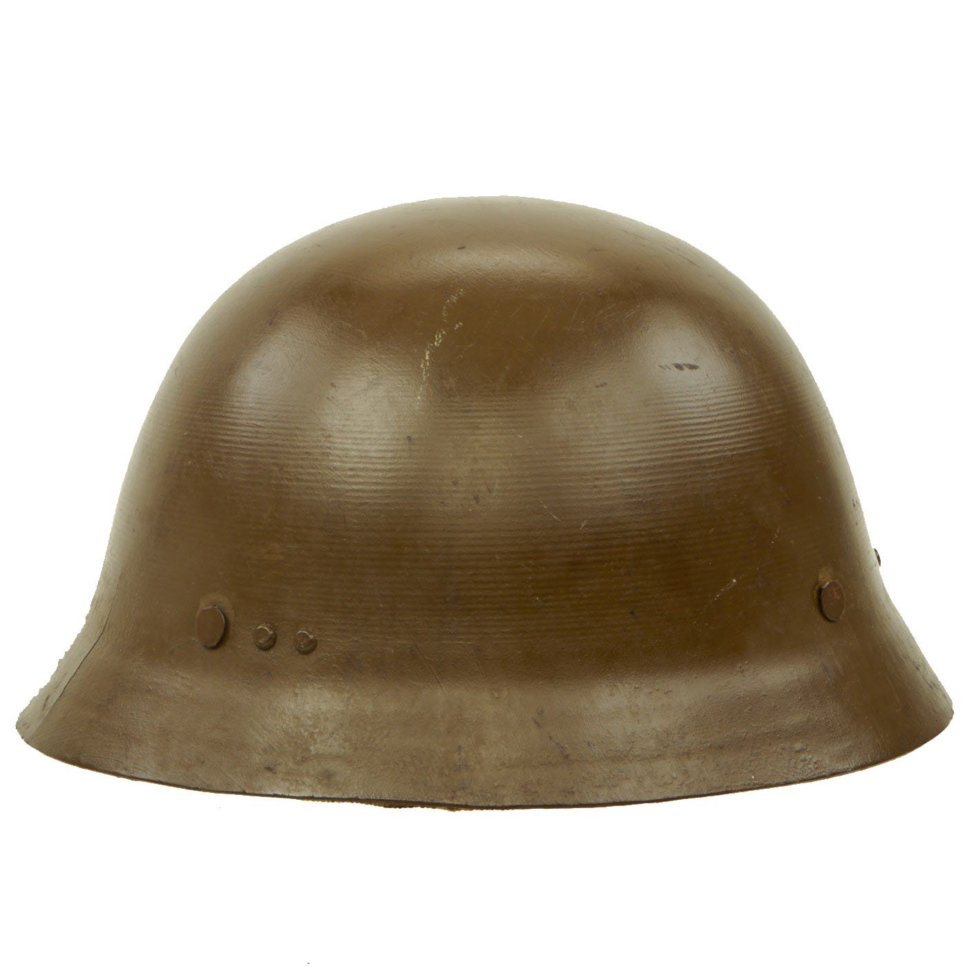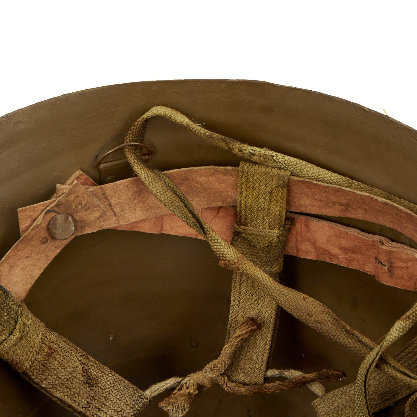 Overall condition is very good with correct brown paint. There is some scuffing and a bit of paint loss on the top, but nothing major. The liner looks to be made of light canvas and oil cloth, with a canvas chin strap. There is some staining and overall wear, but it still displays quite nicely.