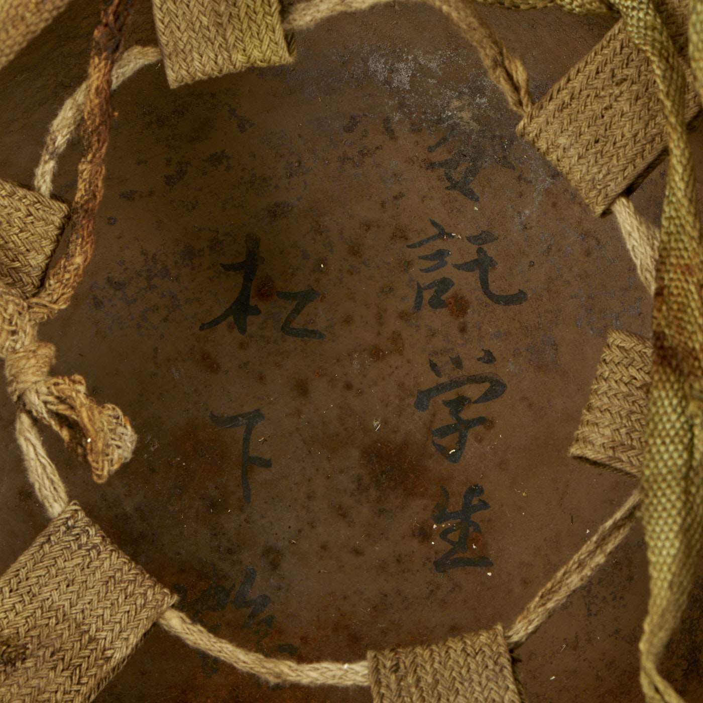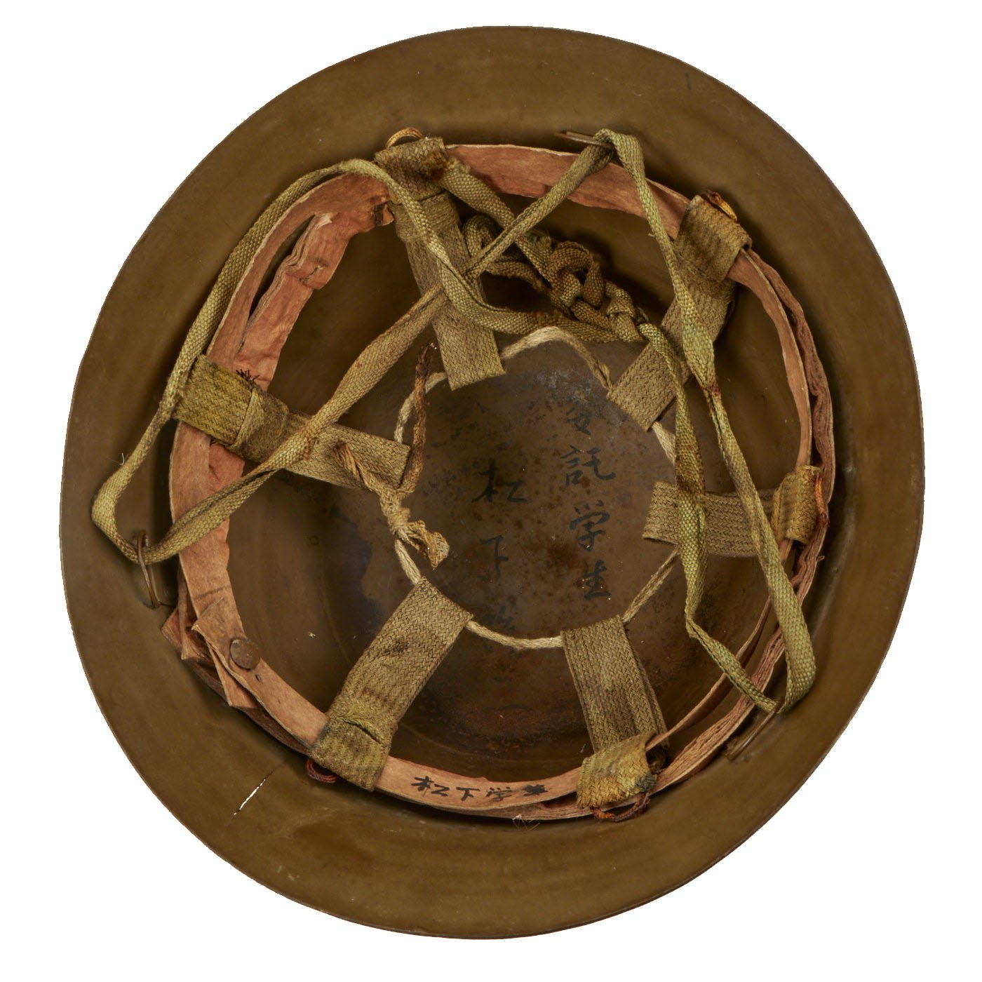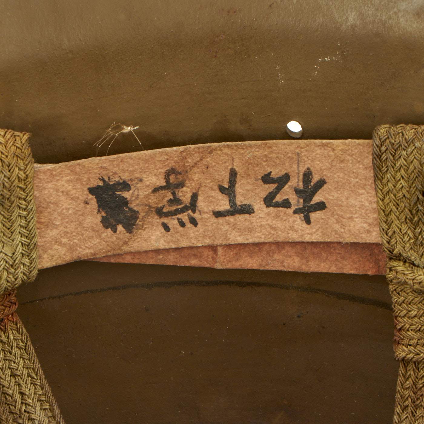 Original Item: Only One Available. This is an extremely rare Type 90 Civil defense helmet, which looks to have had the badge on the front removed, or never installed. The Japanese WWII Civil Defense helmet was the final of four variations of the Type 90 Army helmet and was designed specifically for mainland civil defense. The steel used is not as sturdy, which explains why this one has a crack on the front. The internal liner is very primitive in design, and there is Japanese writing on the sweatband as well as on the inside of the crown. We have not been able to translate this unfortunately.