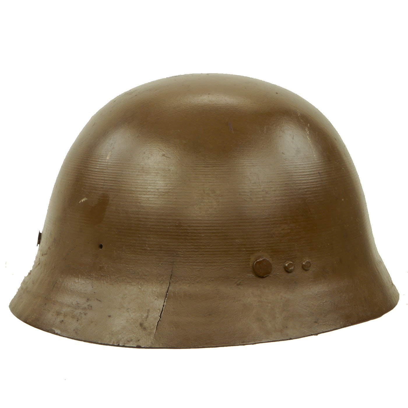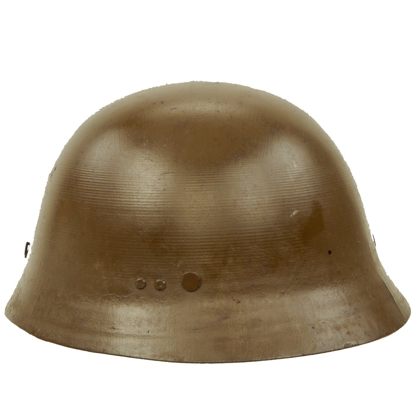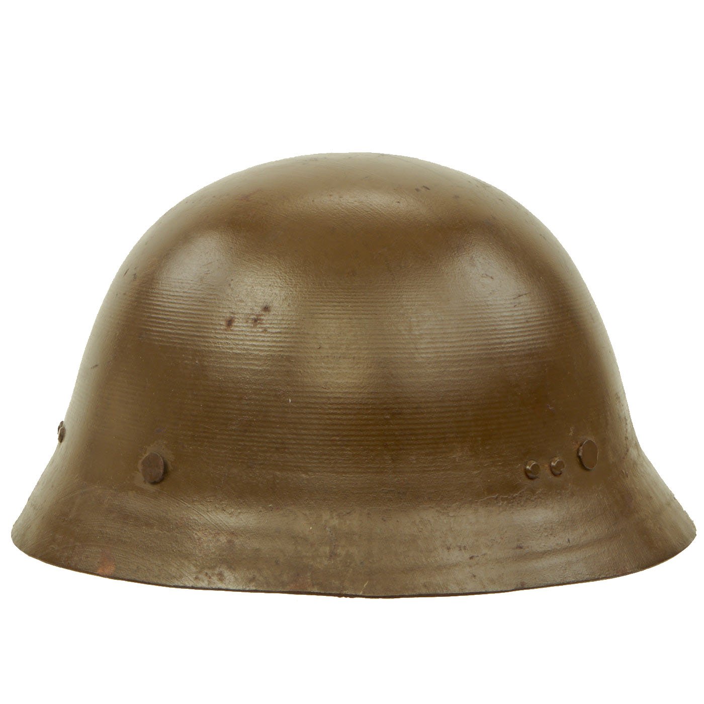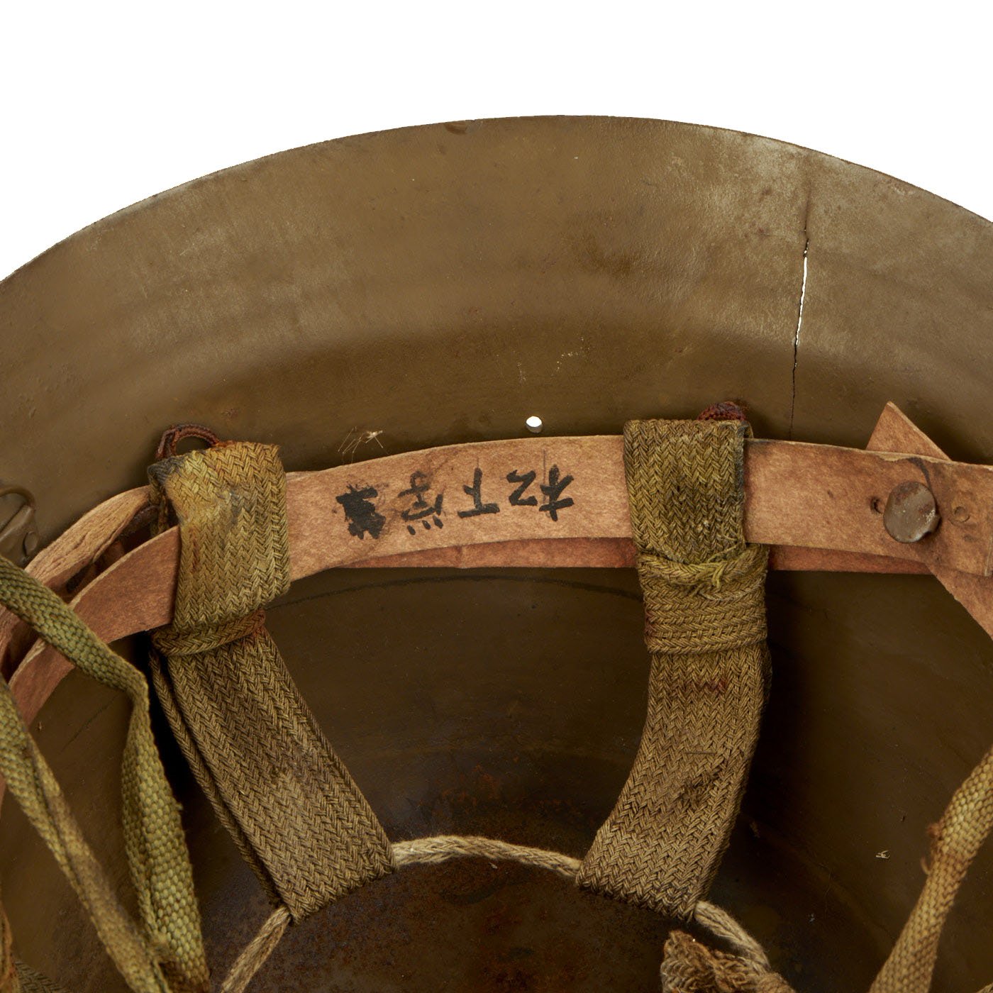 Original Item: Only One Available. This is an extremely rare Type 90 Civil defense helmet, which looks to have had the badge on the front removed, or never installed. The Japanese WWII Civil Defense helmet was the final of four variations of the Type 90 Army helmet and was designed specifically for mainland civil defense. The steel used is not as sturdy, which explains why this one has a crack on the front. The internal liner is very primitive in design, and there is Japanese writing on the sweatband as well as on the inside of the crown. We have not been able to translate this unfortunately.