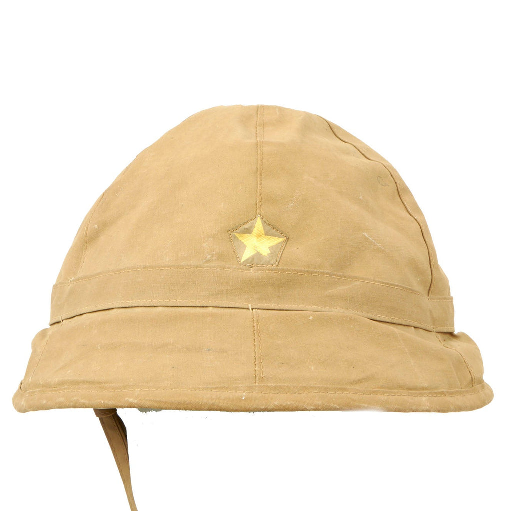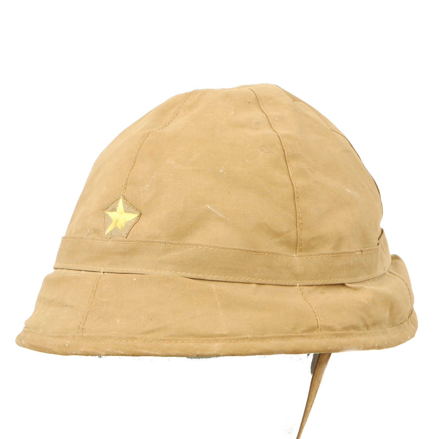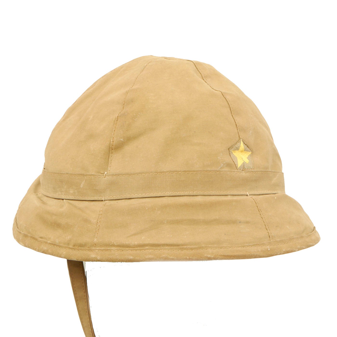 Original Item: Only One Available. This is a very nice original WWII Japanese Army type 98 tropical sun pith helmet. It no longer retains its internal wicker form, unfortunately it was crushed at some point. Comes with original pentagonal bevo style cloth embroidered army star insignia to the front. Helmet has part of the original suspension system and original chinstrap.