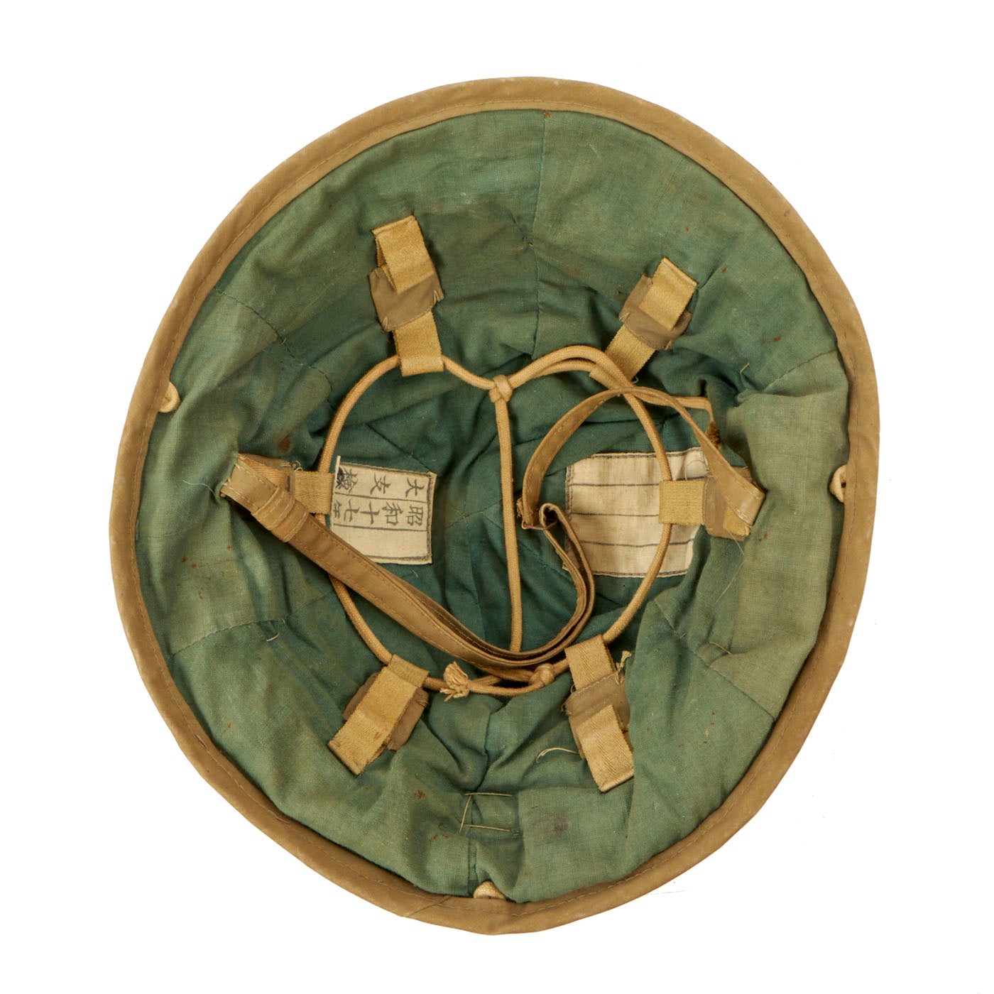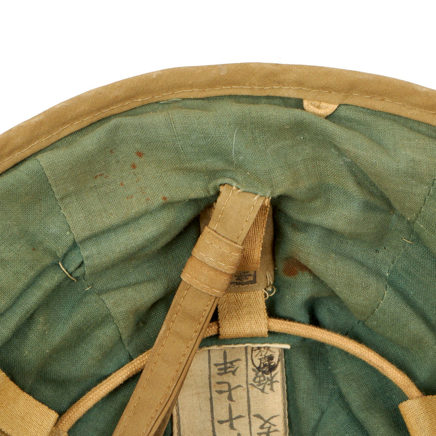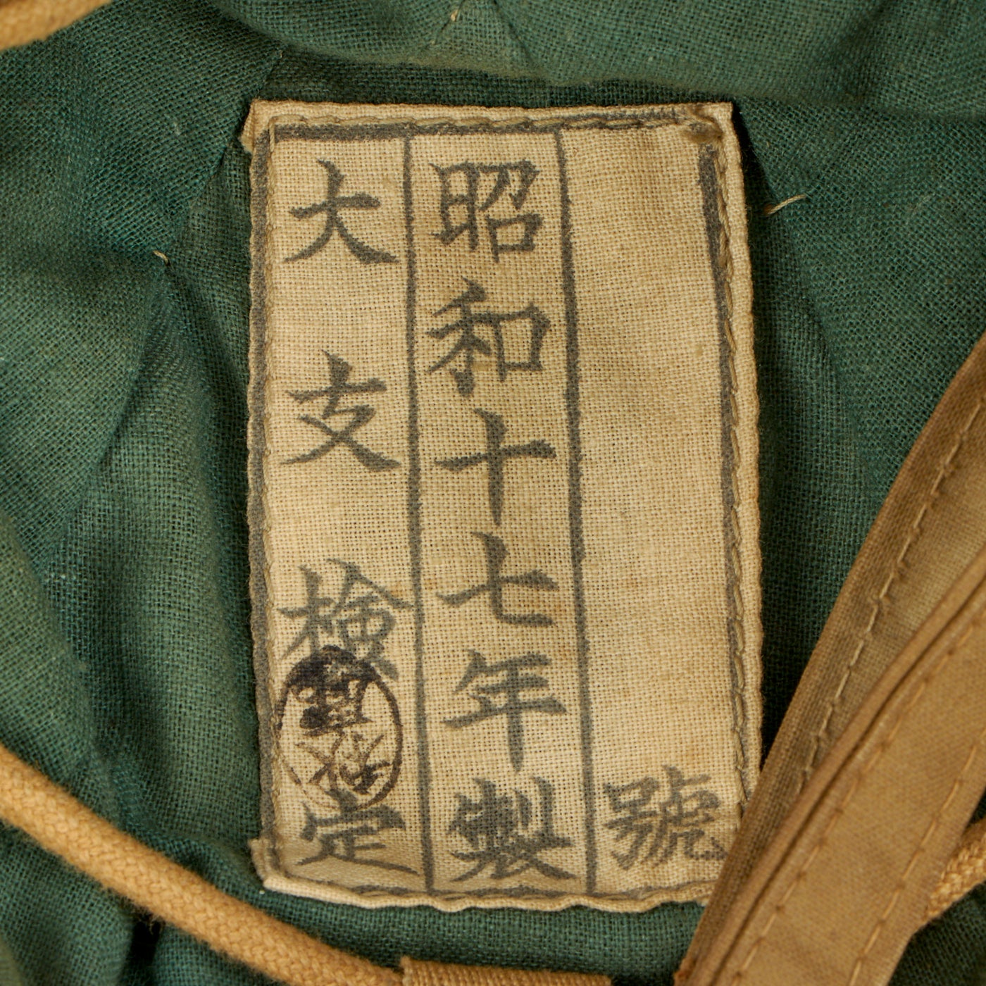 This example is well marked with original labels inside bearing Japanese kanji characters. One of these is marked with the date 昭和十七年. This would be read: SHOWA (current reigning emperor) Juu-Nana Nen (17th year of reign - 1942). There is also an “M” stamped on the right side where the chinstrap attaches.