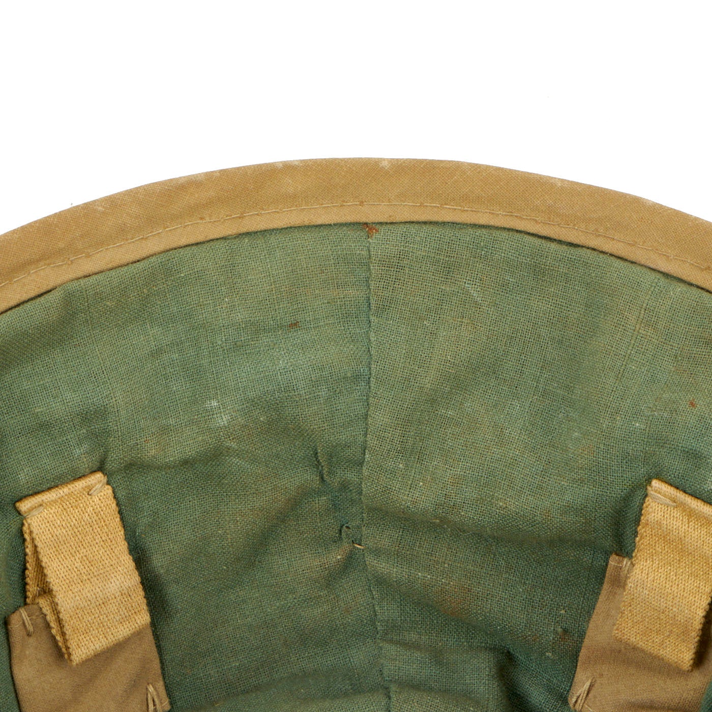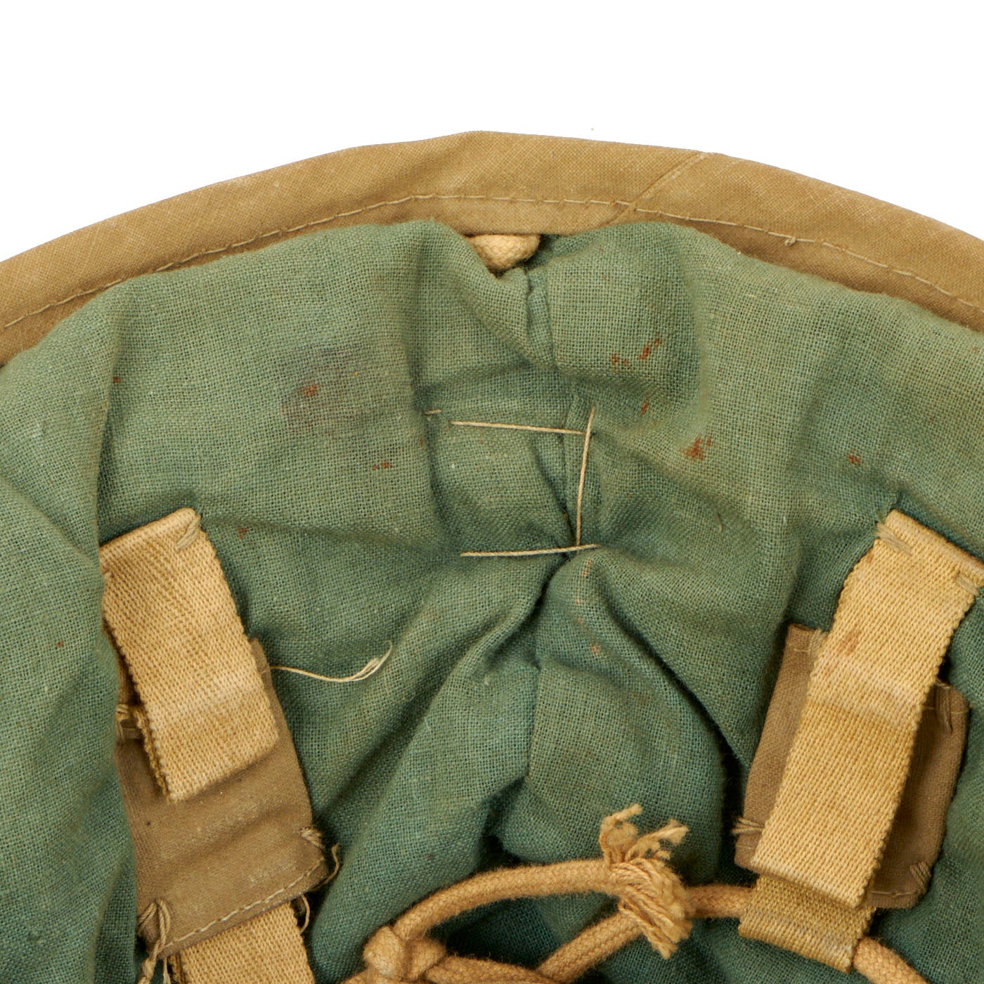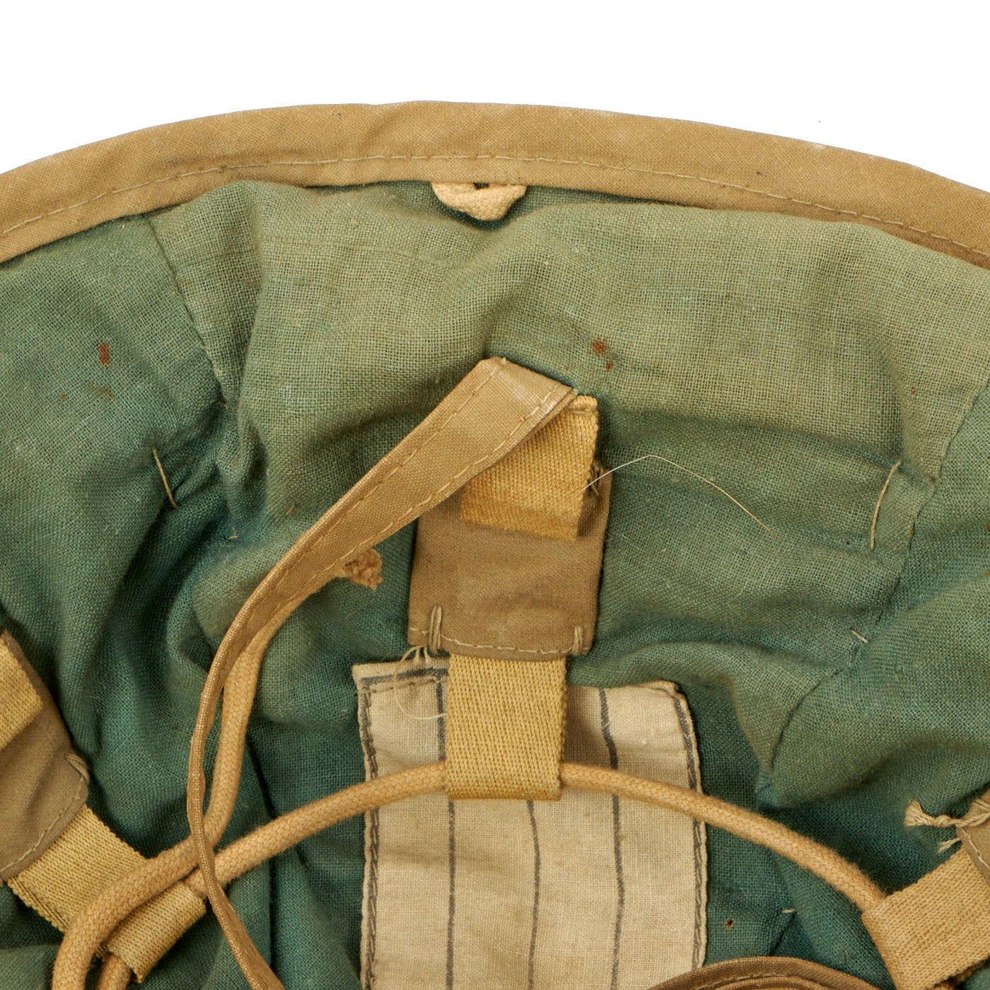 This example is well marked with original labels inside bearing Japanese kanji characters. One of these is marked with the date 昭和十七年. This would be read: SHOWA (current reigning emperor) Juu-Nana Nen (17th year of reign - 1942). There is also an “M” stamped on the right side where the chinstrap attaches.