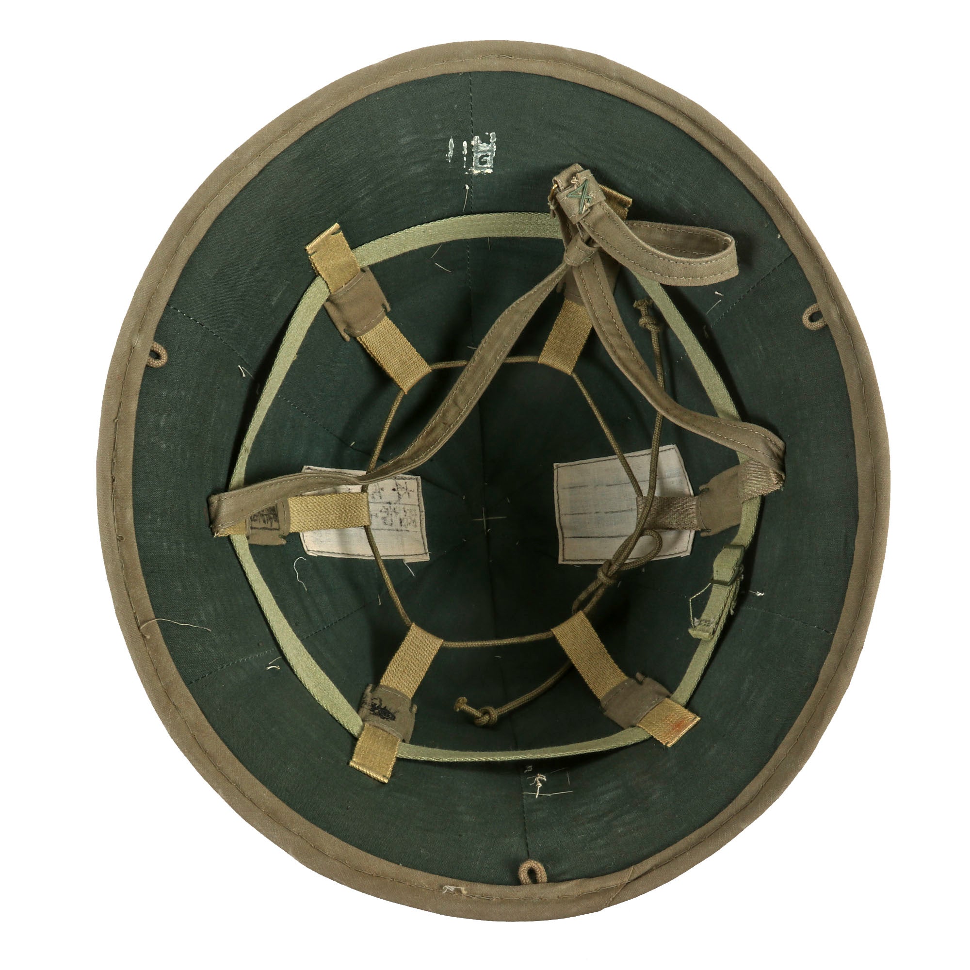 The condition does show wear consistent with service and storage, but it had held up very well overall without any serious flaws. The exterior has some very light staining, but there is no wear to the yellow star on the front of the helmet. The interior retains the color well. The lower suspension band is present with a working buckle. It has a complete functional chin strap.