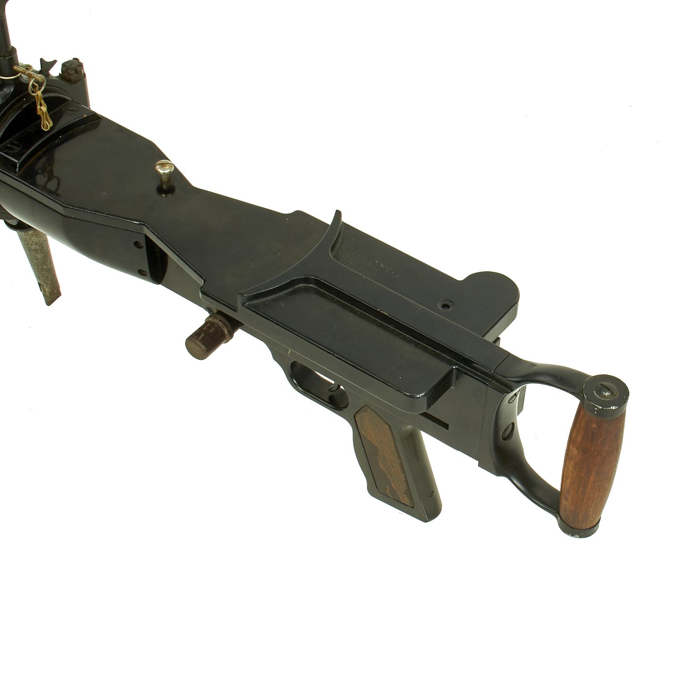 A lot of careful thought went into the Hythe, far beyond simply a camera in a gun-shaped shell. For starters, it was made in 1915 to very closely match the handling, balance, and weight of a Lewis Gun (one of the most common aerial guns at the time with British and US forces). It could be fixed to the top wing of a biplane or on a flexible ring mount just like a real gun, and was maneuvered and aimed exactly like a real Lewis. The shutter was tripped by the trigger, just like a gun, and film was advanced by using a replica of the Lewis’ charging handle. In addition, a real Lewis magazine mounted atop the device, and could be changed just like a Lewis (we’ll elaborate on that in a moment).