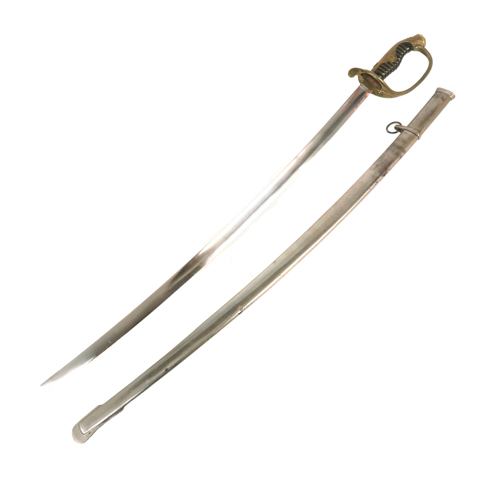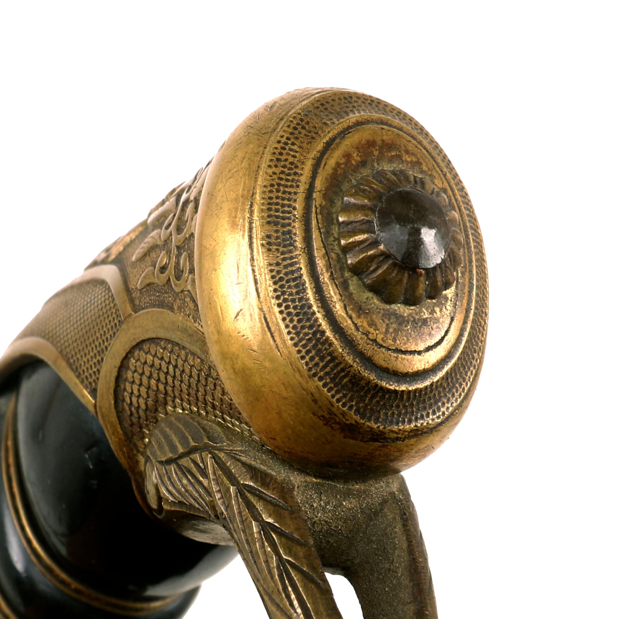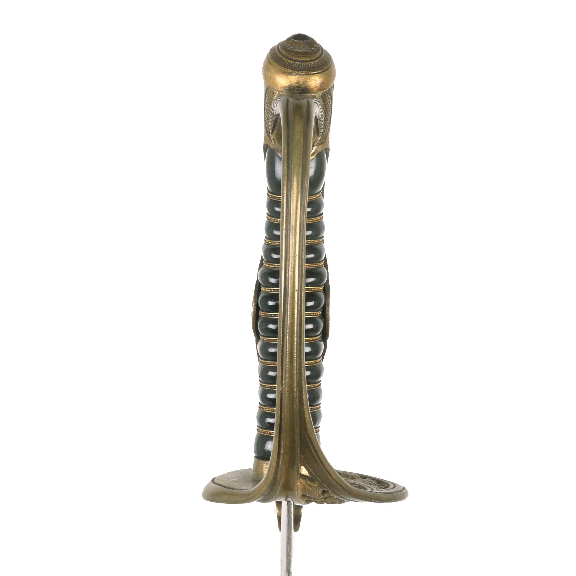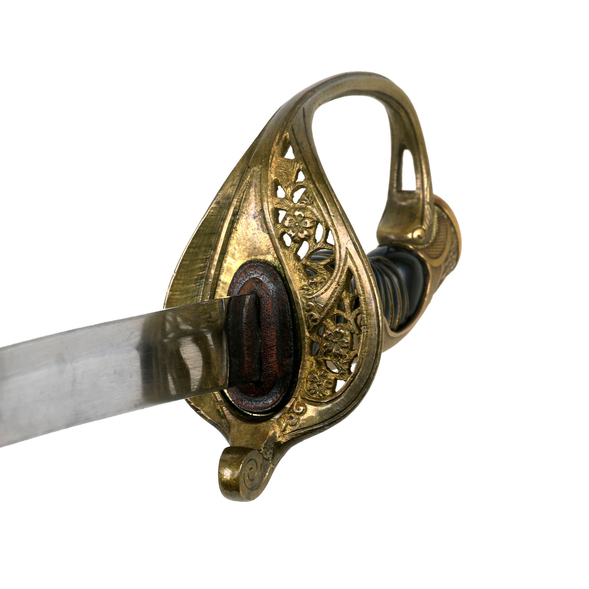 This is a very fine example in lovely well preserved condition. The brass guard has a rich patina, with much of the original gilt finish still retained, especially on the outside of the guard. The brass wire wrap on the handle is complete and still tightly wrapped, and the grip is in very good shape without any serious damage. The blade is in very good condition, with the full nickel finish well retained, showing some overall wear and light oxidation, but no real loss of plating. The etched simulated temper line (hamon) can still be very faintly seen in the light, and the leather blade buffer is still retained, something that’s often missing on these.