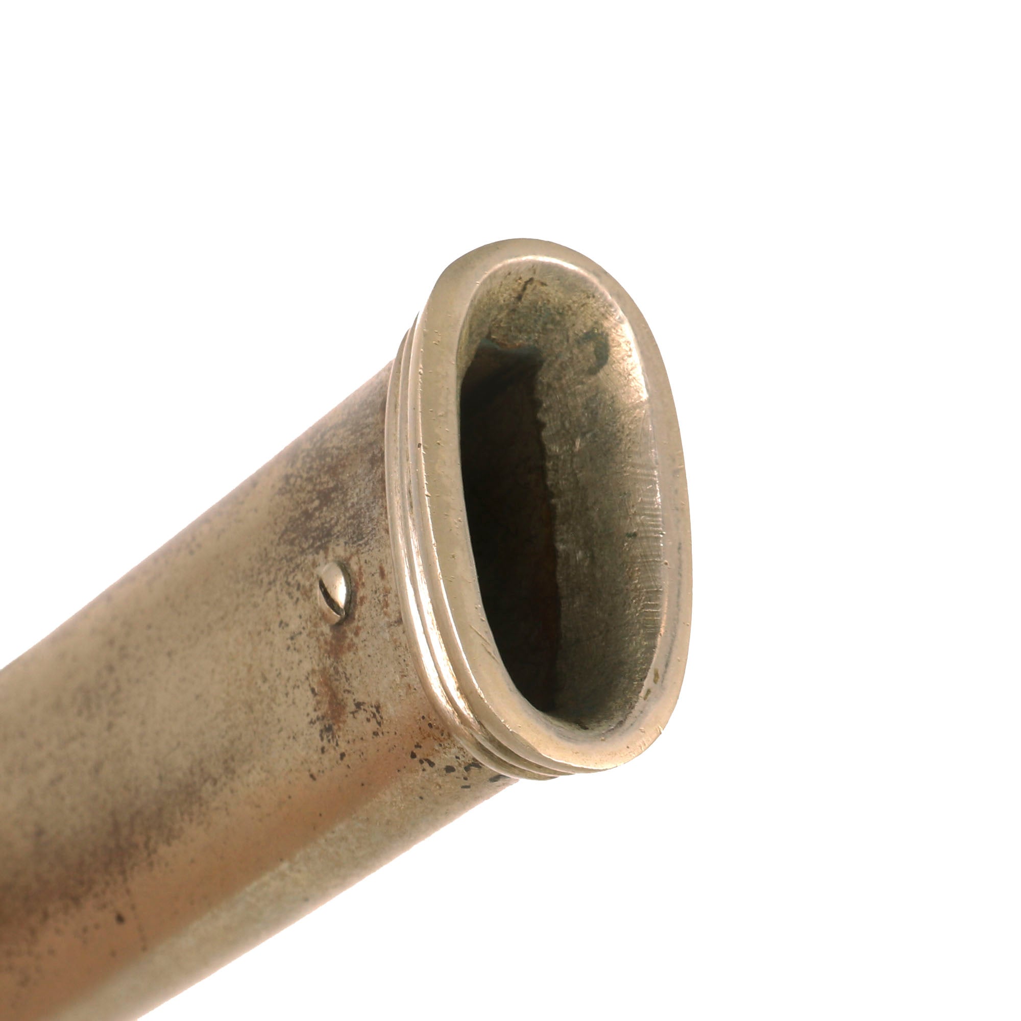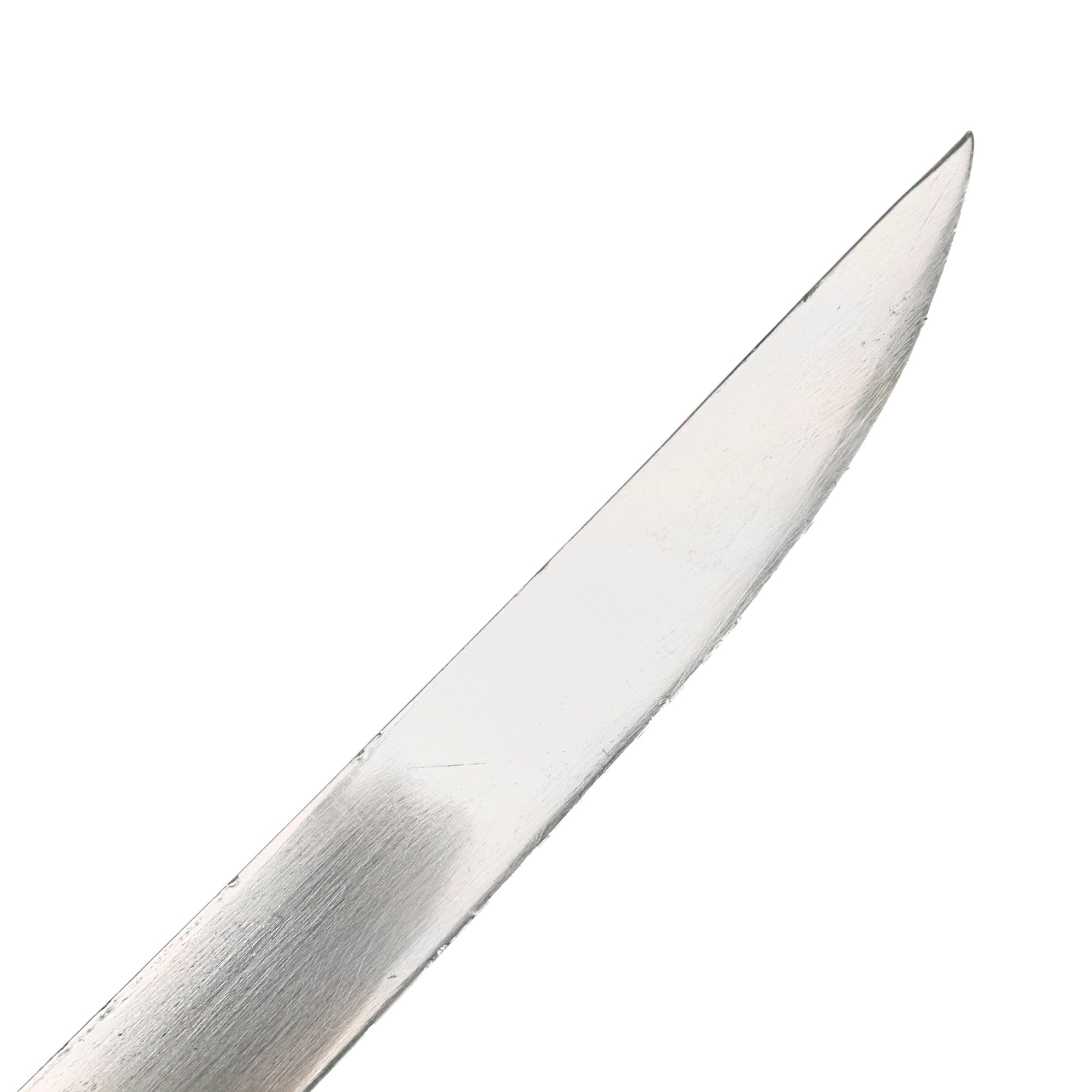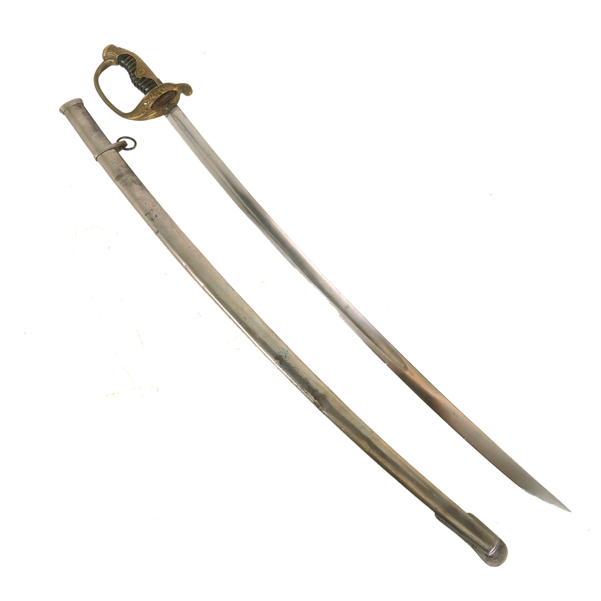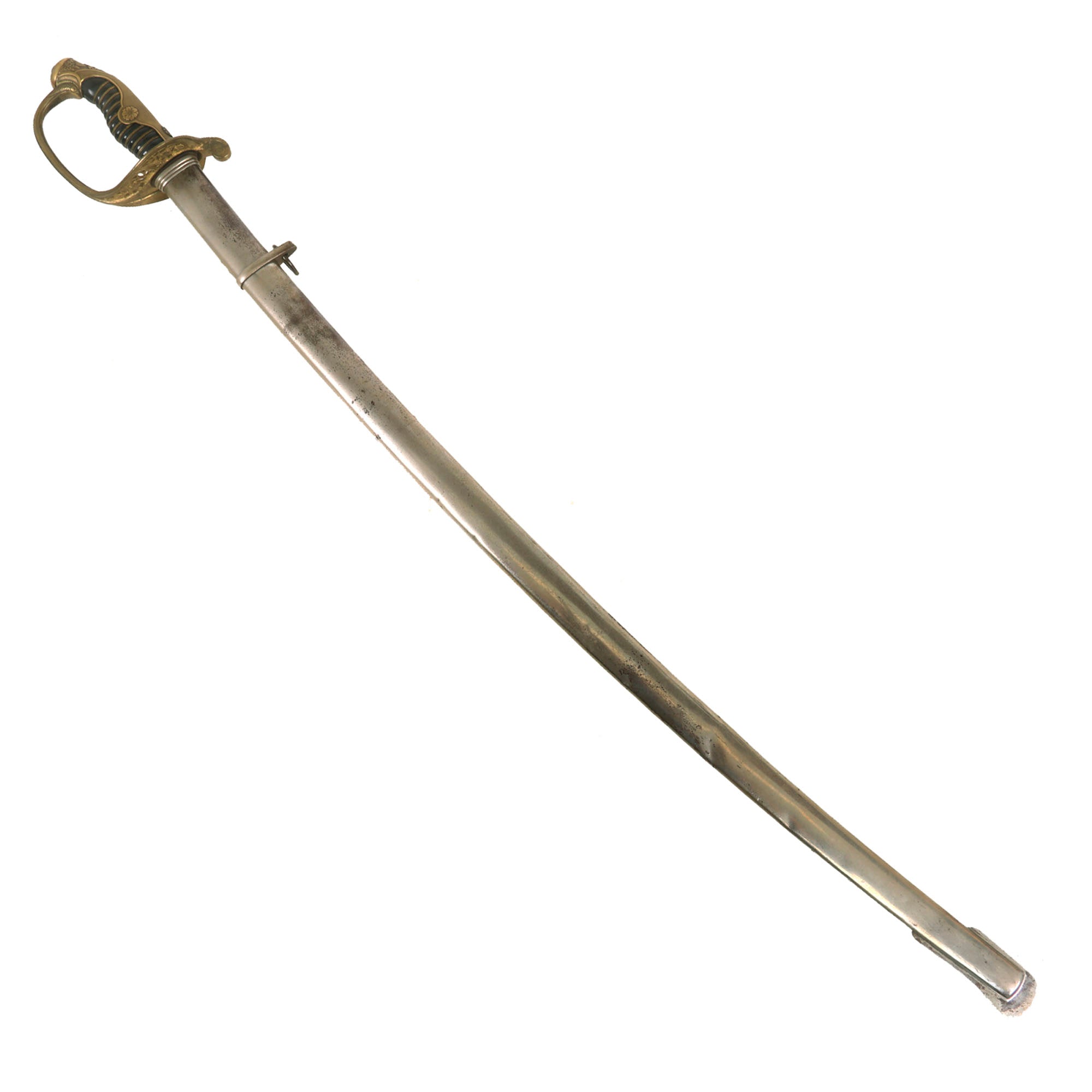 This is a very fine example in lovely well preserved condition. The brass guard has a rich patina, with much of the original gilt finish still retained, especially on the outside of the guard. The brass wire wrap on the handle is complete and still tightly wrapped, and the grip is in very good shape without any serious damage. The blade is in very good condition, with the full nickel finish well retained, showing some overall wear and light oxidation, but no real loss of plating. The etched simulated temper line (hamon) can still be very faintly seen in the light, and the leather blade buffer is still retained, something that’s often missing on these.