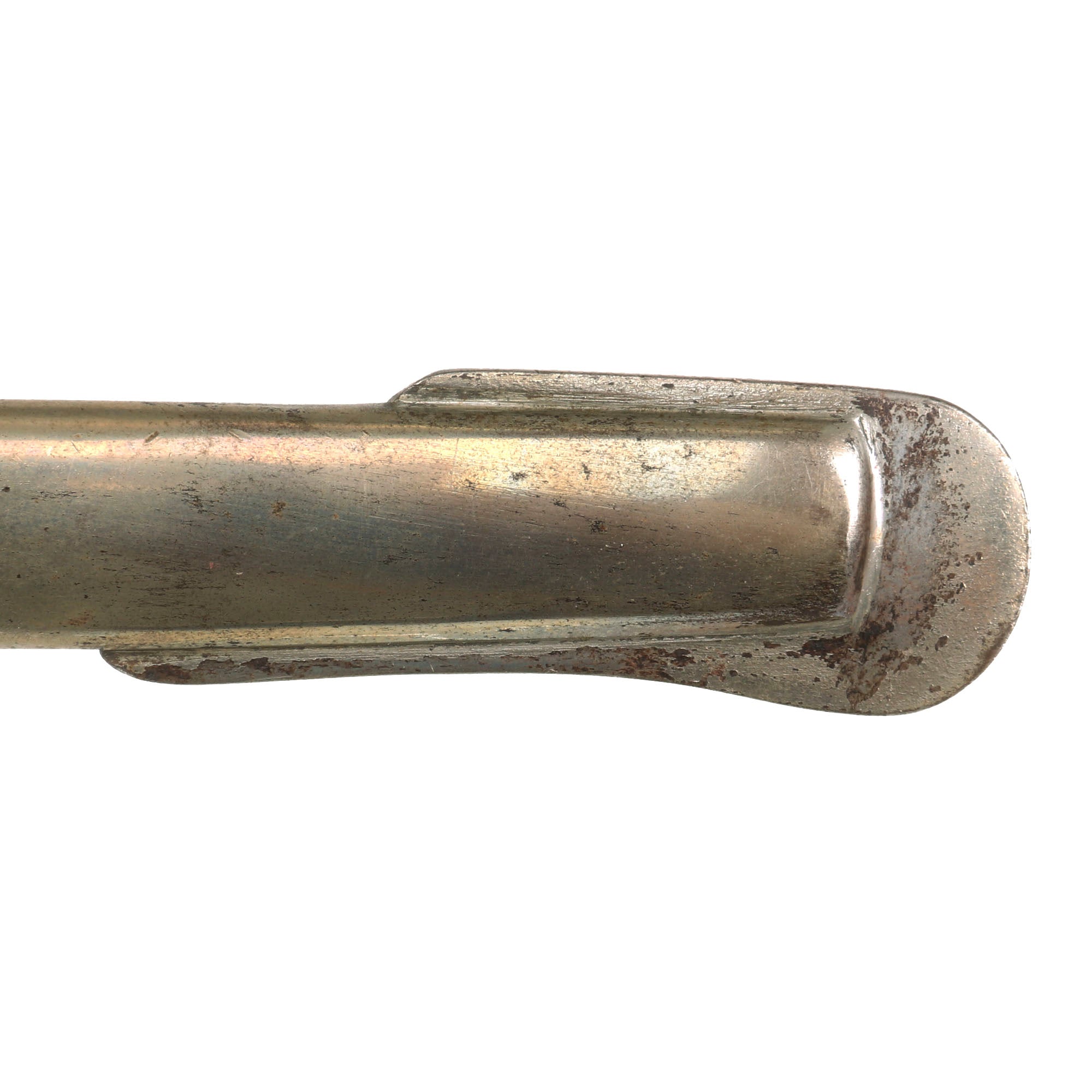 The nickel on the scabbard is partially intact, but shows wear and heavy oxidation spotting as well as a bit of finish flaking, which gives it a great worn look. There is denting on the sides of the scabbard, especially down near the drag, though this does not interfere with sheathing the blade at all. The top hanger ring is still present, though the finish is heavily worn.