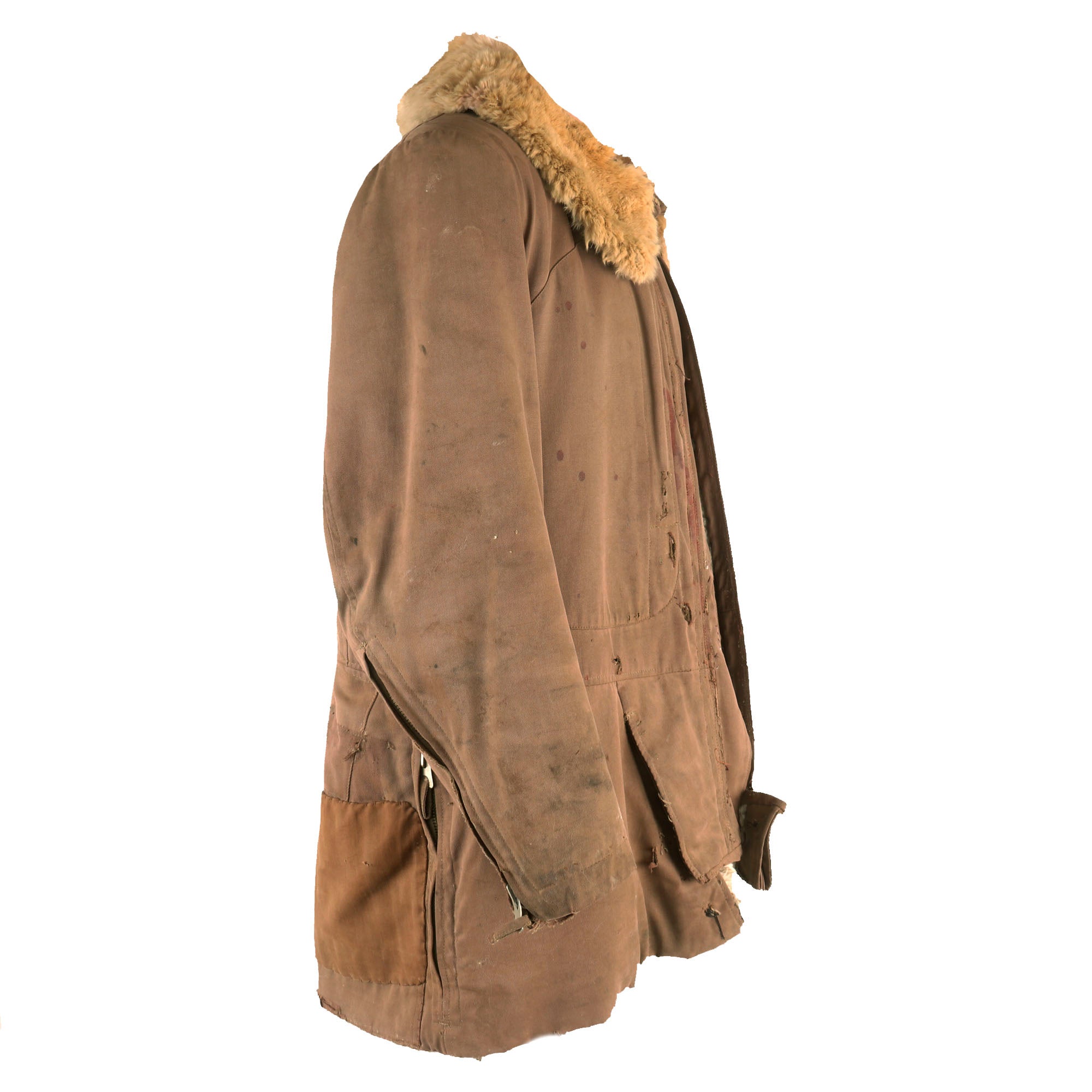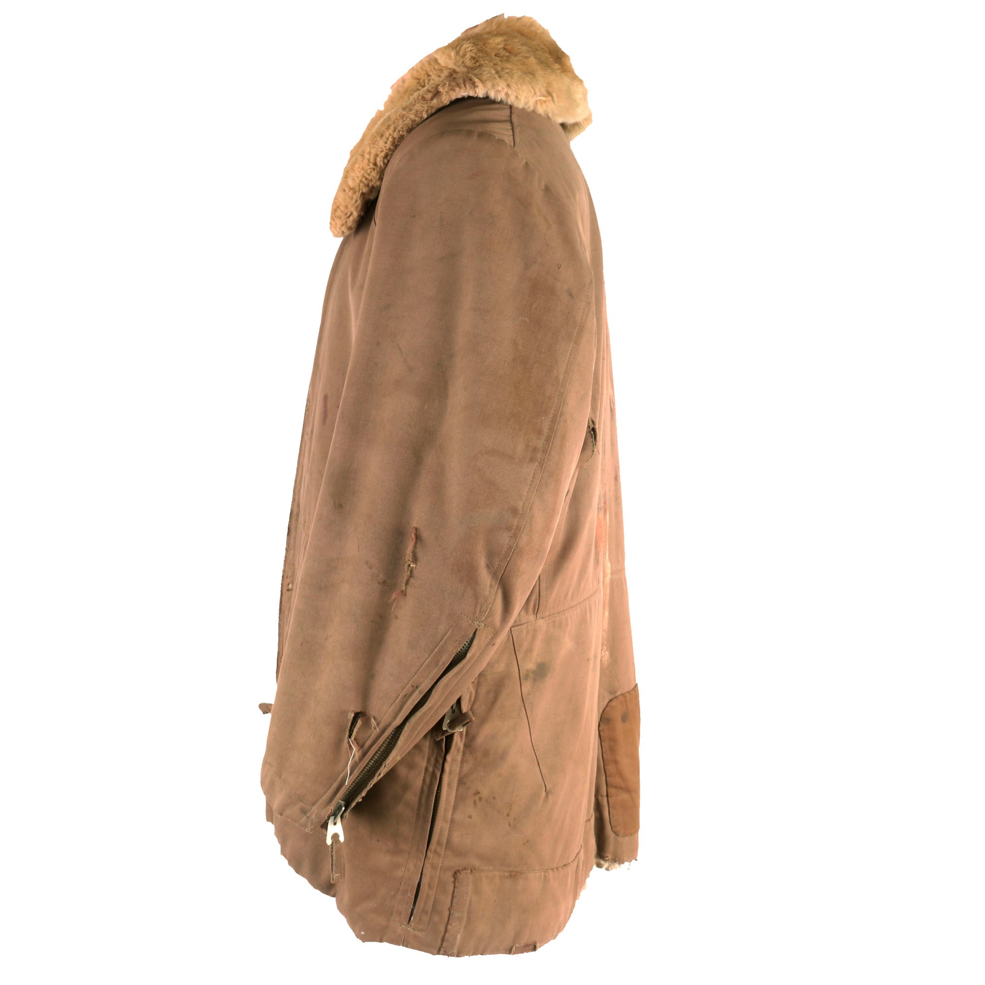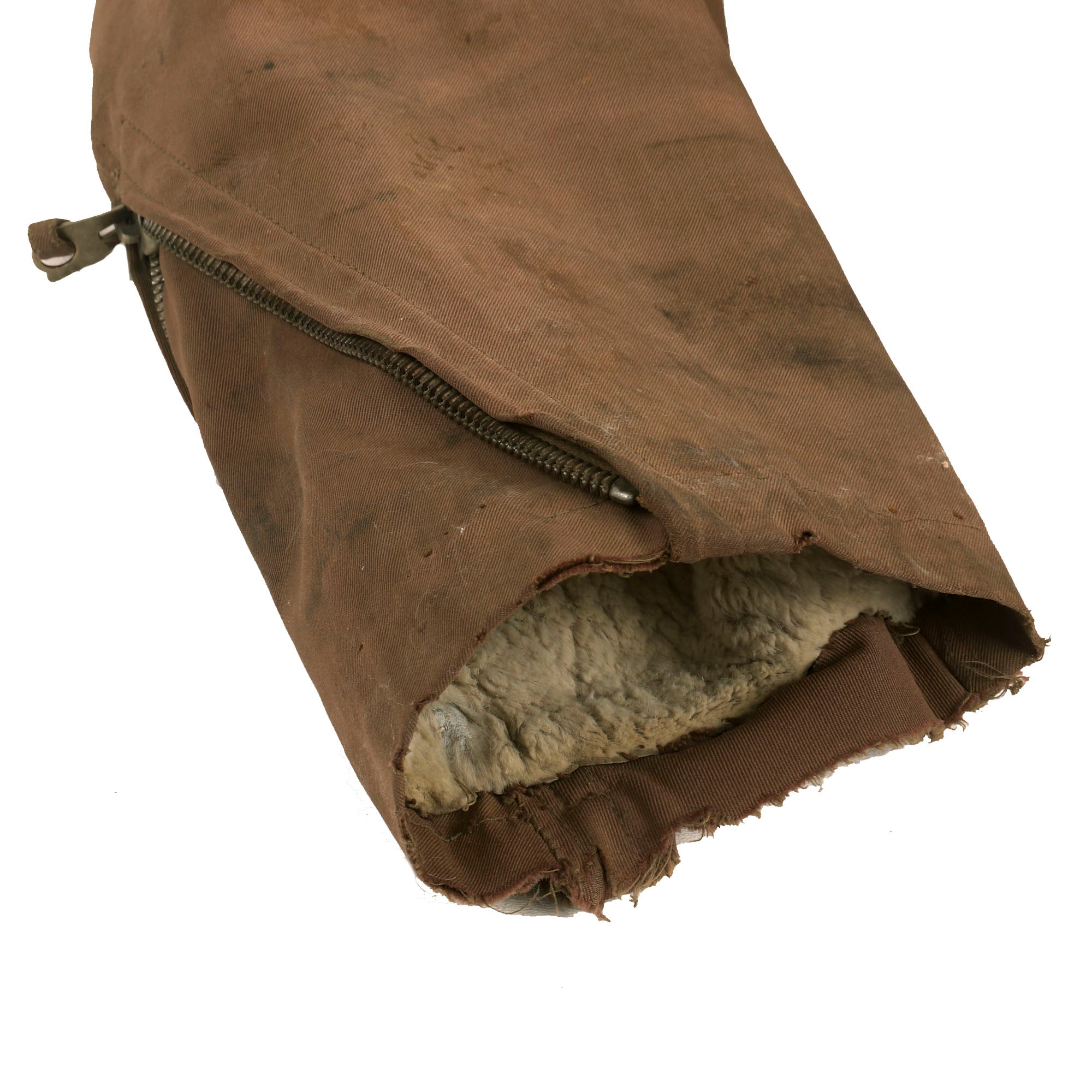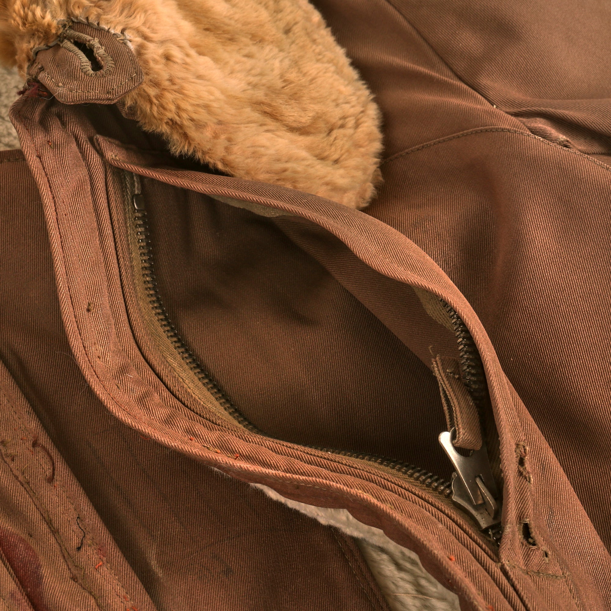 The jacket is tan with a large fur collar and white fur interior, with very faint depot stamps on the front flap of the jacket next to the zipper. There are several rips and tears across the uniform, along with a great deal of stitched areas, almost certainly done in the field or depot. The zippers on the cuffs and pockets are all functional, and bear no markings.