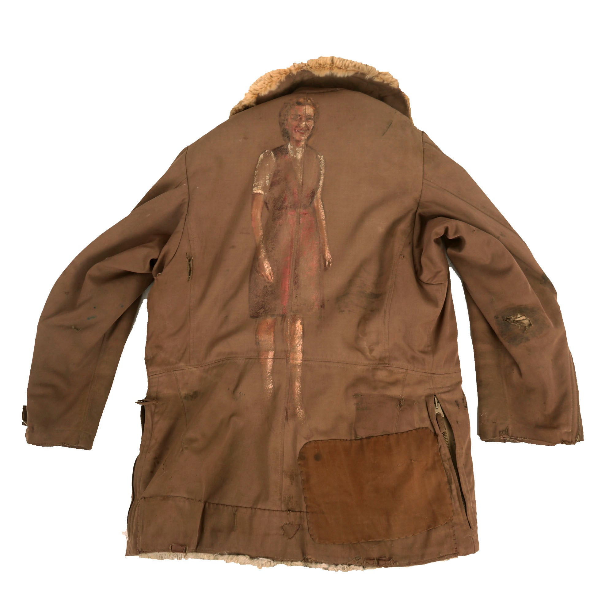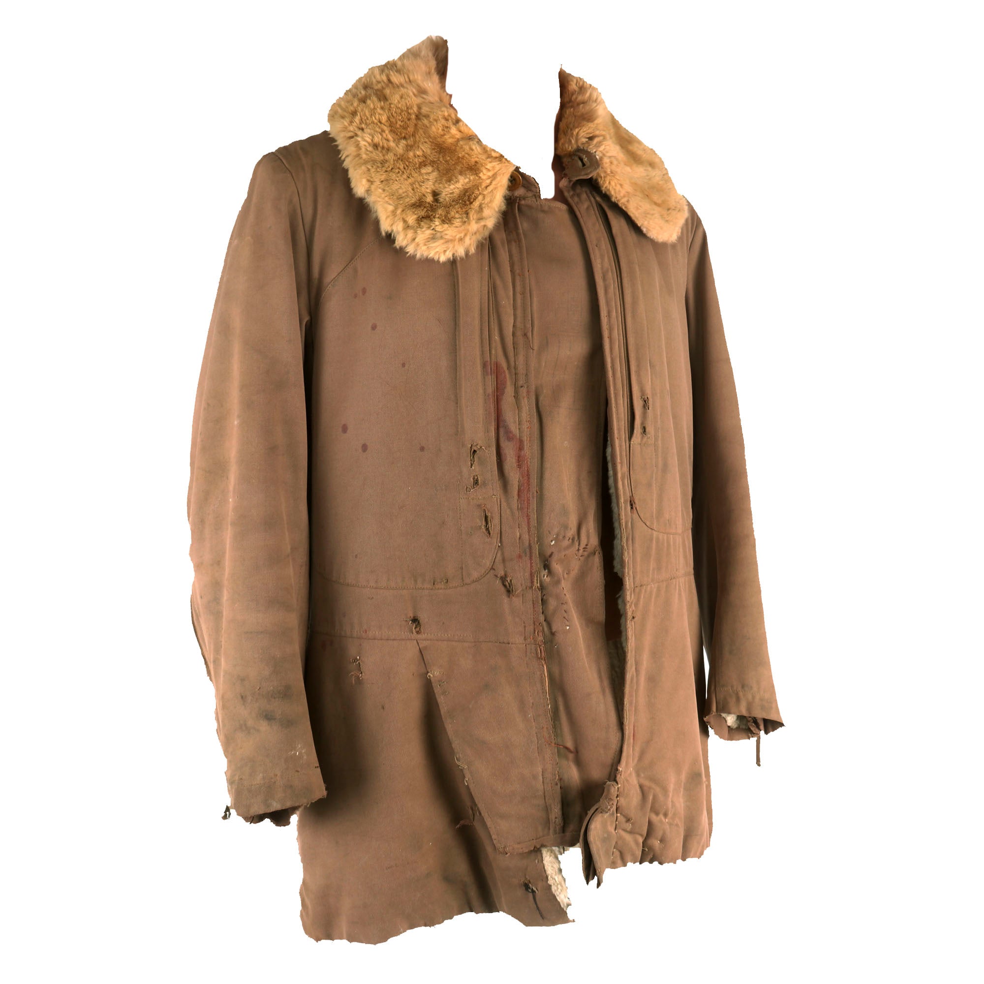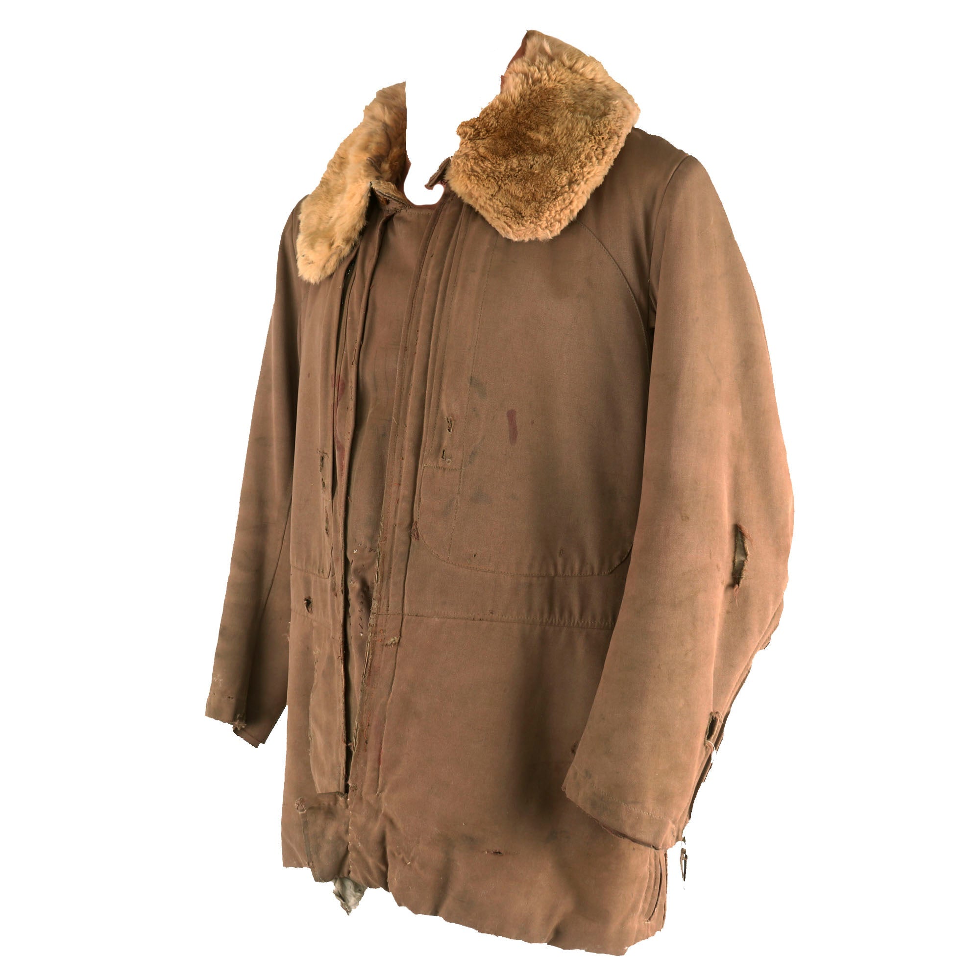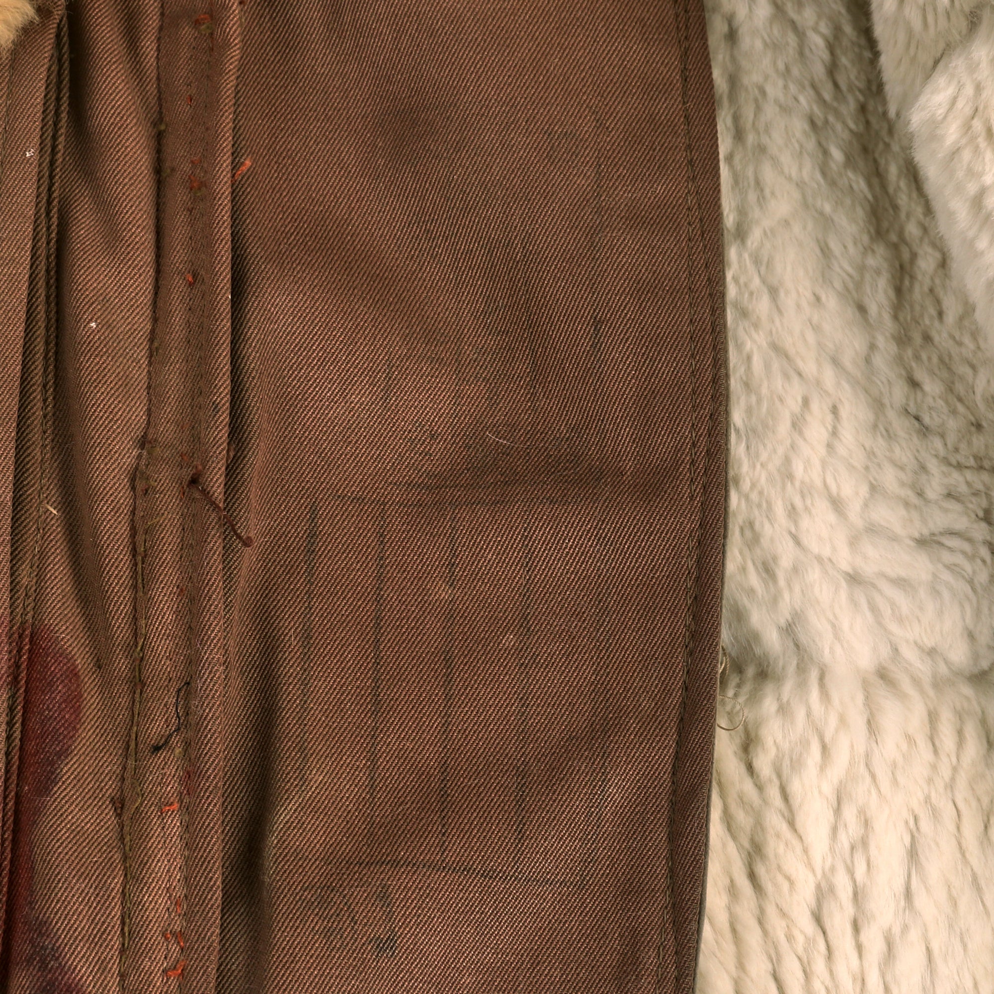 The jacket is tan with a large fur collar and white fur interior, with very faint depot stamps on the front flap of the jacket next to the zipper. There are several rips and tears across the uniform, along with a great deal of stitched areas, almost certainly done in the field or depot. The zippers on the cuffs and pockets are all functional, and bear no markings.