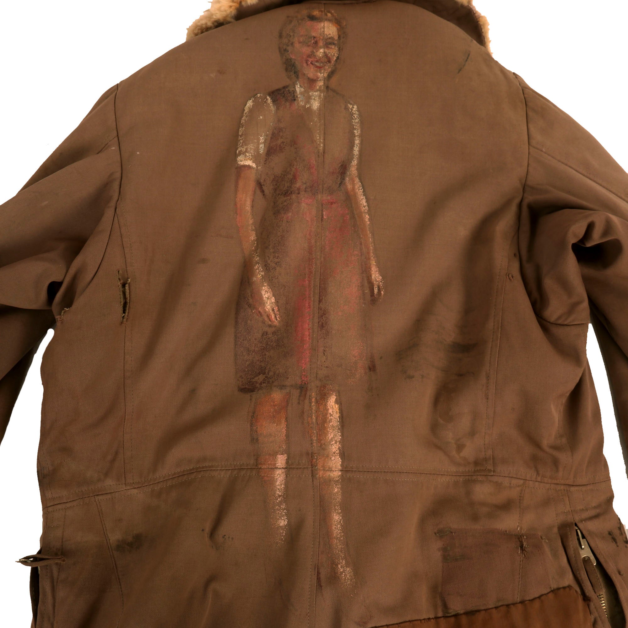 On the back of the jacket, there are obvious remains of a painting of an American woman, likely the soldier’s wife or mother, sent home to her as a souvenir. This is an outstanding and very unique piece, and the depot stamps really tie it all together with provenance. The buttons under the collar are all retained, and the hanging loop is still fully intact. Overall a fine-condition Japanese bomber jacket brought or sent home by an American GI. Ready for further research and display.