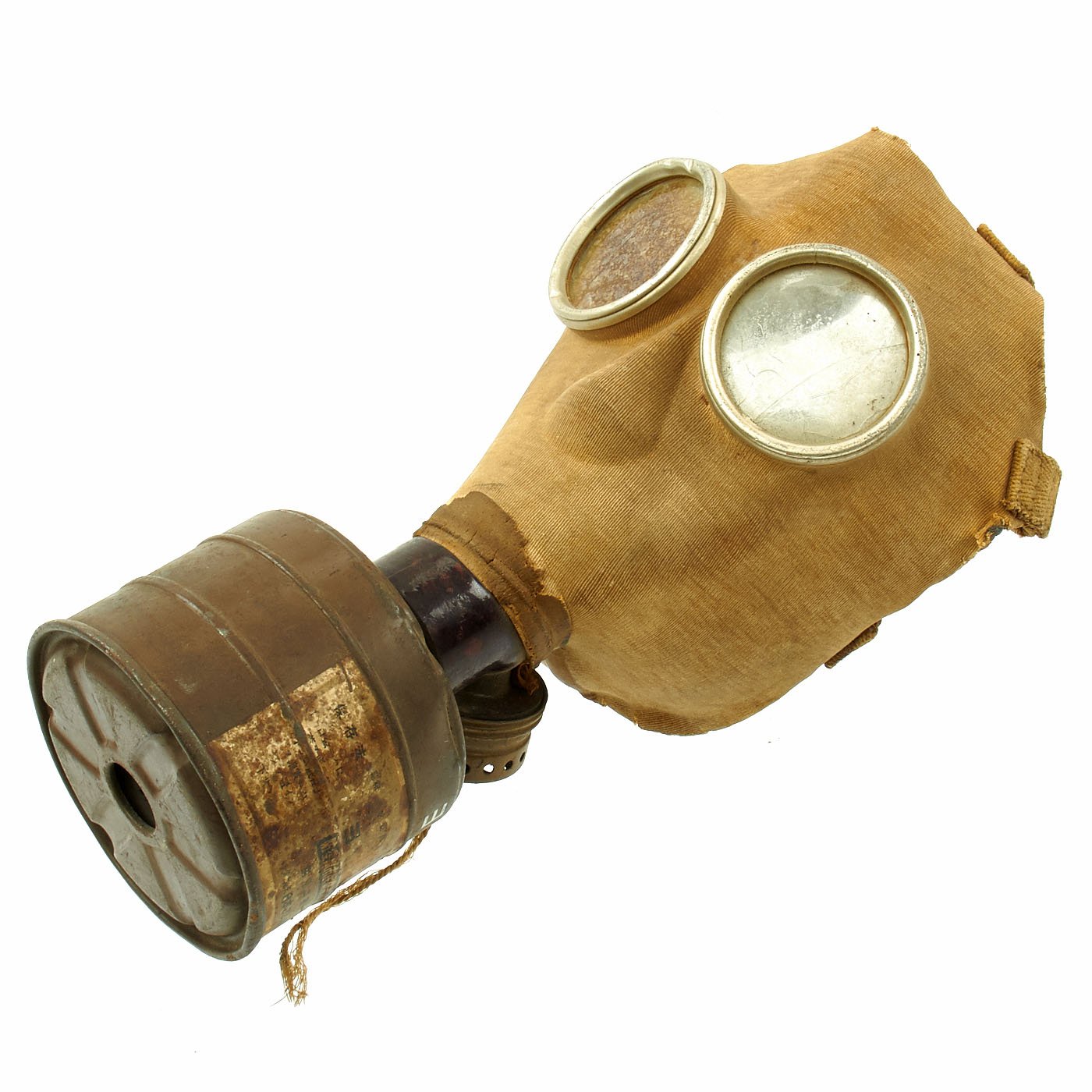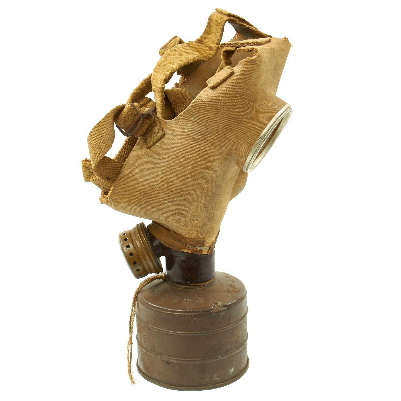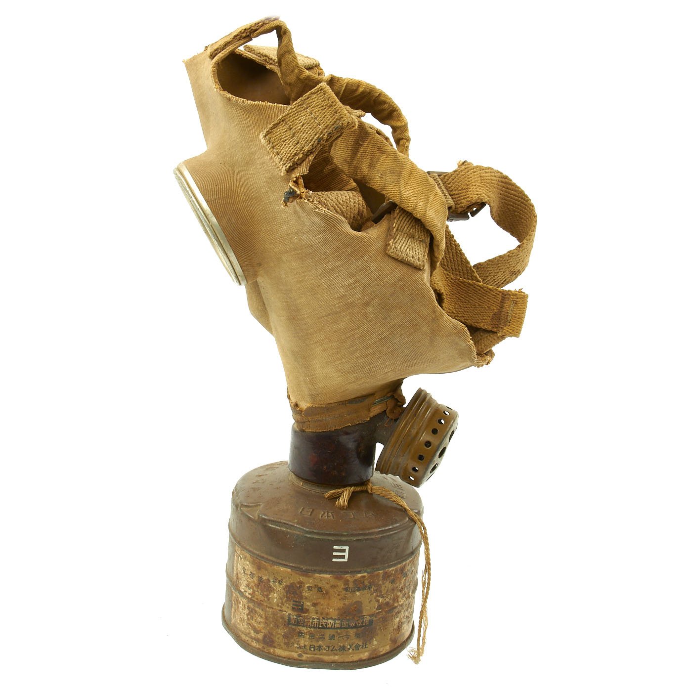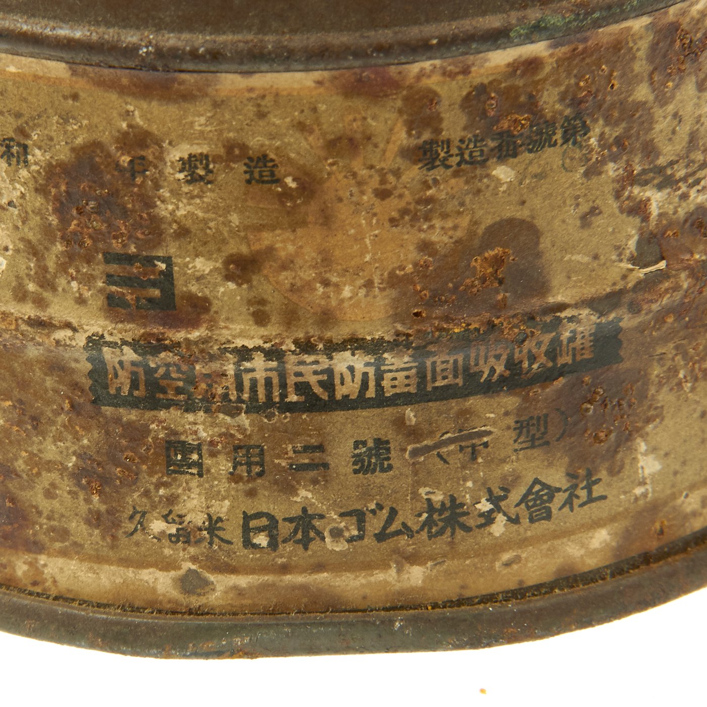 Original Item: Only One Available. This is a very good condition genuine WWII issue Japanese rubberized face mask, with metal rimmed clear lenses. The filter can has wonderful paper label with instructions still attached. It is a bit faded, so the "Rising Sun" is very faint, and due to oxidation and wear not all of the characters are visible anymore. There are also markings stamped into the top of the can, one of which is 昭 和 1 7, for the 17th year of the Showa era, or 1942. There is also a maker mark