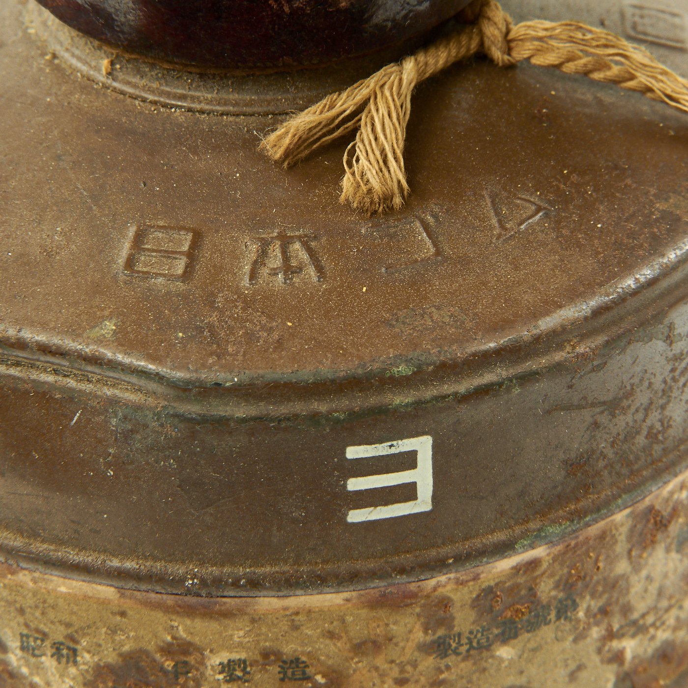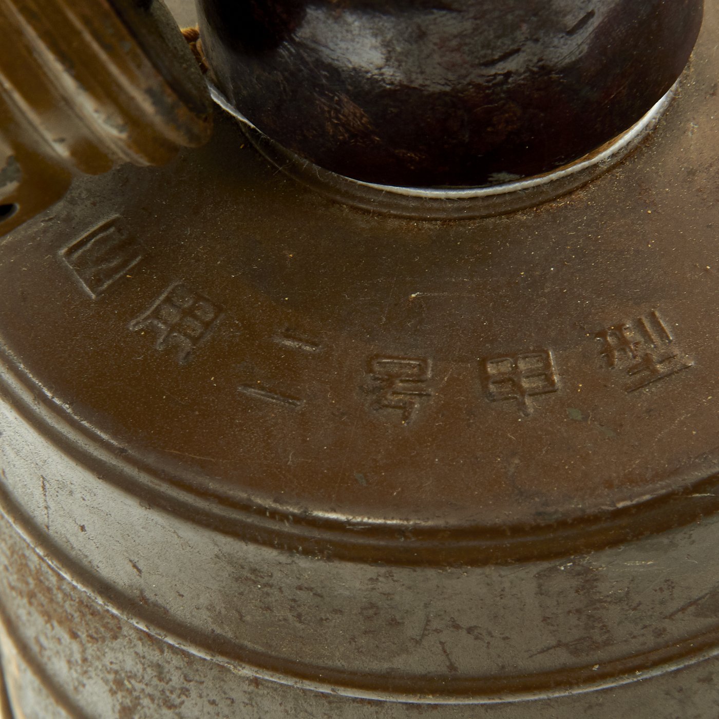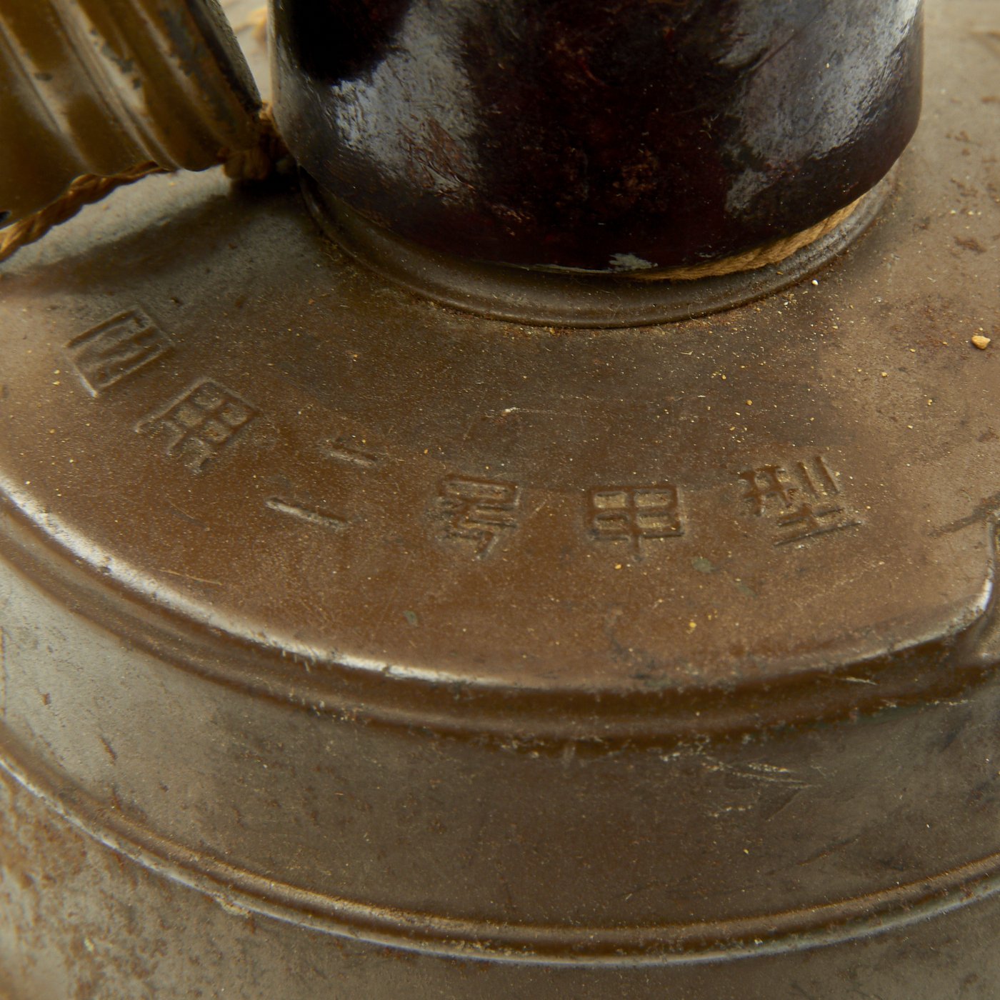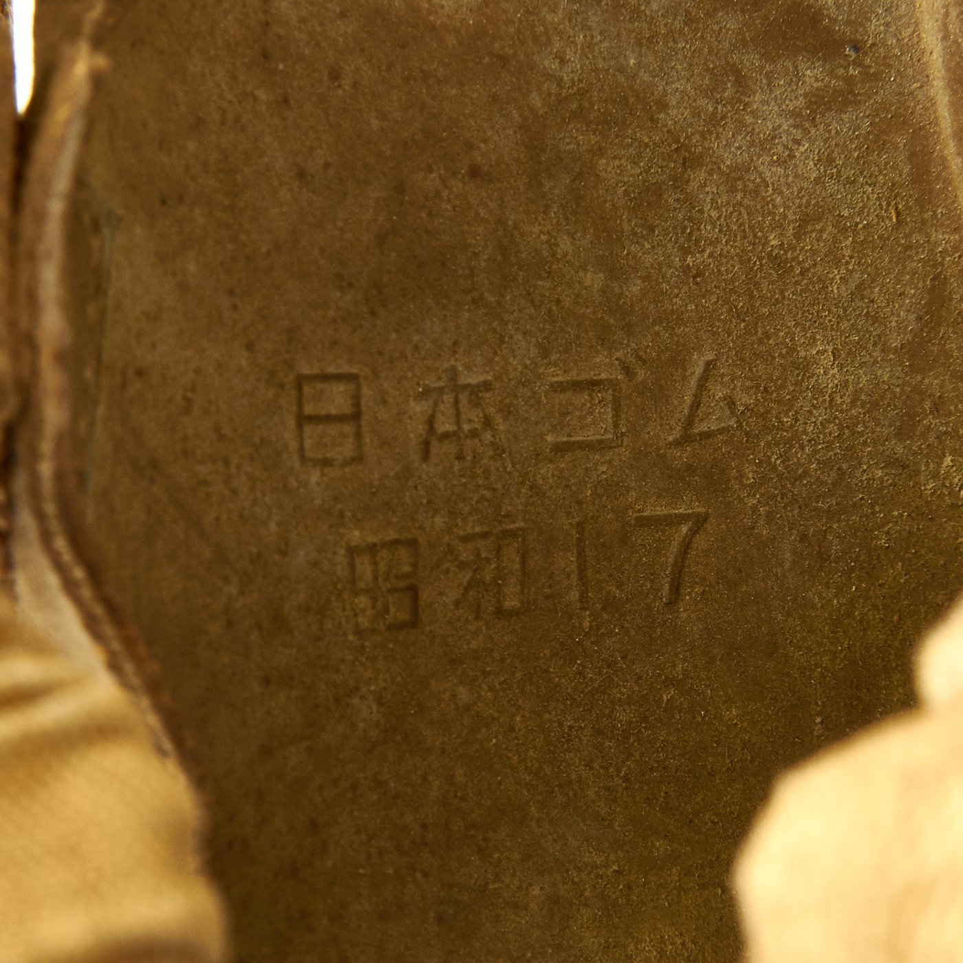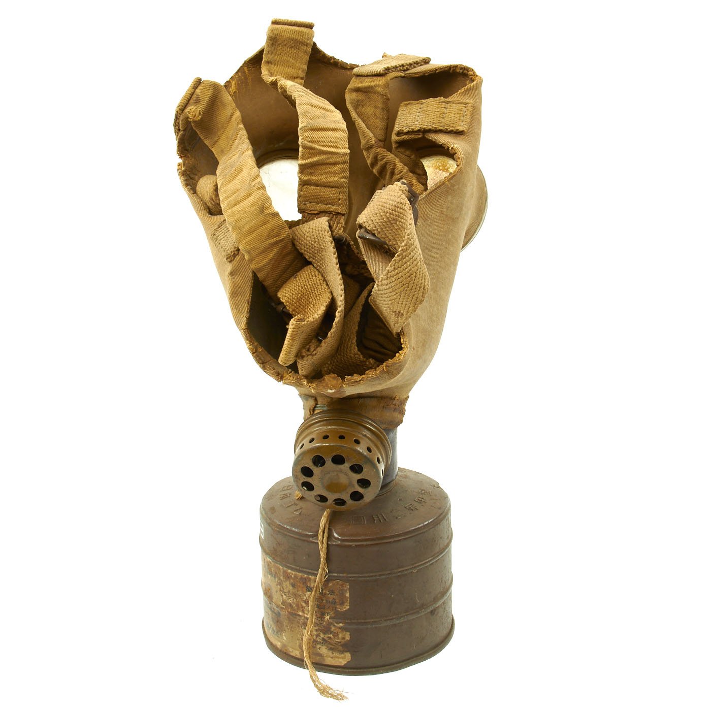 Original Item: Only One Available. This is a very good condition genuine WWII issue Japanese rubberized face mask, with metal rimmed clear lenses. The filter can has wonderful paper label with instructions still attached. It is a bit faded, so the "Rising Sun" is very faint, and due to oxidation and wear not all of the characters are visible anymore. There are also markings stamped into the top of the can, one of which is 昭 和 1 7, for the 17th year of the Showa era, or 1942. There is also a maker mark