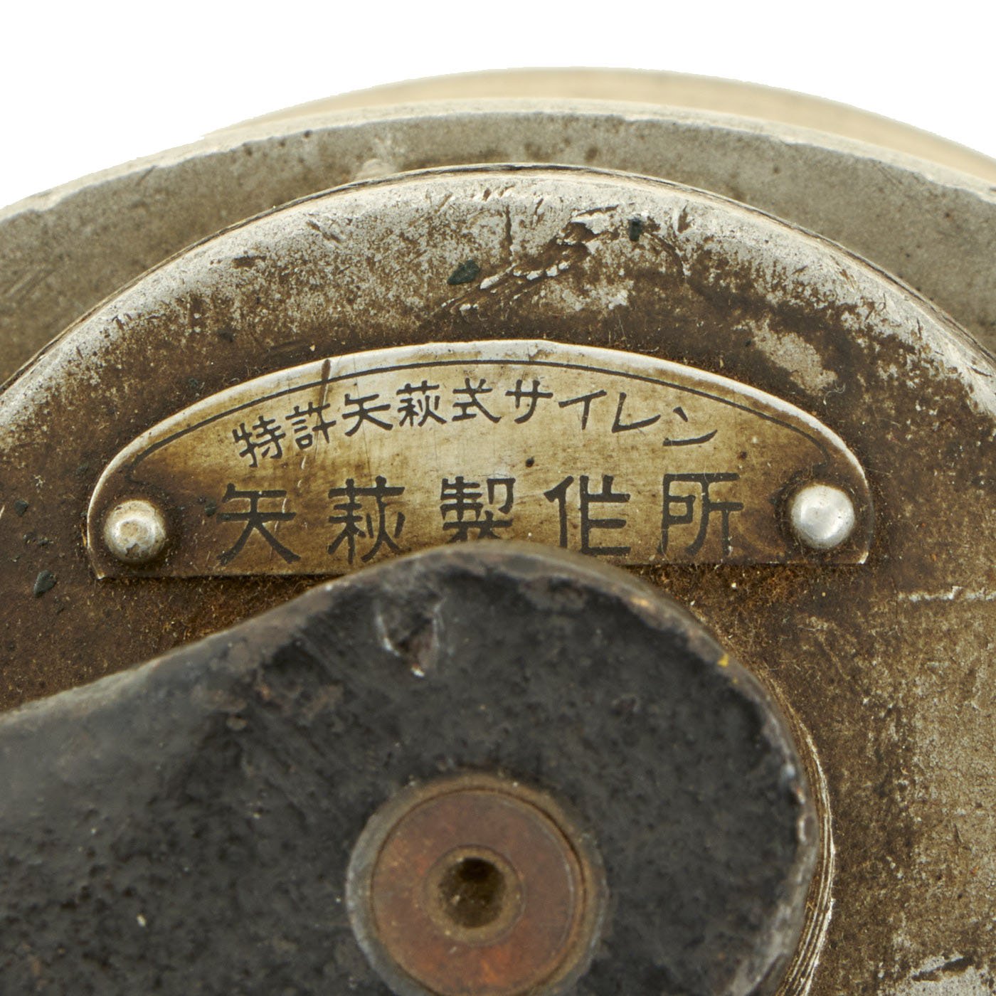 This reads "Yahagi Type SAIREN", which partly uses the Japanese Katakana phonetic alphabet. "Sairen" of course means that it is a Siren, and it works exactly as it should. The second line of the data plate indicates that it was produced by the Yahagi company itself, as many were made by contractors as well. The crank is fully operational, spinning the internal rotor, and there is a lever to adjust the damper, though it had lost the spring to return it to "closed", so it must be moved manually.