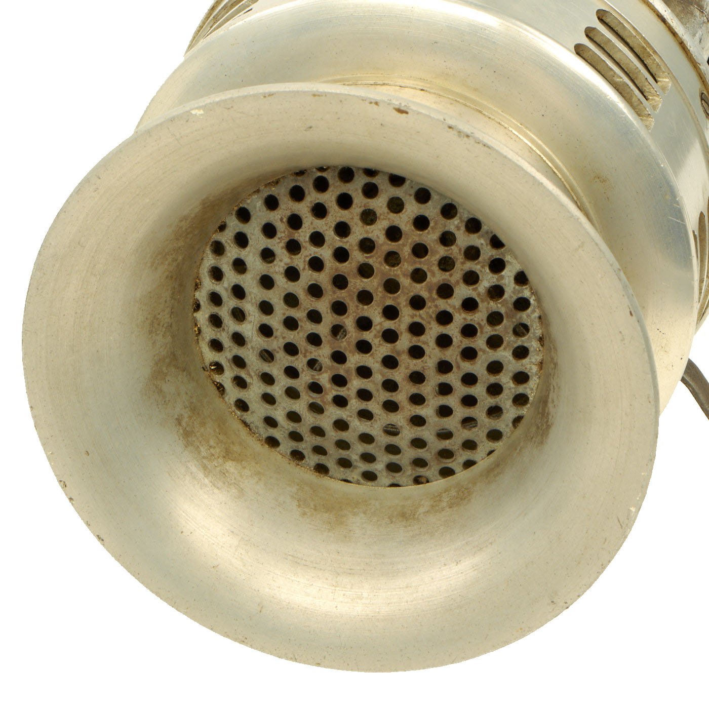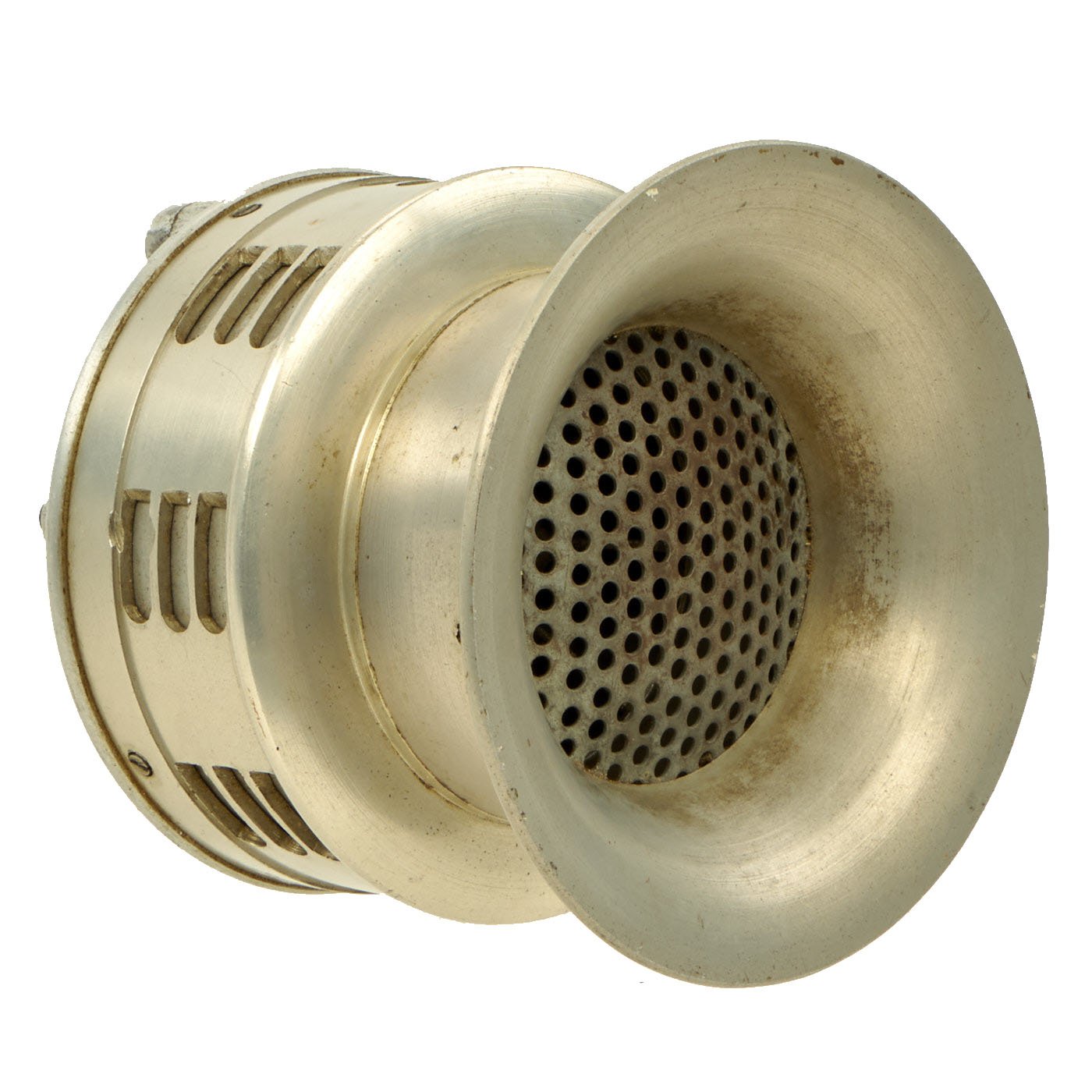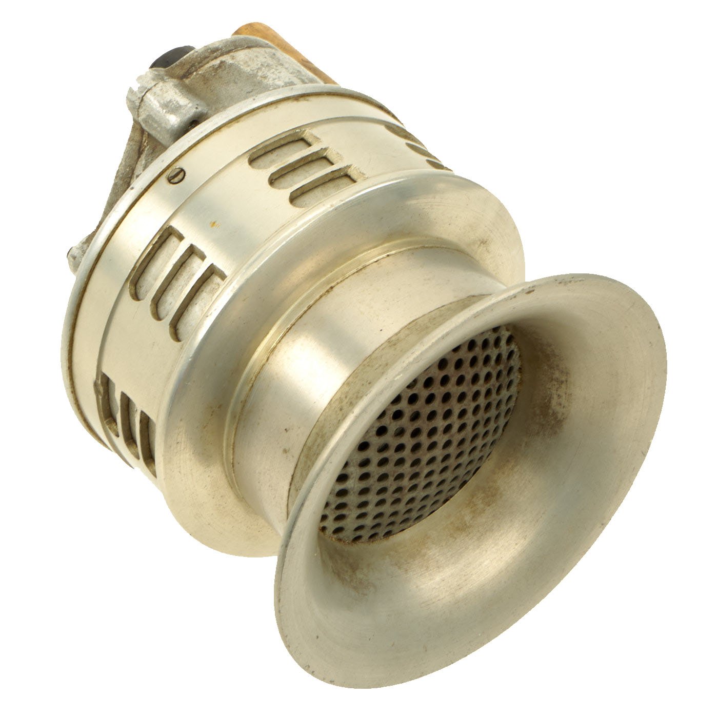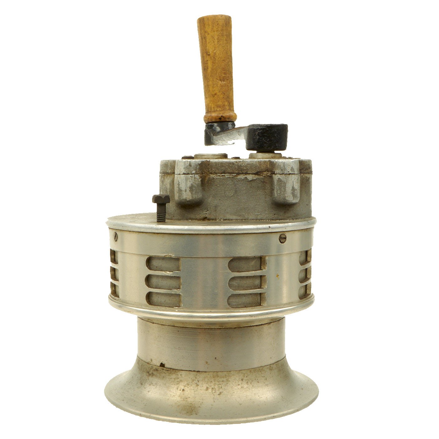 Original Item: Only One Available. This is a rare functional Japanese WWII hand-cranked air raid siren, which would usually be attached to some sort of stand. There are two bolts on the rear for attaching to a mount, but no mount is included. It is definitely larger than the hand held type, and has a large nozzle on the front to help with sound projection. It looks to be made mostly of what appears to be aluminum, or some other non ferrous alloy. There is a slightly oxidized patina on the outside, giving it a great look.
