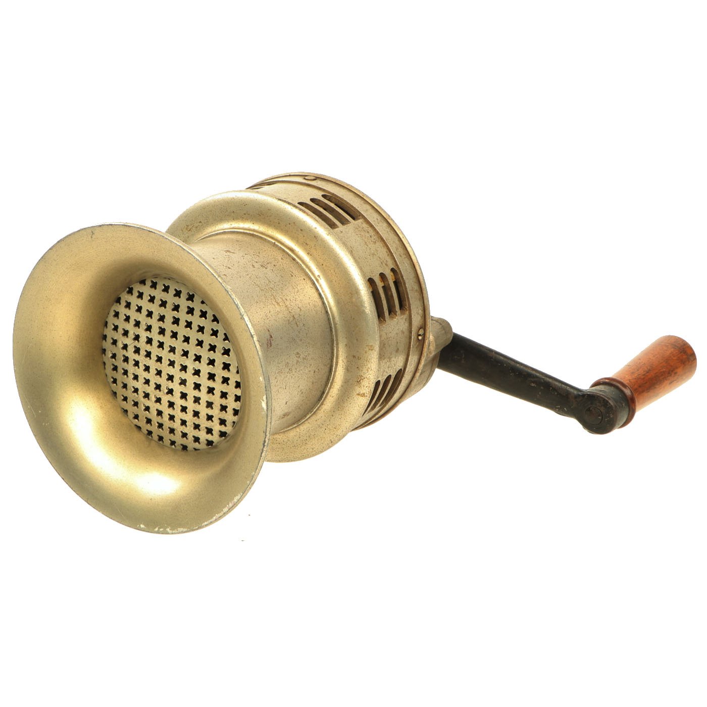Original Item: Only One Available. This is a rare fully functional Japanese WWII hand-cranked air raid siren, which would usually be attached to some sort of stand. There are two bolts on the rear for attaching to a mount, but no mount is included. It is definitely larger than the hand held type, and has a large nozzle on the front to help with sound projection. It looks to be made mostly of what appears to be aluminum, or some other non ferrous alloy. There is a slightly oxidized patina on the outside, giving it a great look.