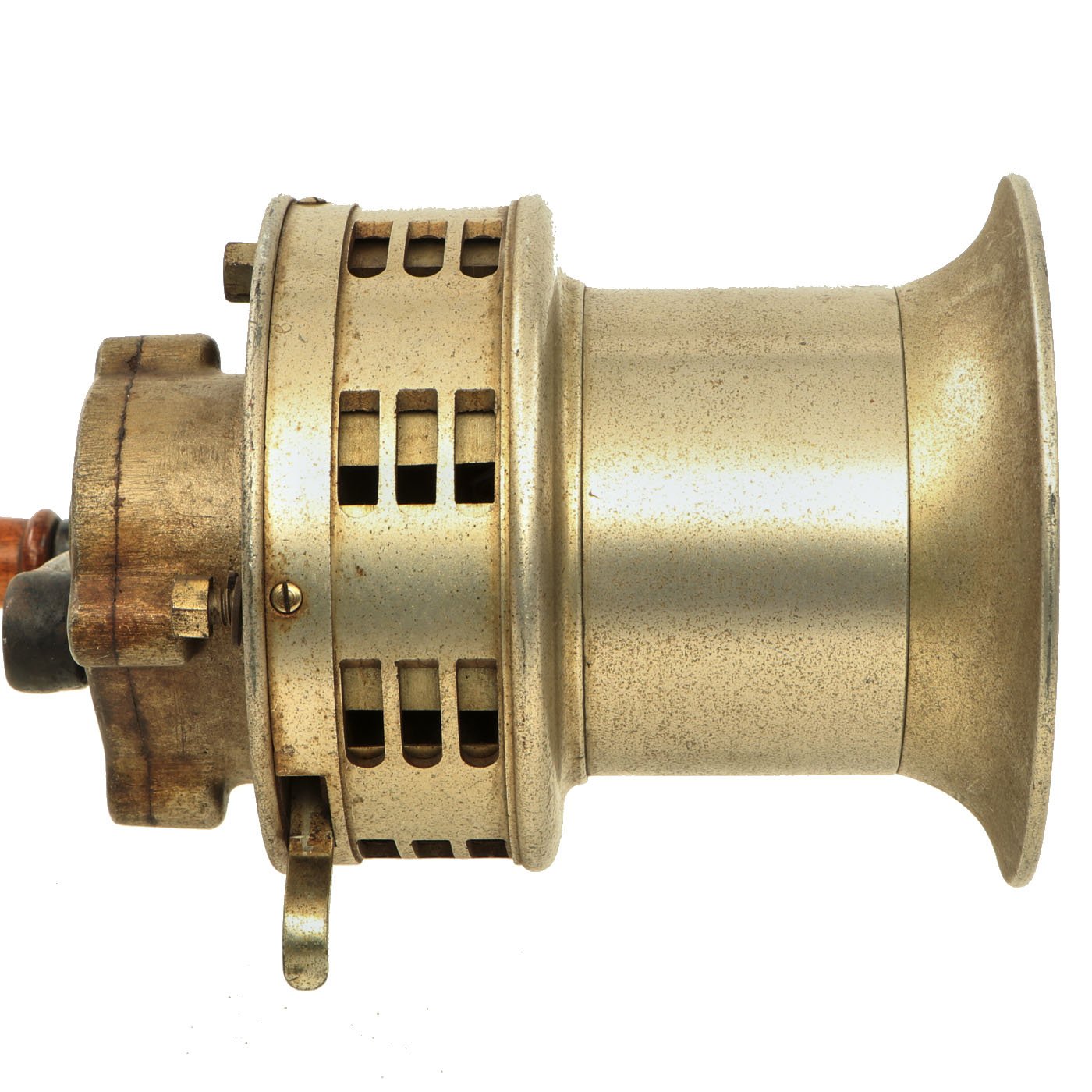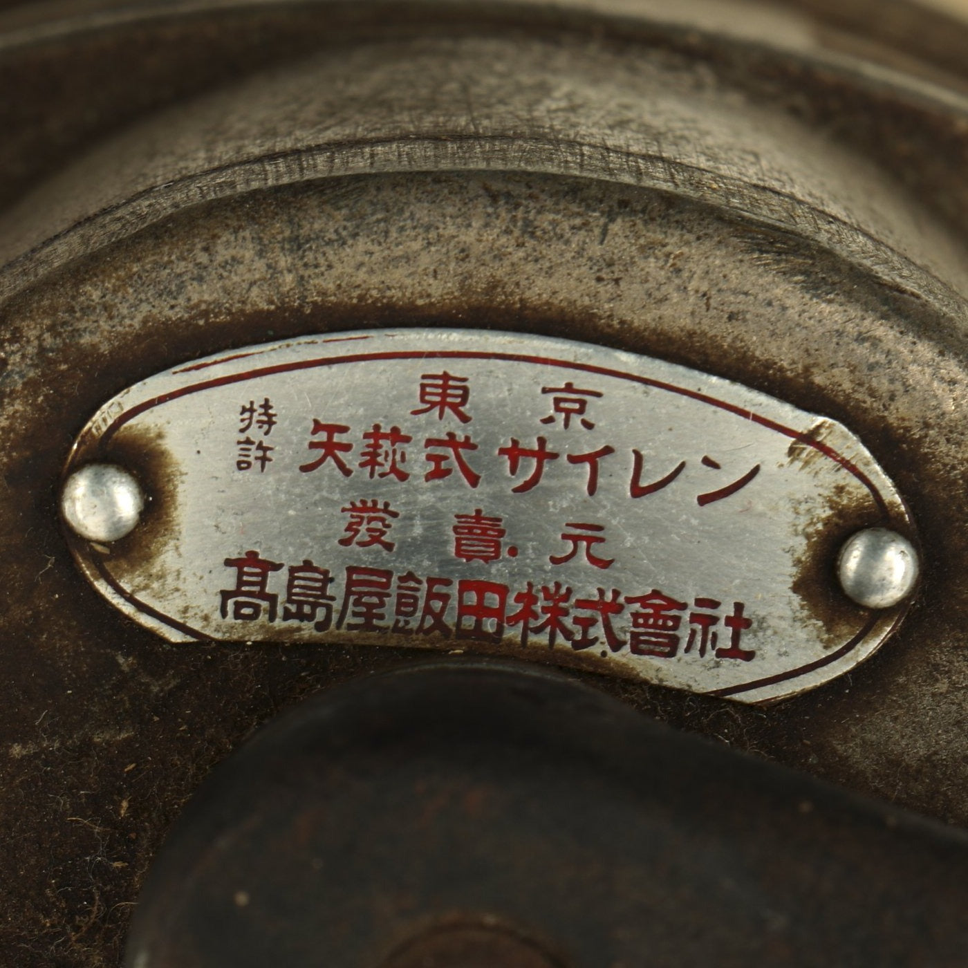 The top line are the characters for the city "Tokyo", the capital of modern Japan, and the second line reads "Yahagi Type SAIREN", which partly uses the Japanese Katakana phonetic alphabet. "Sairen" of course means that it is a Siren, and it works exactly as it should. The crank is fully operational, spinning the internal rotor, and there is a spring loaded lever to adjust the damper, though it sticks a bit when returning to the open position.
