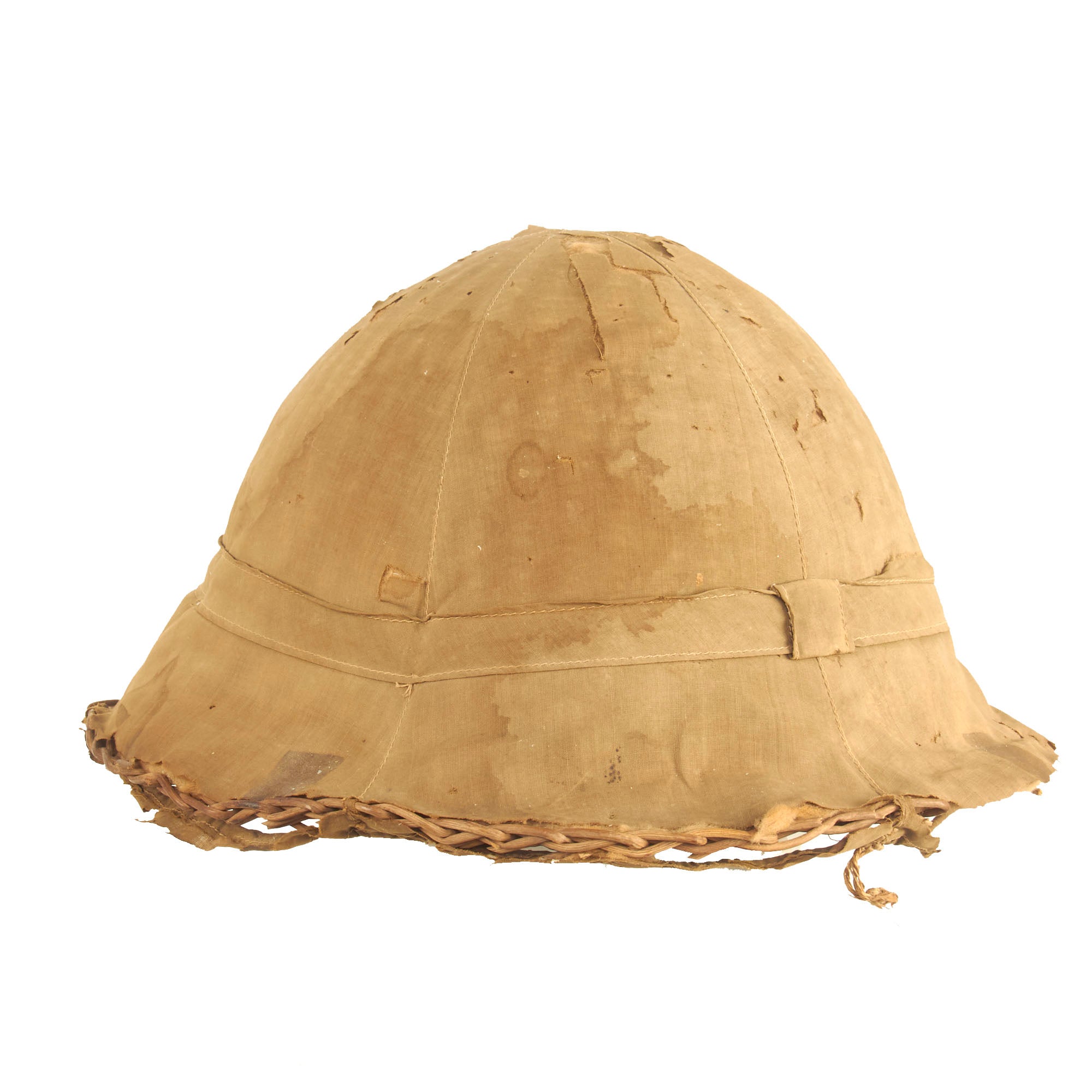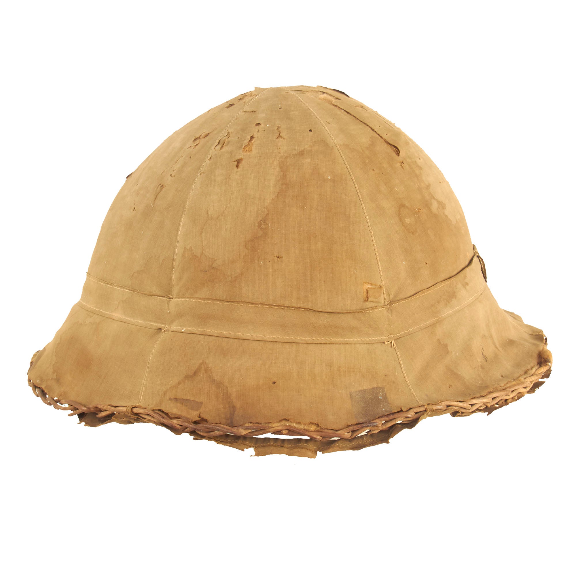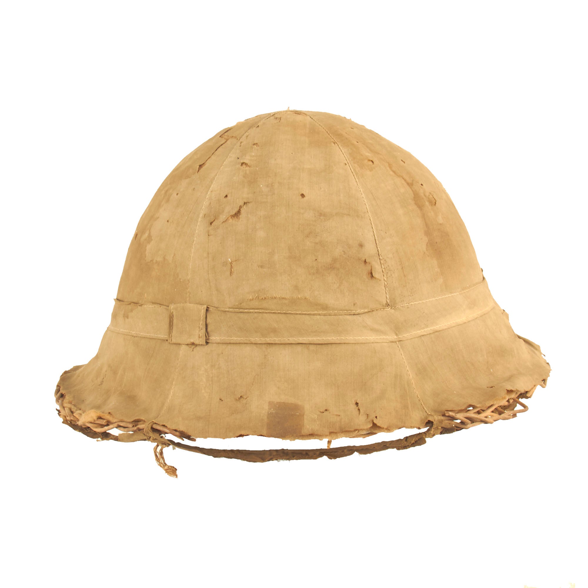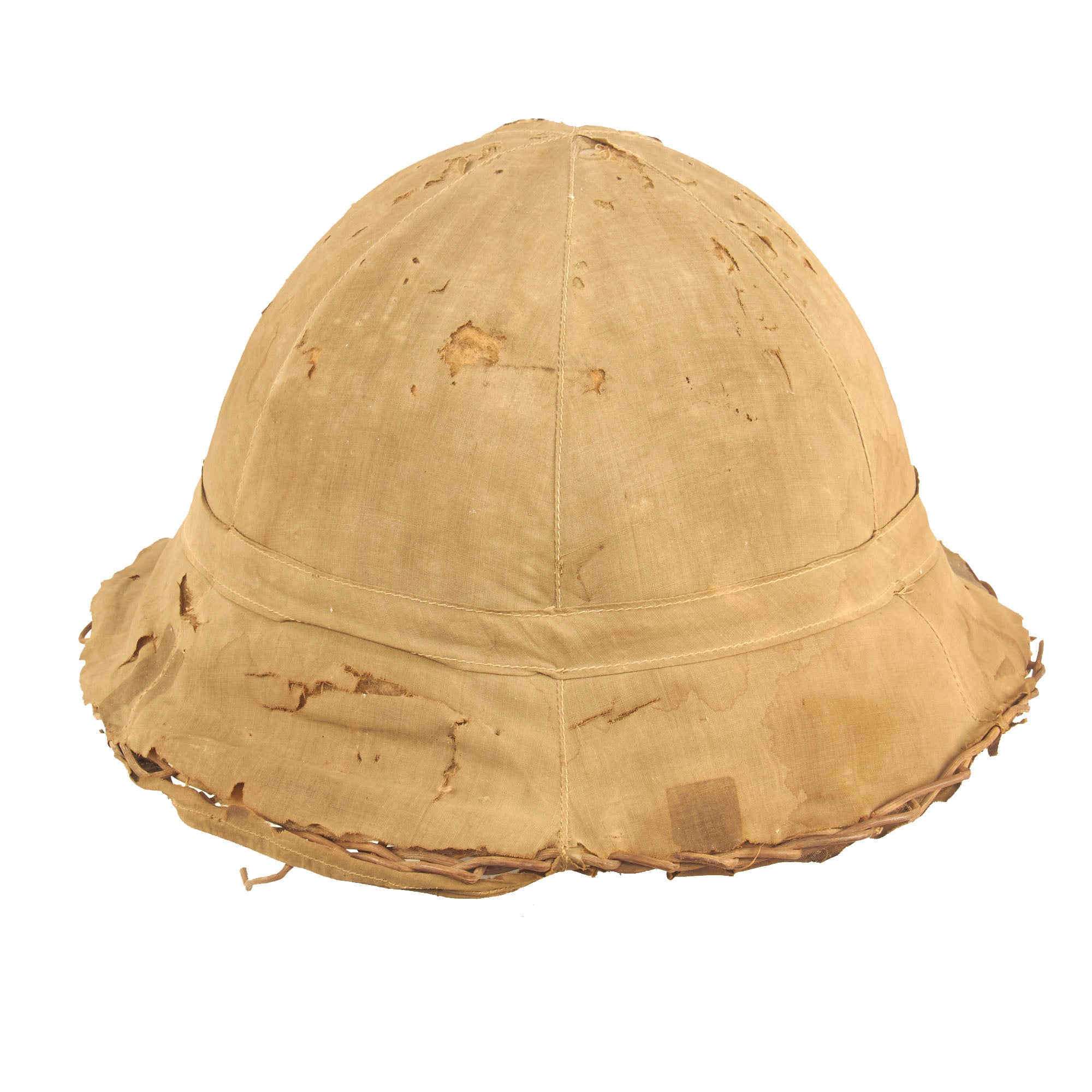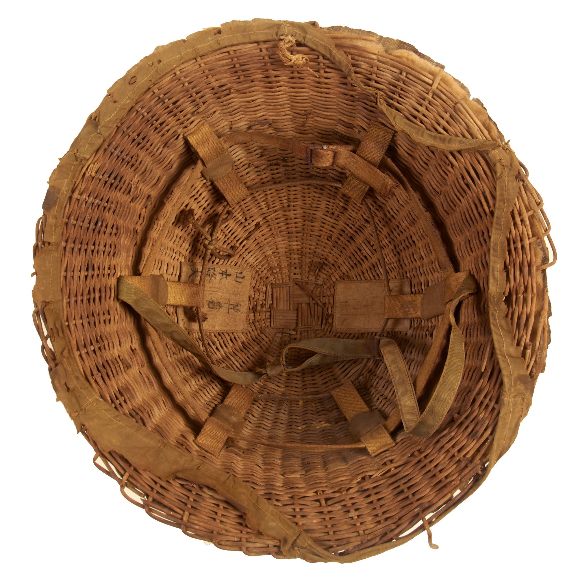 Original Item: Only One Available. Now this is a somewhat rare Imperial Japanese Army sun helmet and the first we have had the pleasure of offering. This helmet is a little worse for wear but was not intended to have the same “shelf life” as the regular massed produced Type 98 “Sun Pith Helmets”. This one does show the perfect amount of service use and wear with a solid suspension system as well as chinstrap. There are faded labels on the interior which is correctly attached directly to the “wicker”. The exterior features the same khaki cloth on the Type 98s and is padded slightly underneath with wool.