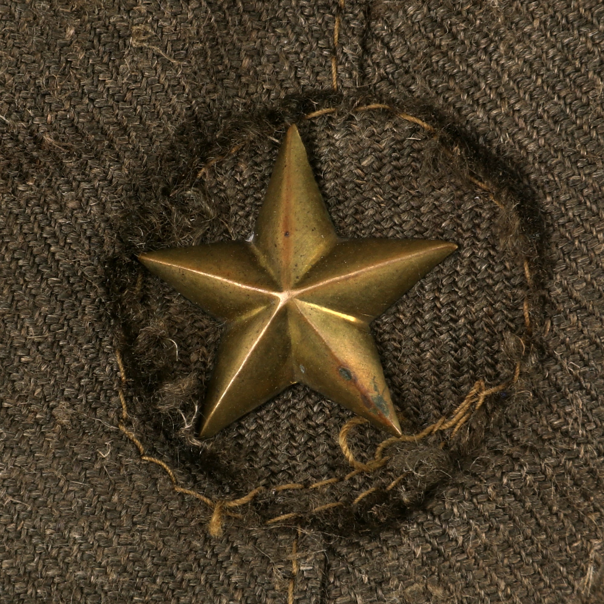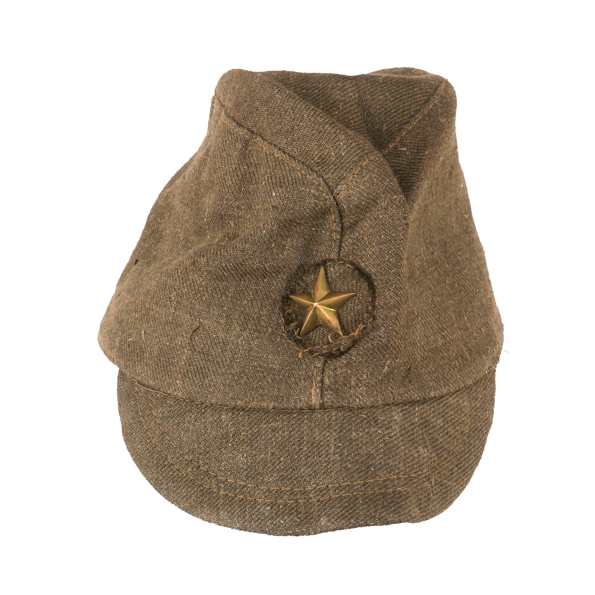 The front features a lovely metal five-pointed imperial Japanese star cap badge on a background the same color as the cap. The chinstrap is missing on this example. The sweatband has quite a bit of cracking to it and has degraded from wear and time. There are no markings on the interior besides what looks like a 4.