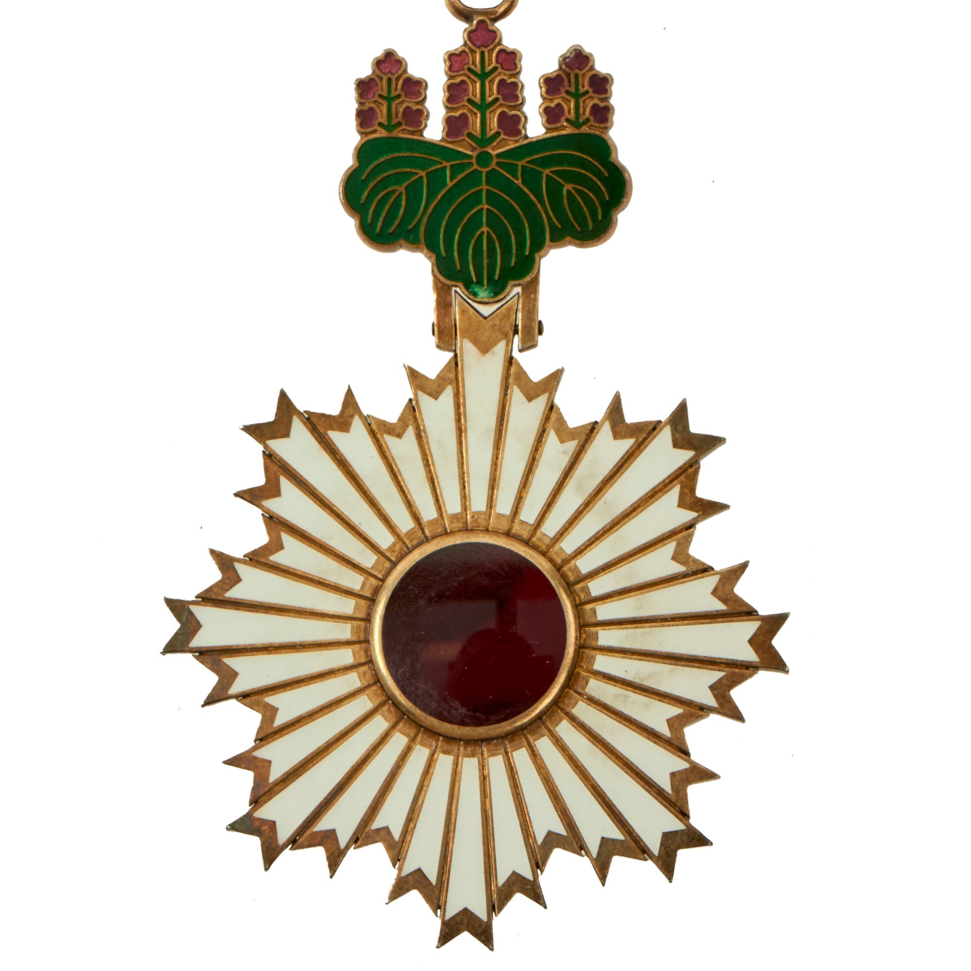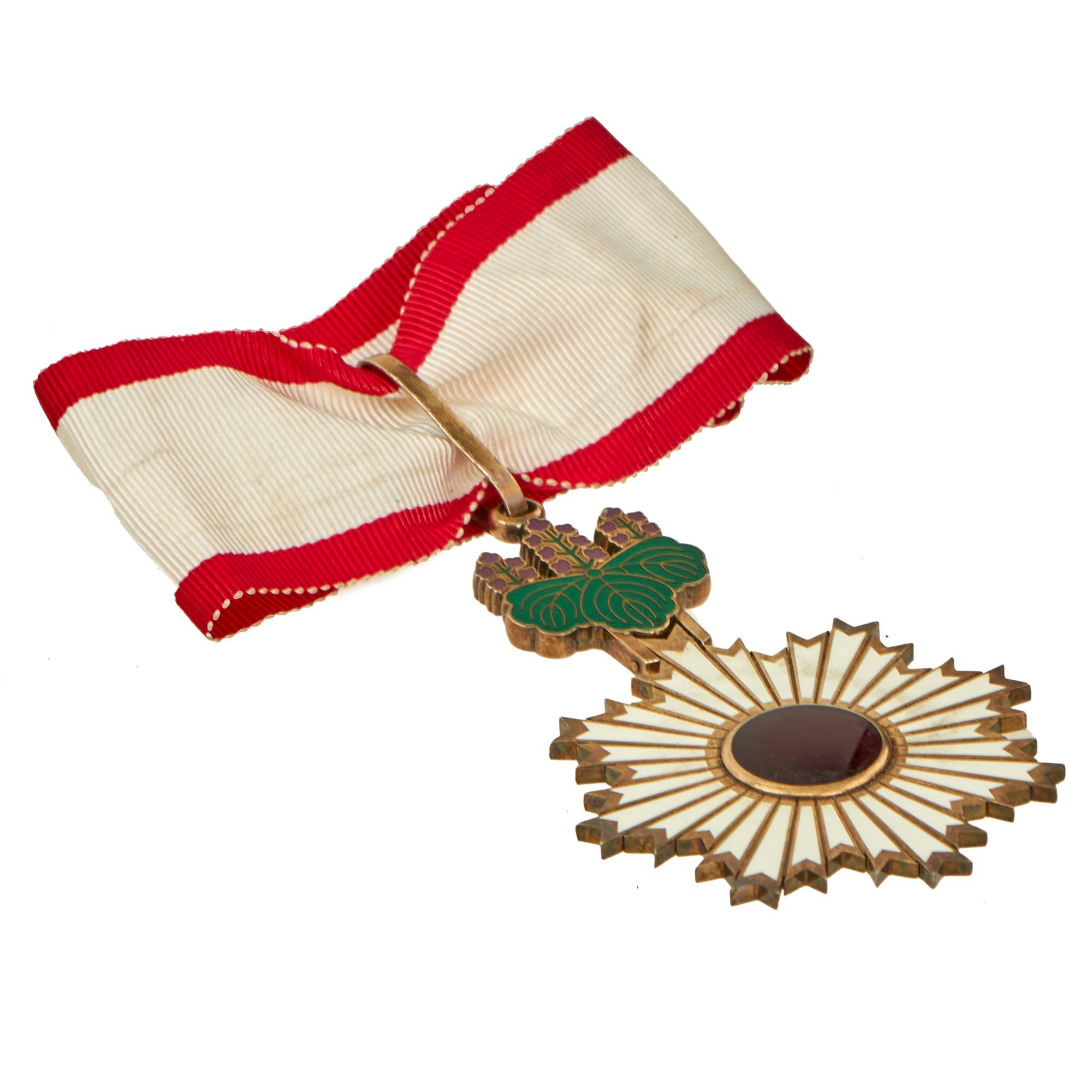 Original Item. Only One Available. The Order of the Rising Sun (旭日章, Kyokujitsu-shō) is a Japanese order, established in 1875 by Emperor Meiji. The Order was the first national decoration awarded by the Japanese government, created on 10 April 1875 by decree of the Council of State. The badge features rays of sunlight from the rising sun. The design of the Rising Sun symbolizes energy as powerful as the rising sun in parallel with the "rising sun" concept of Japan ("Land of the Rising Sun").