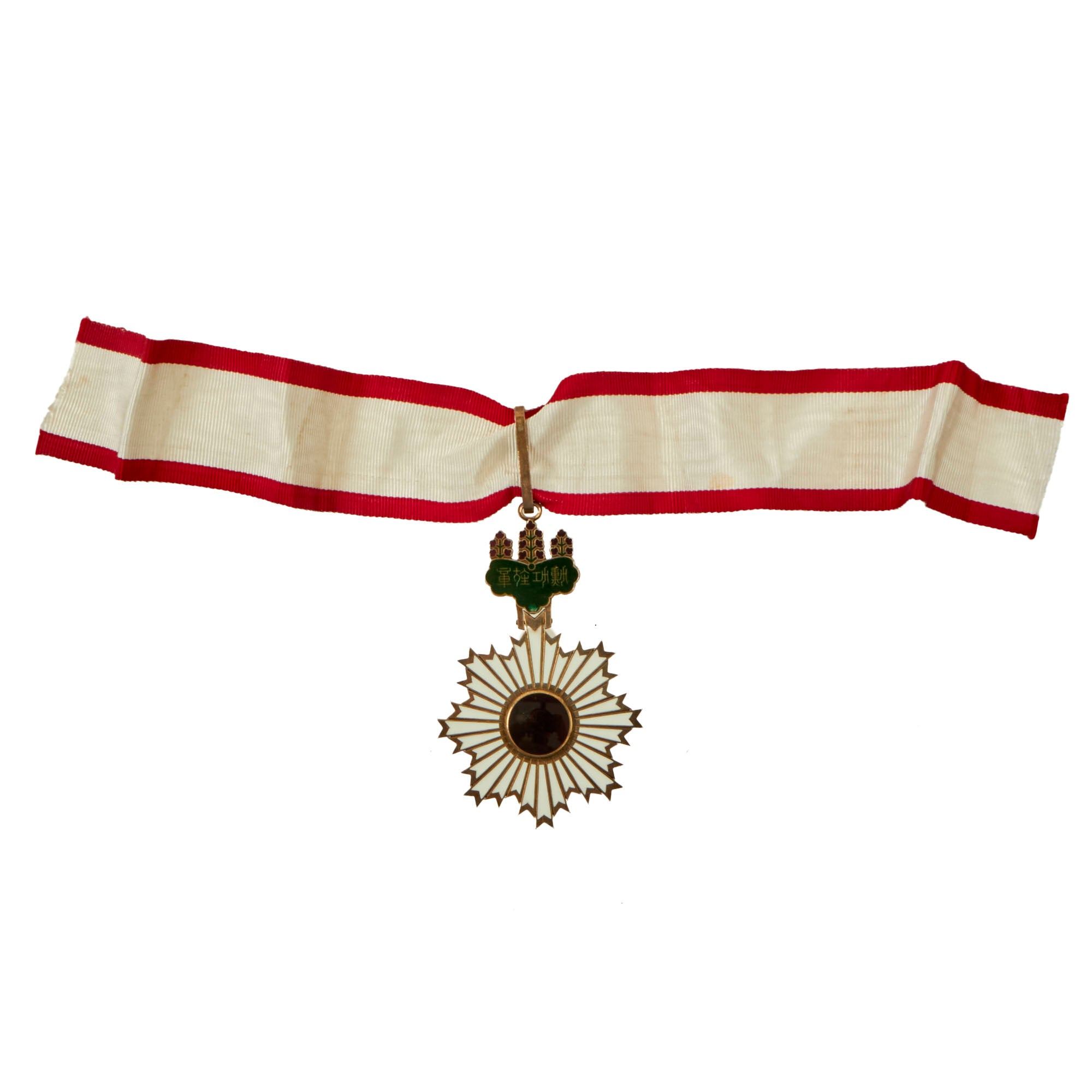 This is a phenomenal example of the 3rd Class Order of the Rising Sun, which is a neck order. The order is in fantastic condition with the enamel very well-retained. The 3rd Class has Gold Rays with a Neck Ribbon.