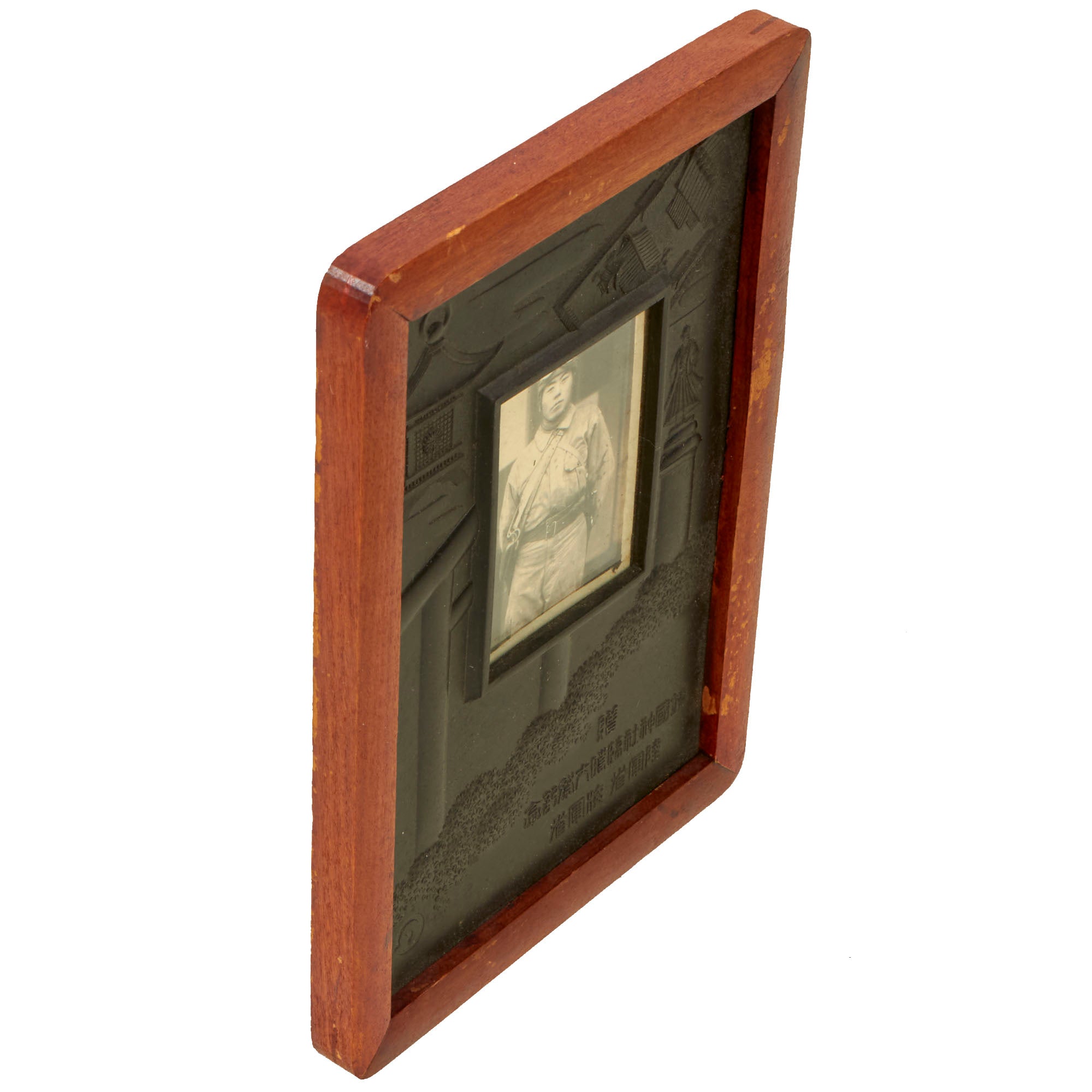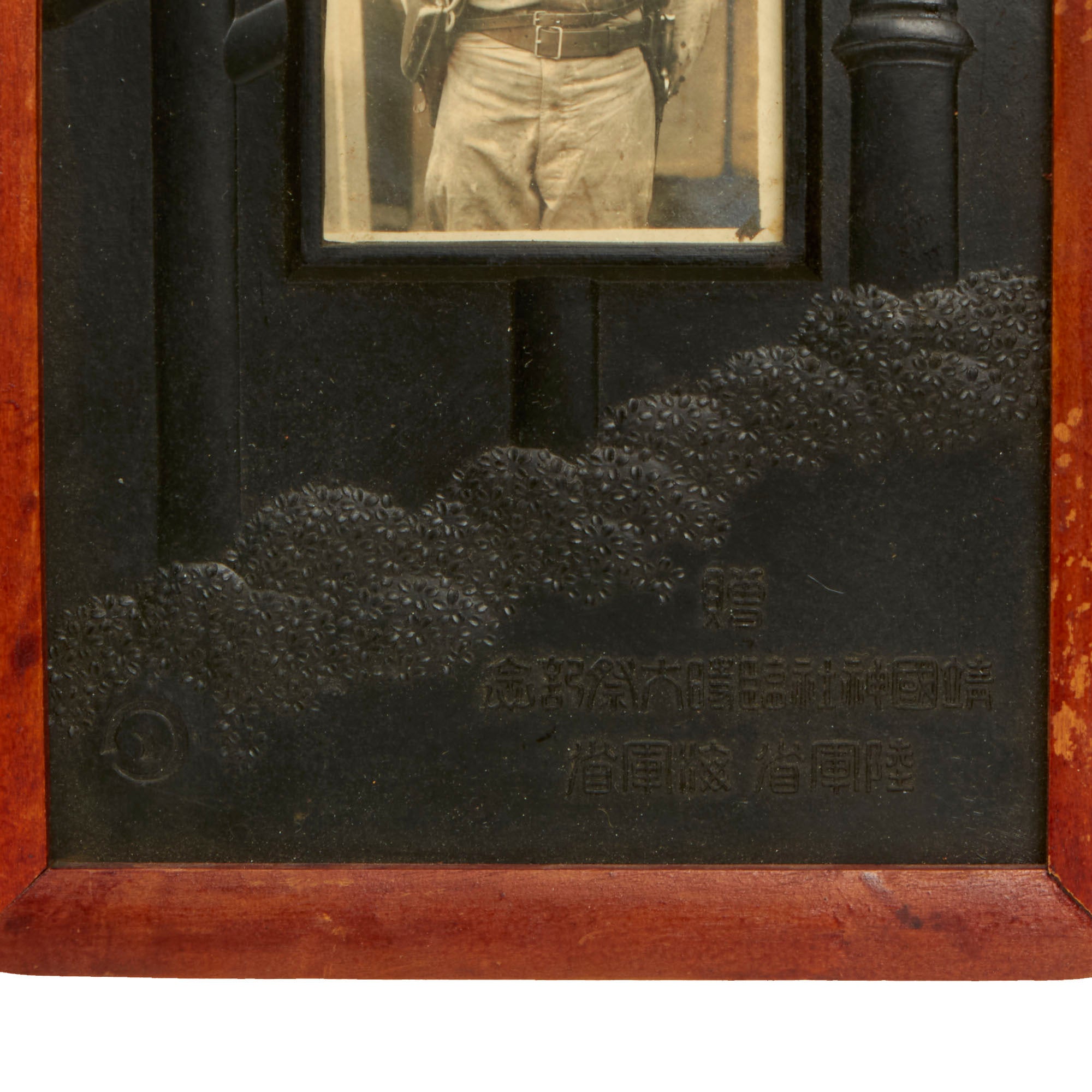 The frame is a patriotic example which depicts Japanese lanterns, a man atop a pillar, with text in the bottom right that likely mentions a location, the top word meaning Gift or Souvenir. Definitely worthy of further research.