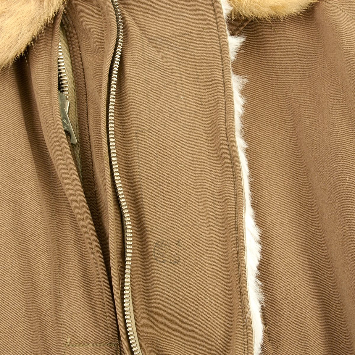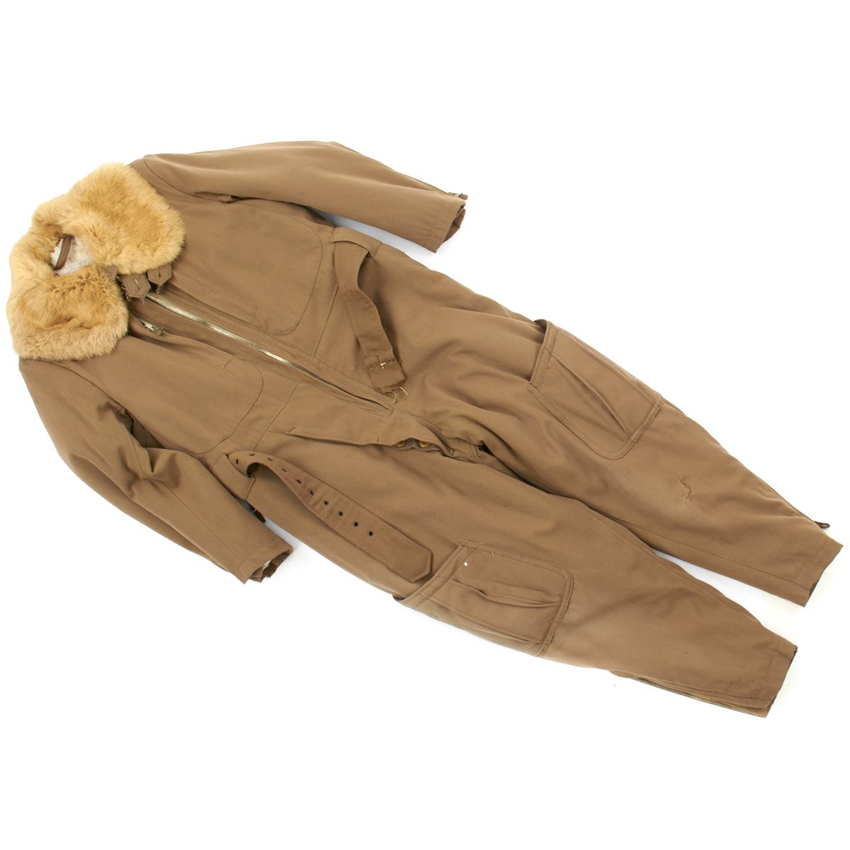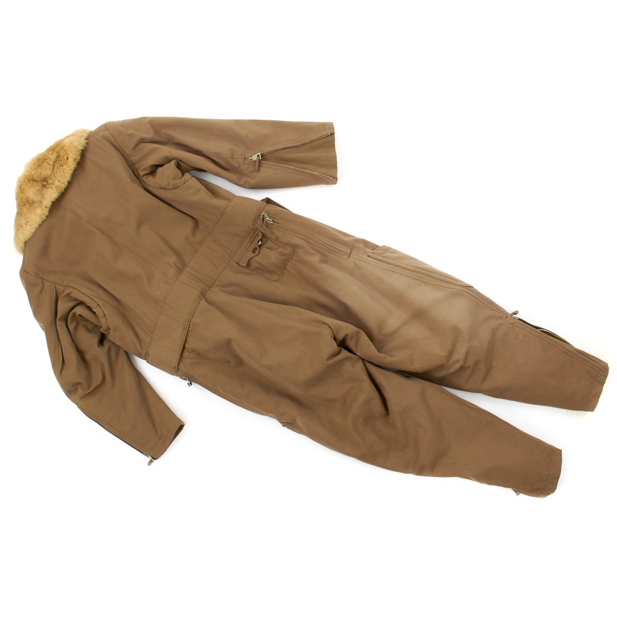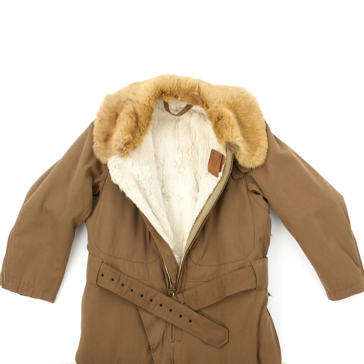 Original Item: Only One Available. Imperial Japanese one piece winter flying suit offered in exceptional condition. Features superb light brown rabbit fur collar while the body of the suit is lined in white fleece. The shell is made from brown cotton which is very clean. Suit has all original zips fitted to both sleeves, ankles and also to the double breast pockets, used for storing maps, pistol and personal items. Original waist belt is present but it is missing the buckle. The inside storm flap of the jacket carries the original Japanese factory manufacturing details in stamped ink, which has faded. In addition the trousers feature fur lined pockets to both knees. The reverse of the pants still retain the original electric plug which was used to power the electrical heating elements inside the suit. These suite were used primarily by Japanese bomber and fighter pilots during the cold weather months and for high altitude missions.