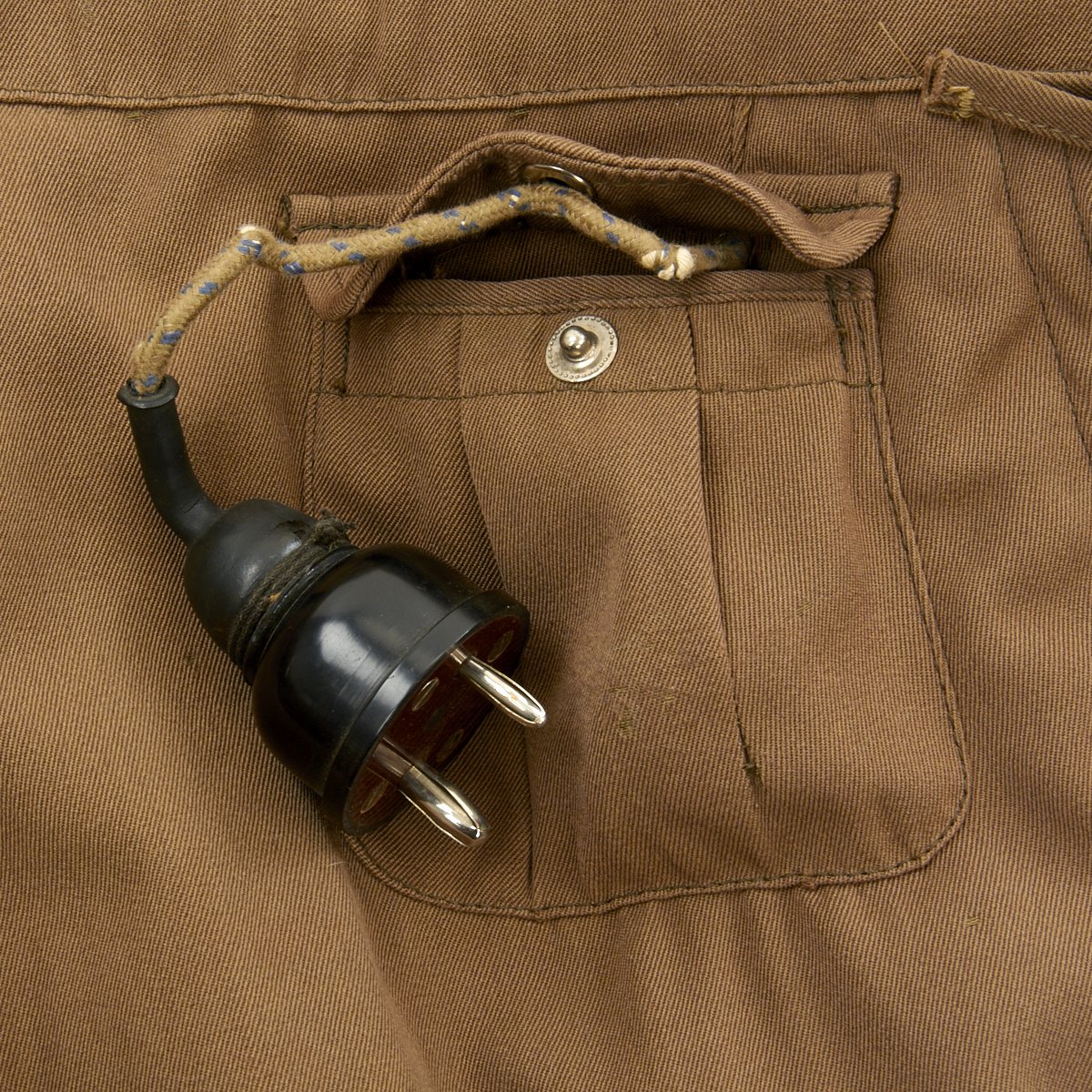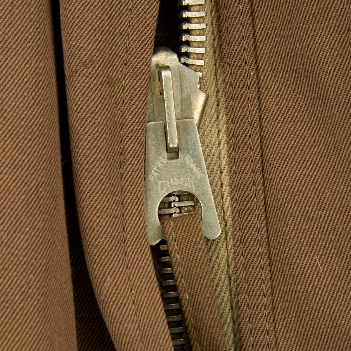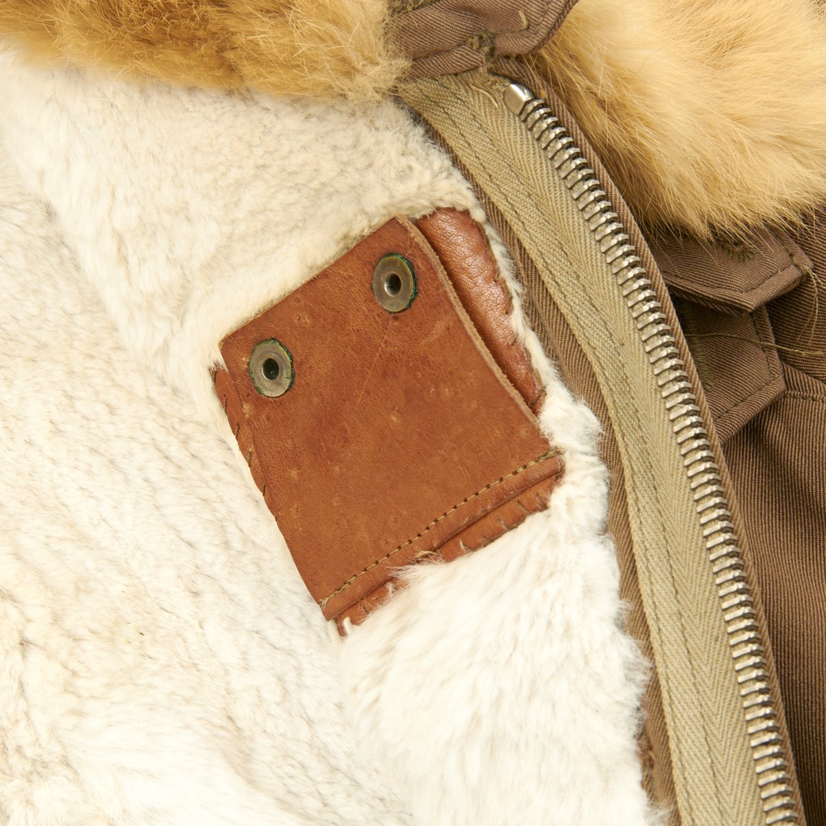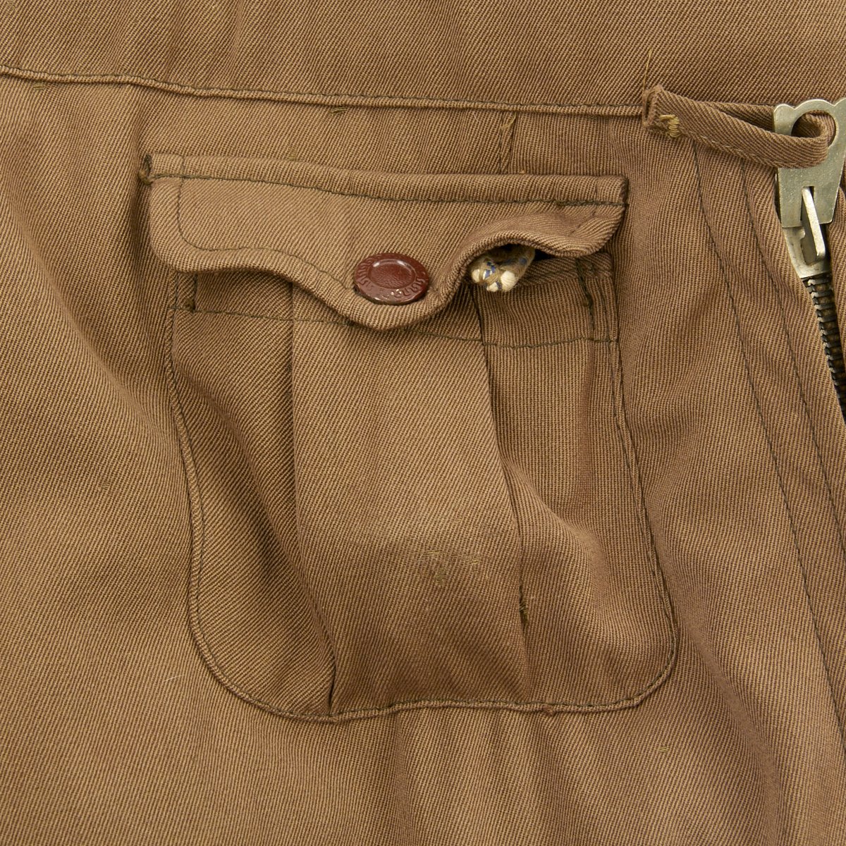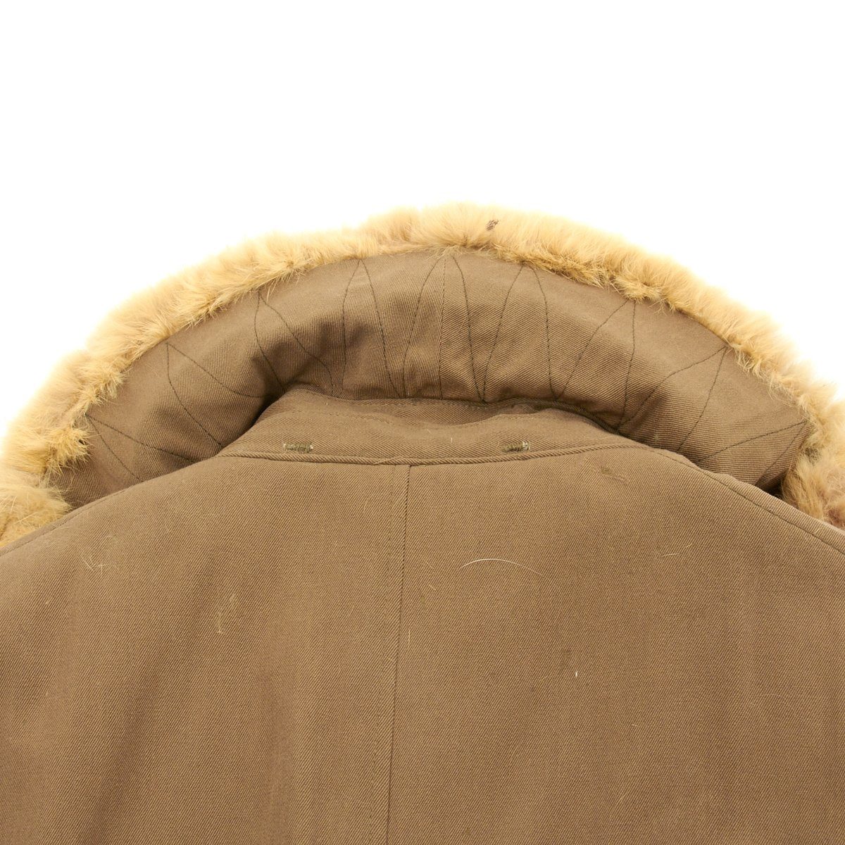 Original Item: Only One Available. Imperial Japanese one piece winter flying suit offered in exceptional condition. Features superb light brown rabbit fur collar while the body of the suit is lined in white fleece. The shell is made from brown cotton which is very clean. Suit has all original zips fitted to both sleeves, ankles and also to the double breast pockets, used for storing maps, pistol and personal items. Original waist belt is present but it is missing the buckle. The inside storm flap of the jacket carries the original Japanese factory manufacturing details in stamped ink, which has faded. In addition the trousers feature fur lined pockets to both knees. The reverse of the pants still retain the original electric plug which was used to power the electrical heating elements inside the suit. These suite were used primarily by Japanese bomber and fighter pilots during the cold weather months and for high altitude missions.