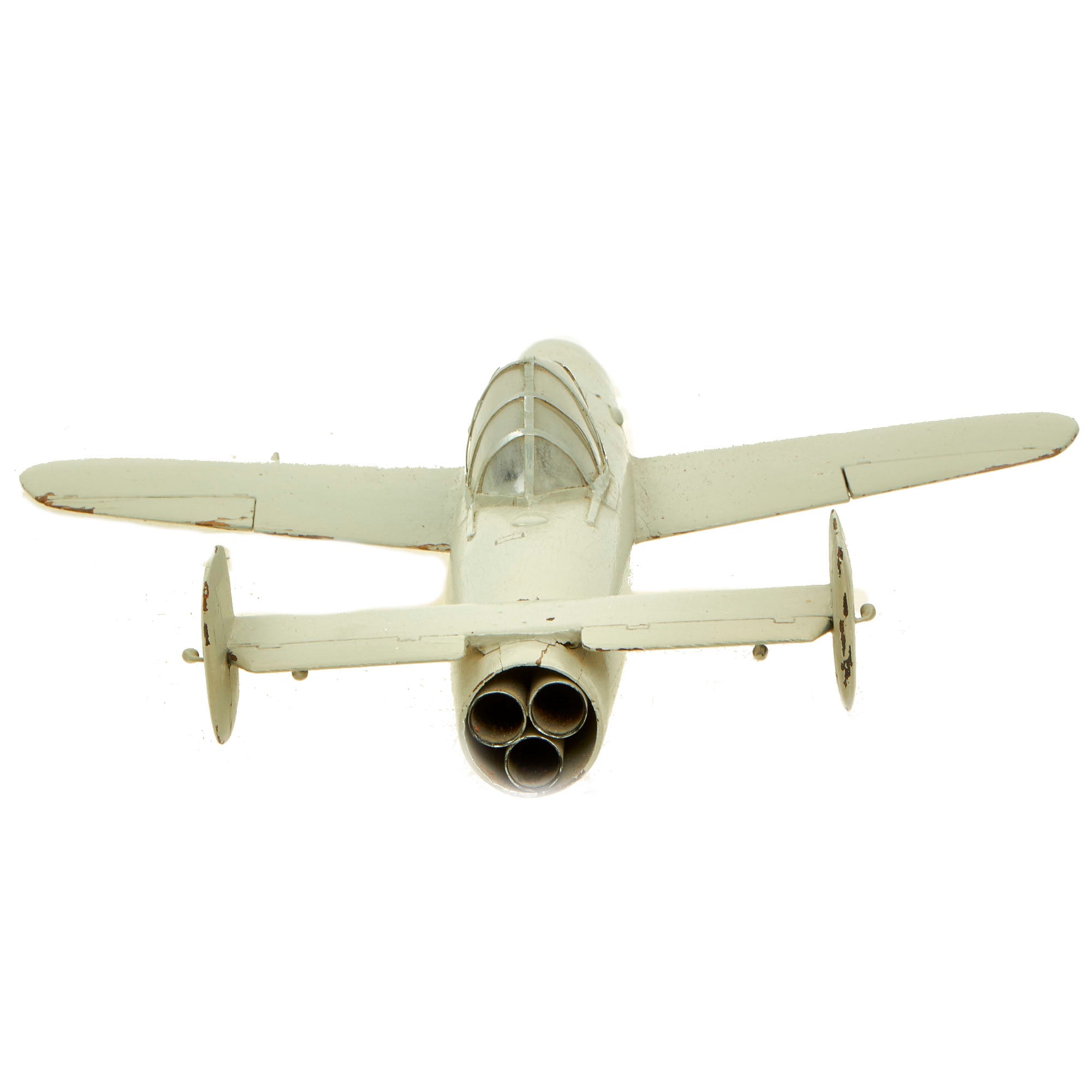 The aircraft is constructed of solid wood and features what appears to be original period paint. The model appears to be complete and not missing any pieces. The wingspan measures 12” with a total length of 15 ¼”. There is minor cracking present but nothing too damaging that affects the displayability of the model.