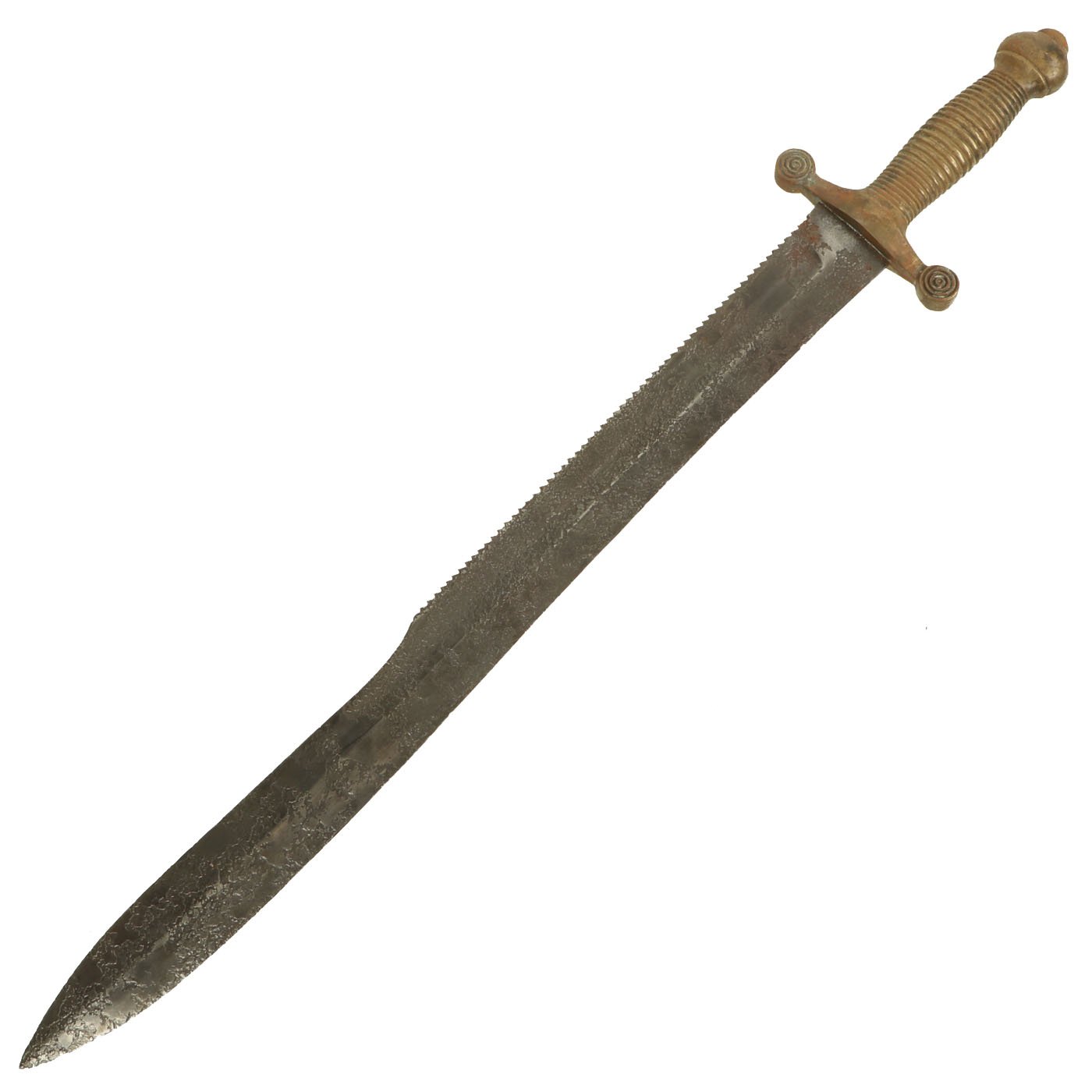 Original Item: Only One Available. This is a great example of a Classic Imperial Russian Sawback Pioneer Short Sword, called the M 1834 Тесак (Tesak), Russian for "Cleaver" or "Machete". These swords were issued to pioneer troops and used extensively in the Crimean War again Britain, France and Turkey in the early 1850s. It has a huge 19 1/4" long heavy blade over 1 1/2 inches wide in most places, with saw teeth on the back. Measuring 24 3/4" overall, the Short Sword is fitted with a substantial solid Brass grooved hilt. The ricasso has some faded Russian Issue markings and the crossguard is dated 1834.