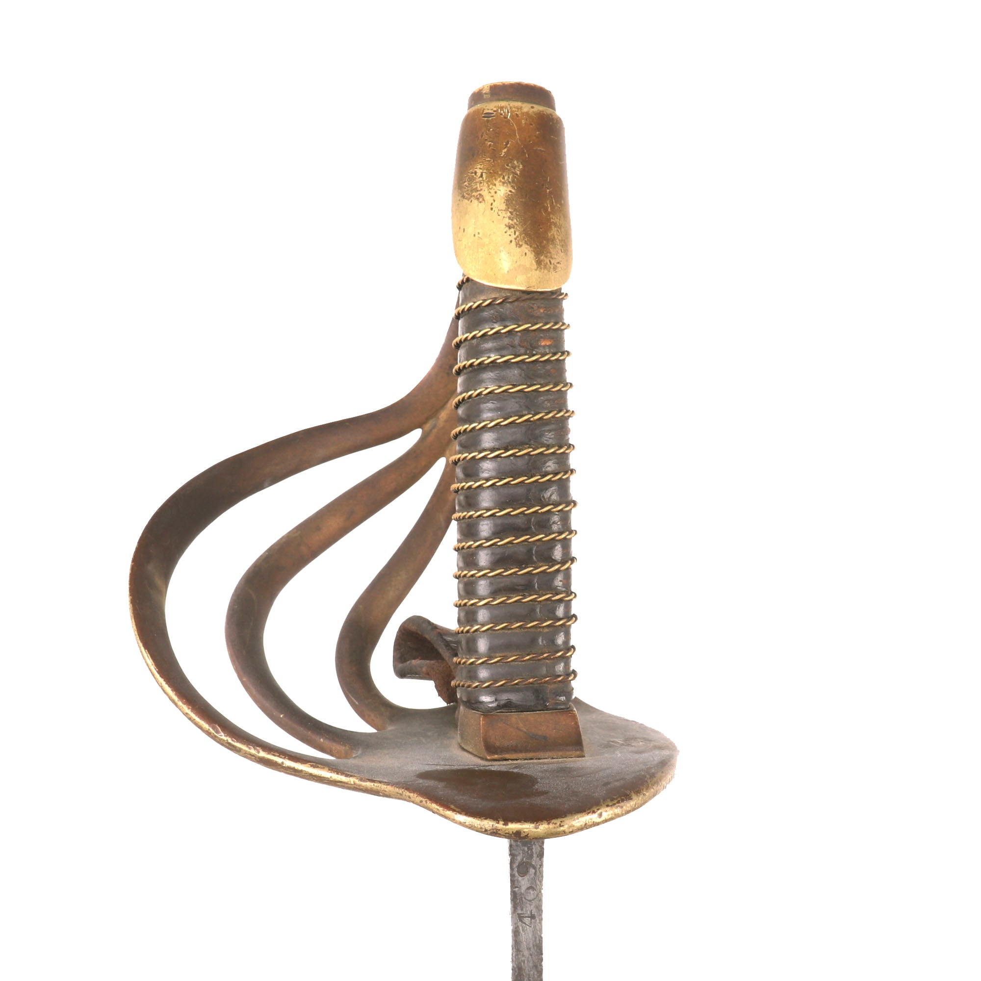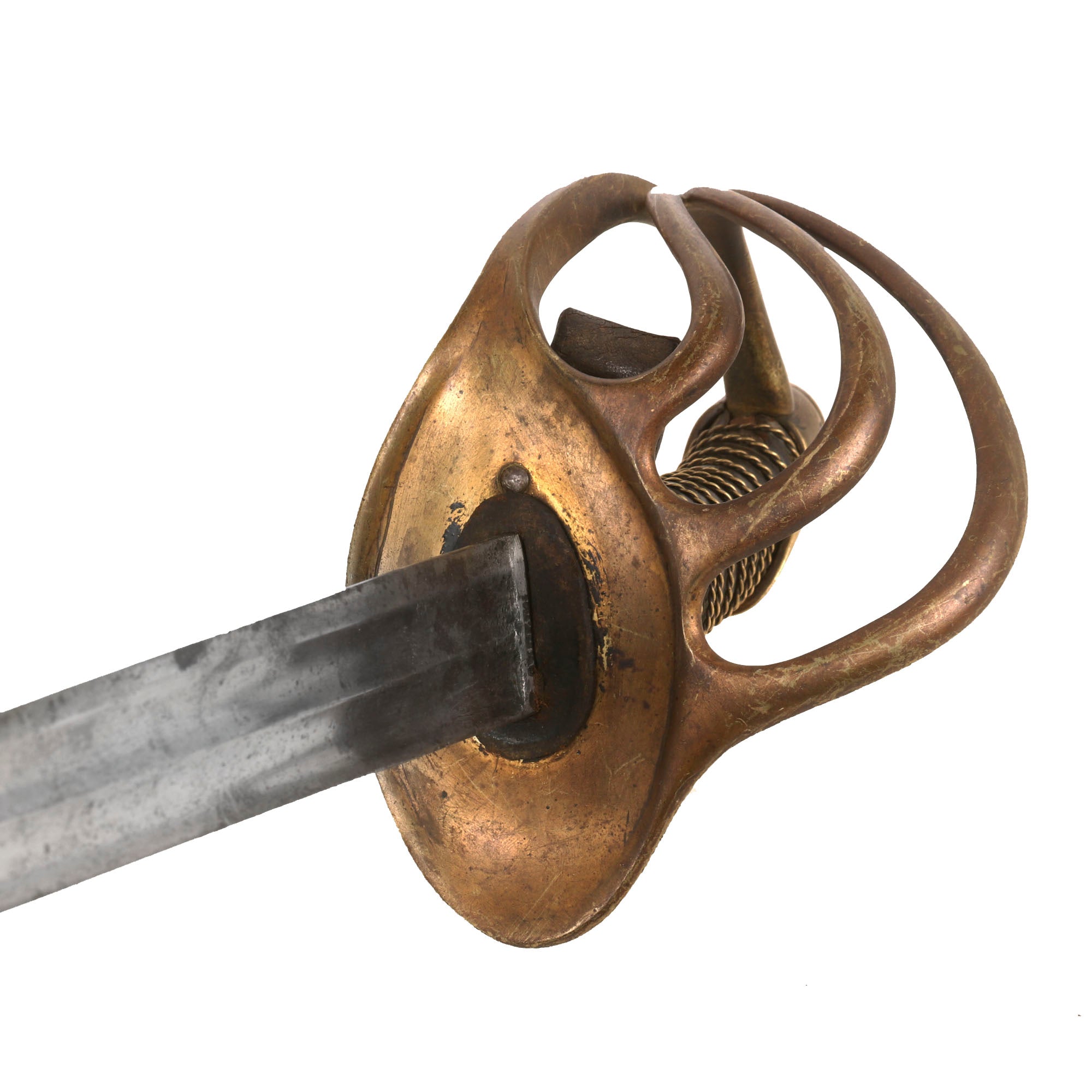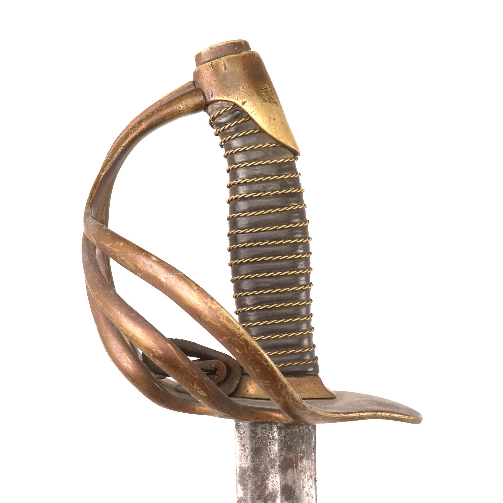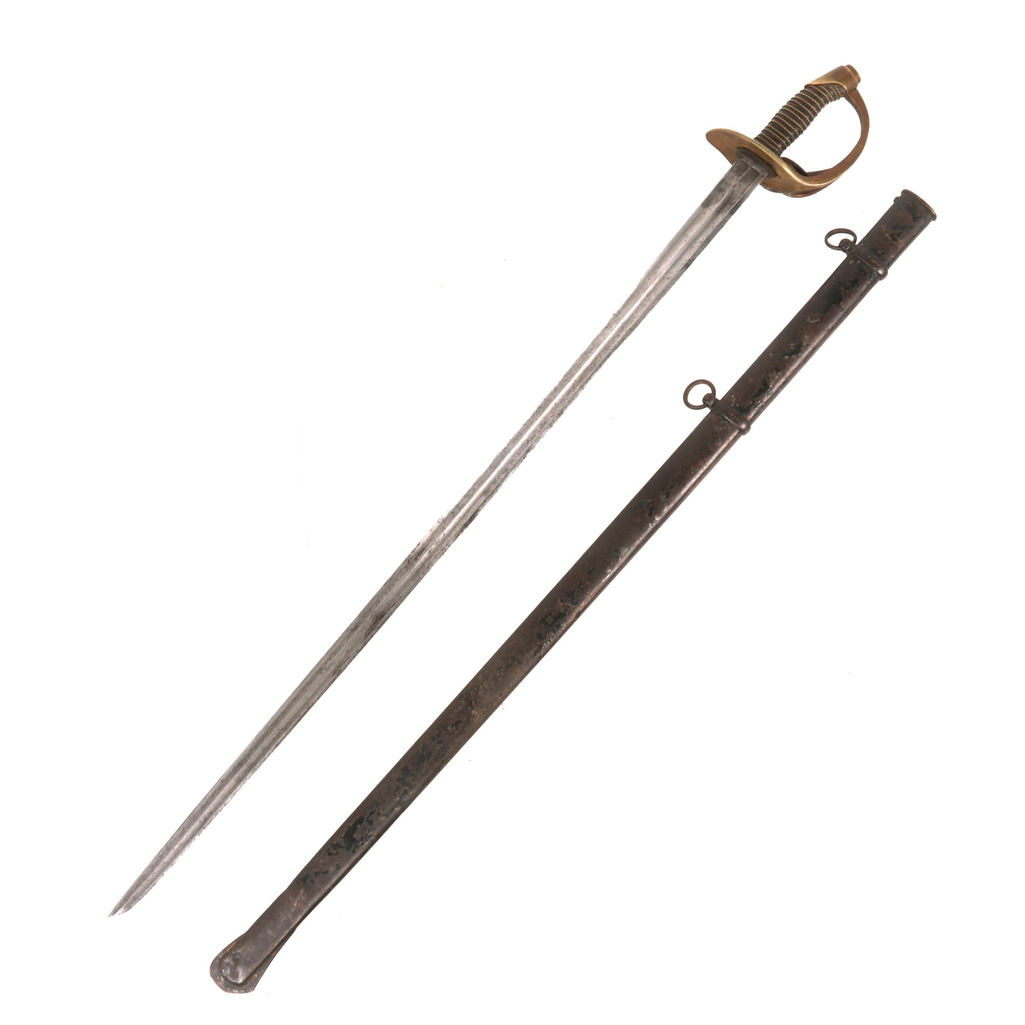 Original Item. Only One Available. This is a very interesting sword which we believe to be an Imperial Russian M1826 Cuirassier Trooper’s sword from the Crimean War era. The ricasso appears to bear a Russian maker’s marking that is now far too worn to read. The Russian 1826M sword is clearly a near copy of the French An XIII cuirassier sword.The 38” clipped point blade is in great condition for its age, and still firm to the hilt with the leather blade buffer still intact. The ricasso bears an almost certainly Russian maker’s stamp, with a 1 stamped on the reverse. The spine is stamped 489, either a serial number or rack number, but it appears that previous spine markings may have been worn down at one point.The original wire-bound leather grip is in good order without serious wear to the leather. The original leather finger loop is intact but broken in half. These are almost always just absent.The original painted scabbard is heavily worn with major paint loss. There is moderate denting and the suspension rings are intact.This model took heavy inspiration from the French ANXI and ANXIII Cuirassier sword, as well as the 1809 Cuirassier / Heavy Cavalry sword. A very scarce model of Imperial Russian sword, ready for further research and display.Approximate Dimensions:Blade Length: 38”Blade Style: Single Edged Straight with Double FullerOverall length: 43 1/2“Scabbard length: 39¼”