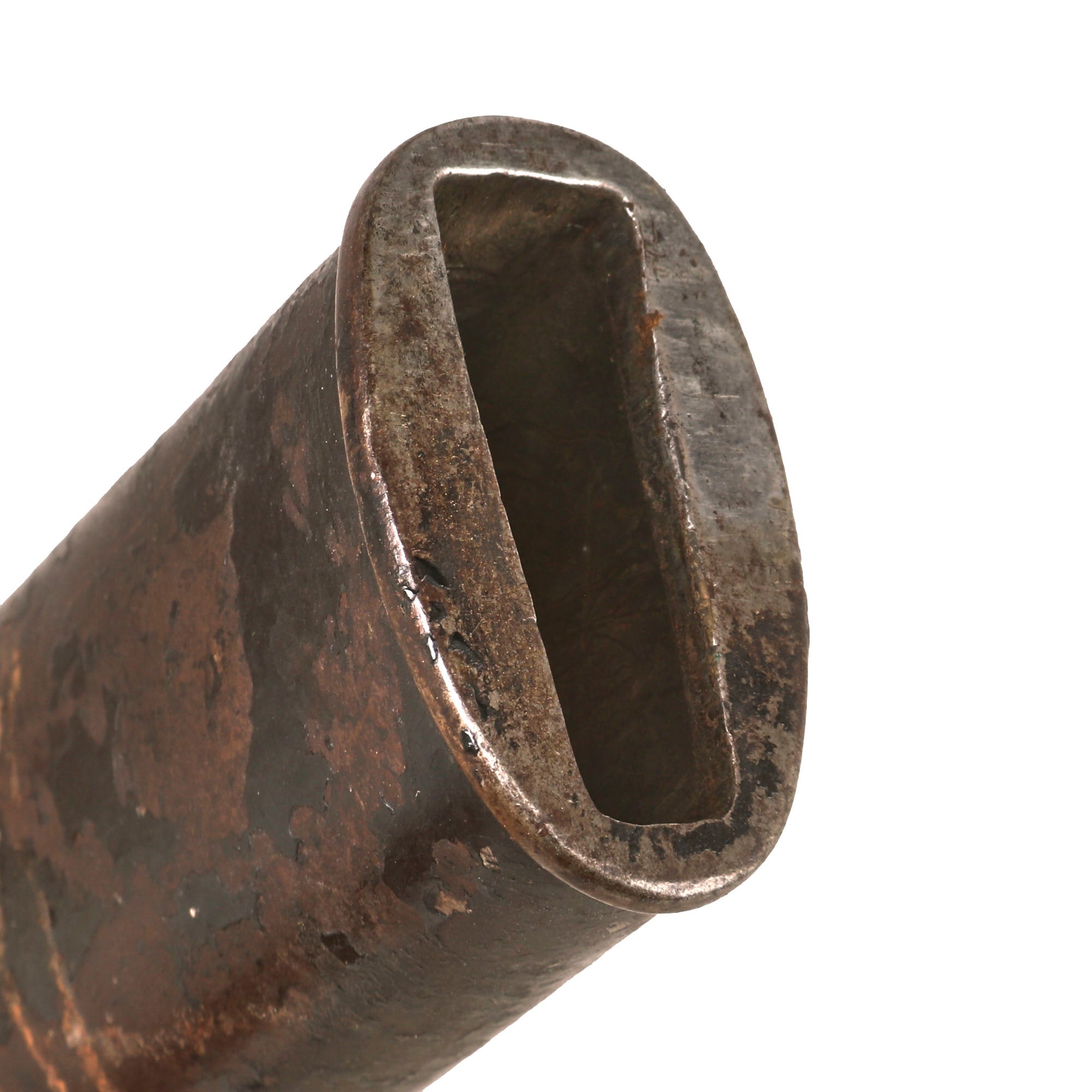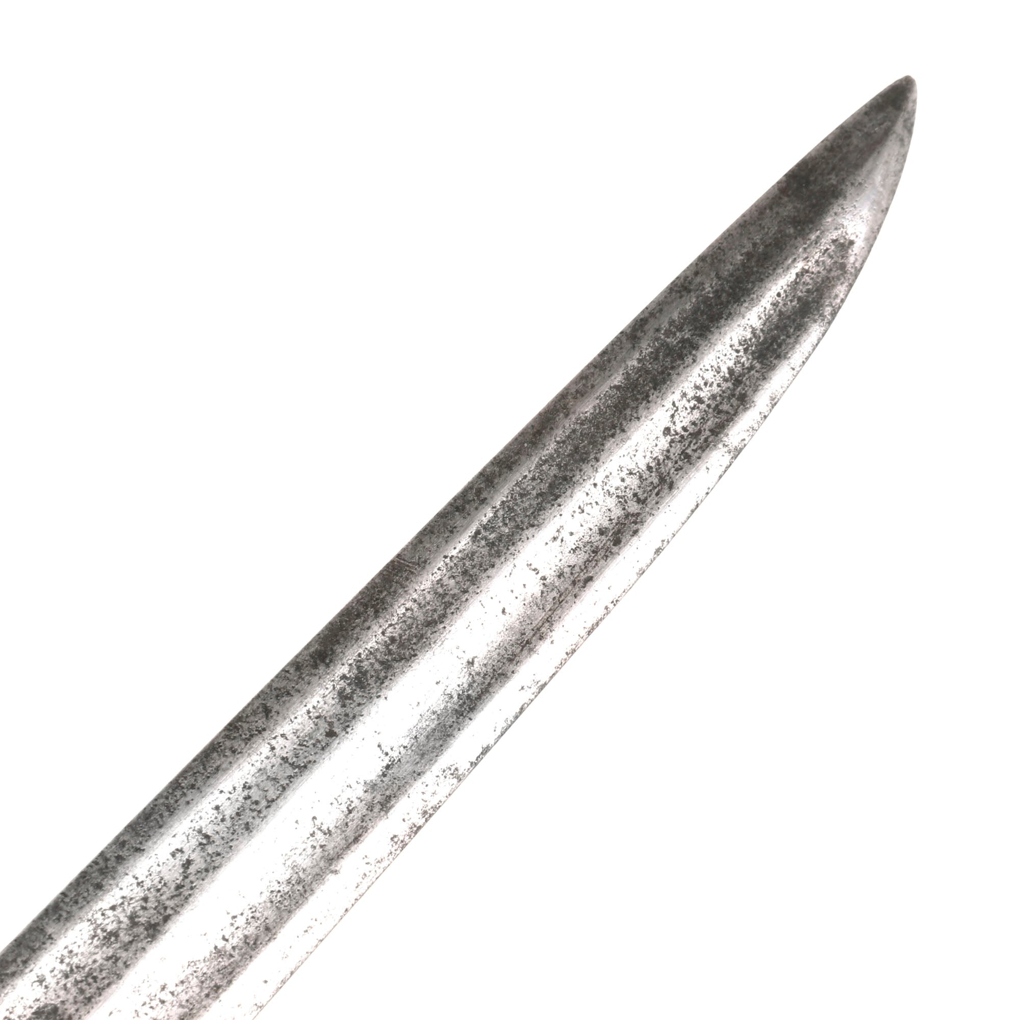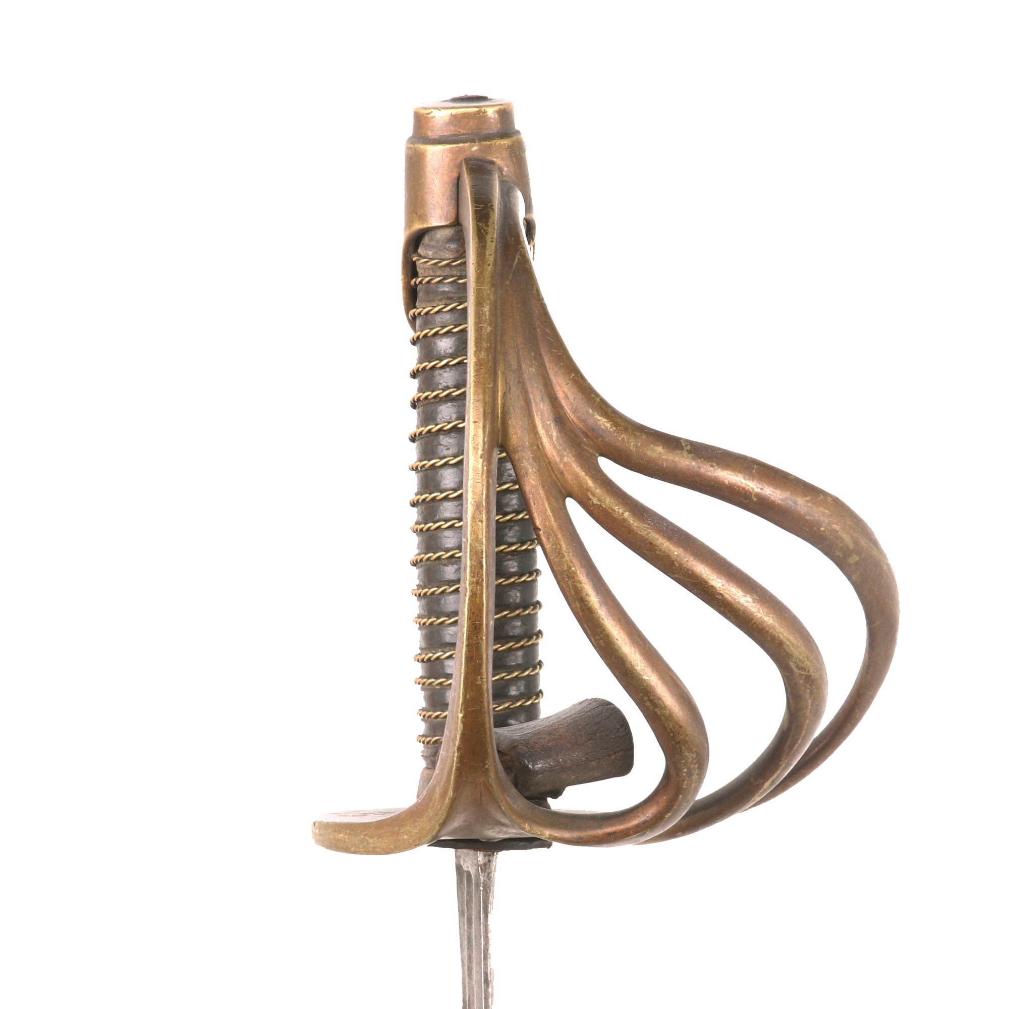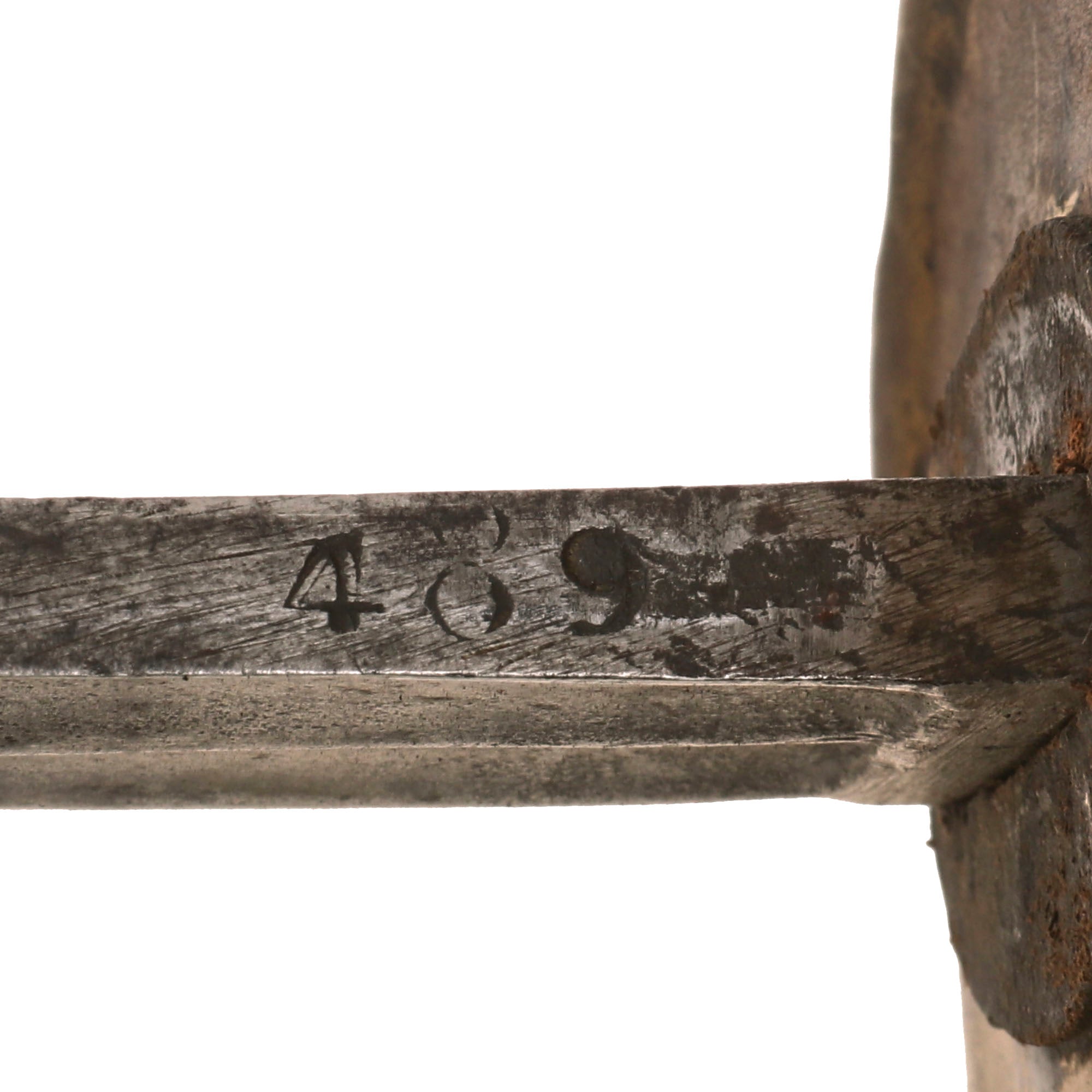Original Item. Only One Available. This is a very interesting sword which we believe to be an Imperial Russian M1826 Cuirassier Trooper’s sword from the Crimean War era. The ricasso appears to bear a Russian maker’s marking that is now far too worn to read. The Russian 1826M sword is clearly a near copy of the French An XIII cuirassier sword.The 38” clipped point blade is in great condition for its age, and still firm to the hilt with the leather blade buffer still intact. The ricasso bears an almost certainly Russian maker’s stamp, with a 1 stamped on the reverse. The spine is stamped 489, either a serial number or rack number, but it appears that previous spine markings may have been worn down at one point.The original wire-bound leather grip is in good order without serious wear to the leather. The original leather finger loop is intact but broken in half. These are almost always just absent.The original painted scabbard is heavily worn with major paint loss. There is moderate denting and the suspension rings are intact.This model took heavy inspiration from the French ANXI and ANXIII Cuirassier sword, as well as the 1809 Cuirassier / Heavy Cavalry sword. A very scarce model of Imperial Russian sword, ready for further research and display.Approximate Dimensions:Blade Length: 38”Blade Style: Single Edged Straight with Double FullerOverall length: 43 1/2“Scabbard length: 39¼”