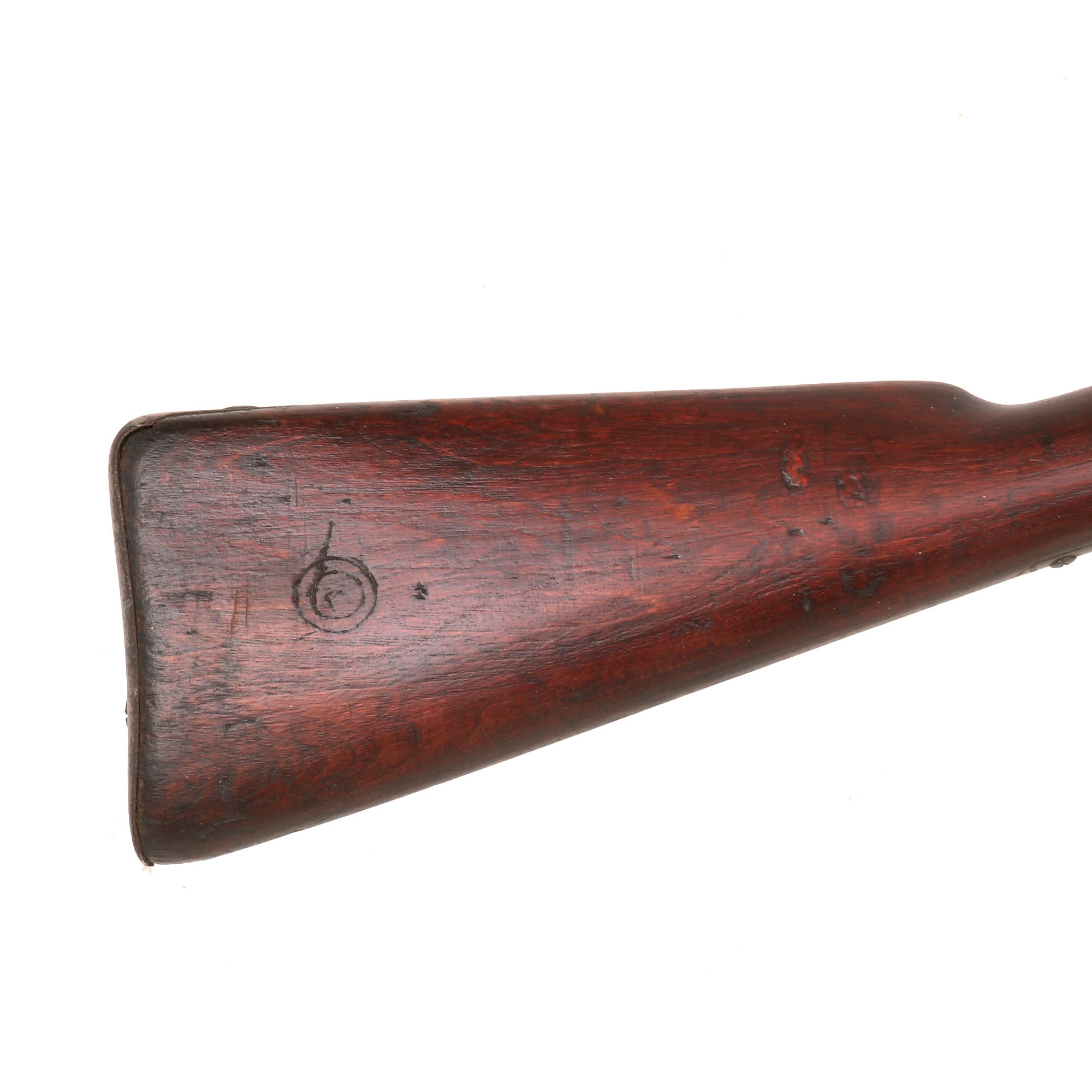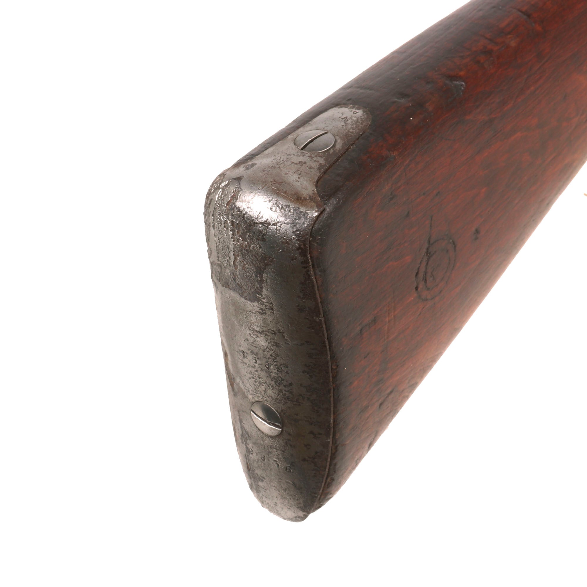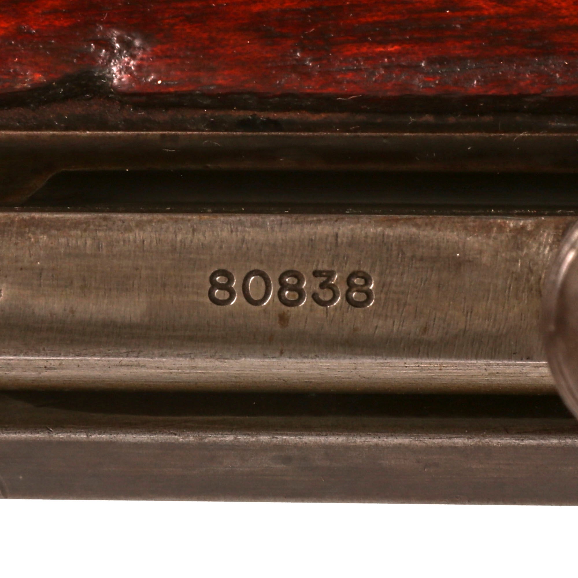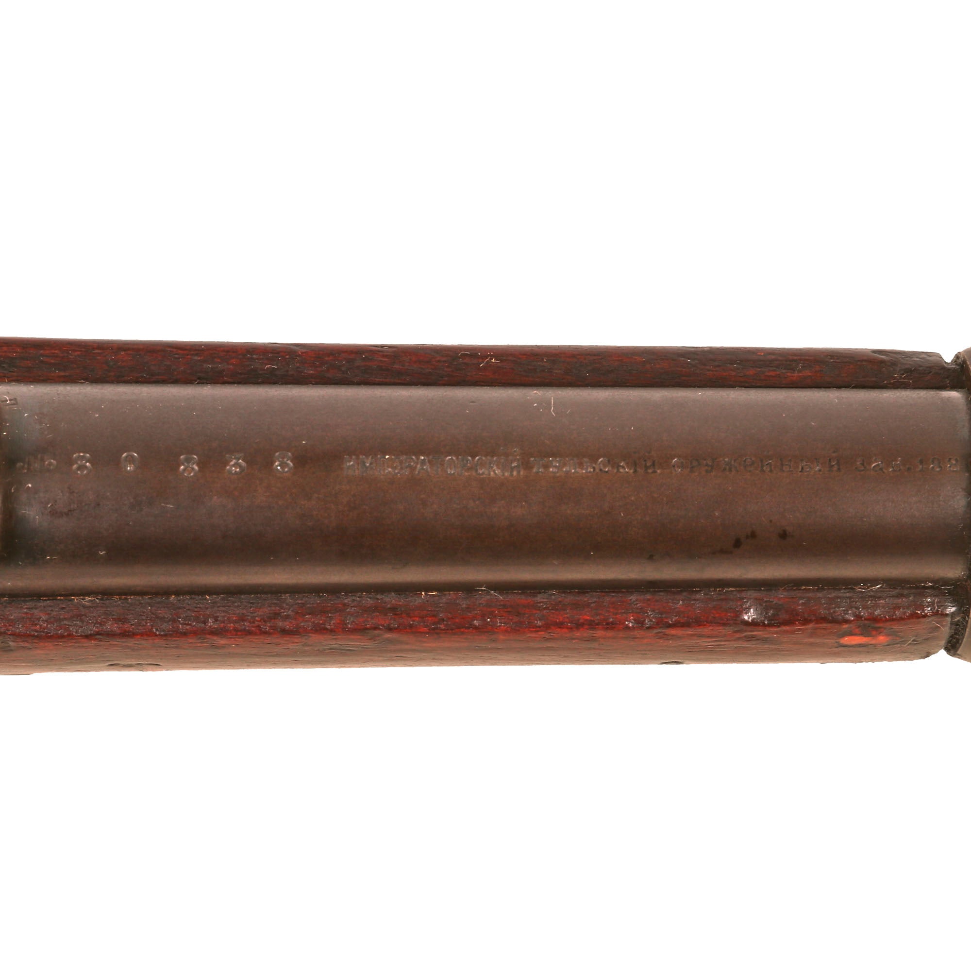 The rifle is 1350mm long, indicating that this is truly an Infantry rifle. There is a faded factory cartouche on the right side of the stock, however the date is illegible. The receiver displays an Imperial Russian Double Headed Eagle across the chamber ring over Cyrillic letters Л К, which we have seen on other examples. Serial number №80838 is stamped on the barrel in front of the sight, as well as on both parts of the bolt, though these may have been remarked. There is no serial stamped on the cleaning rod, however the butt plate is marked with both 6582 and 2836, indicating that this rifle was most likely serviced at arsenal several times, with parts being swapped and / or remarked.
