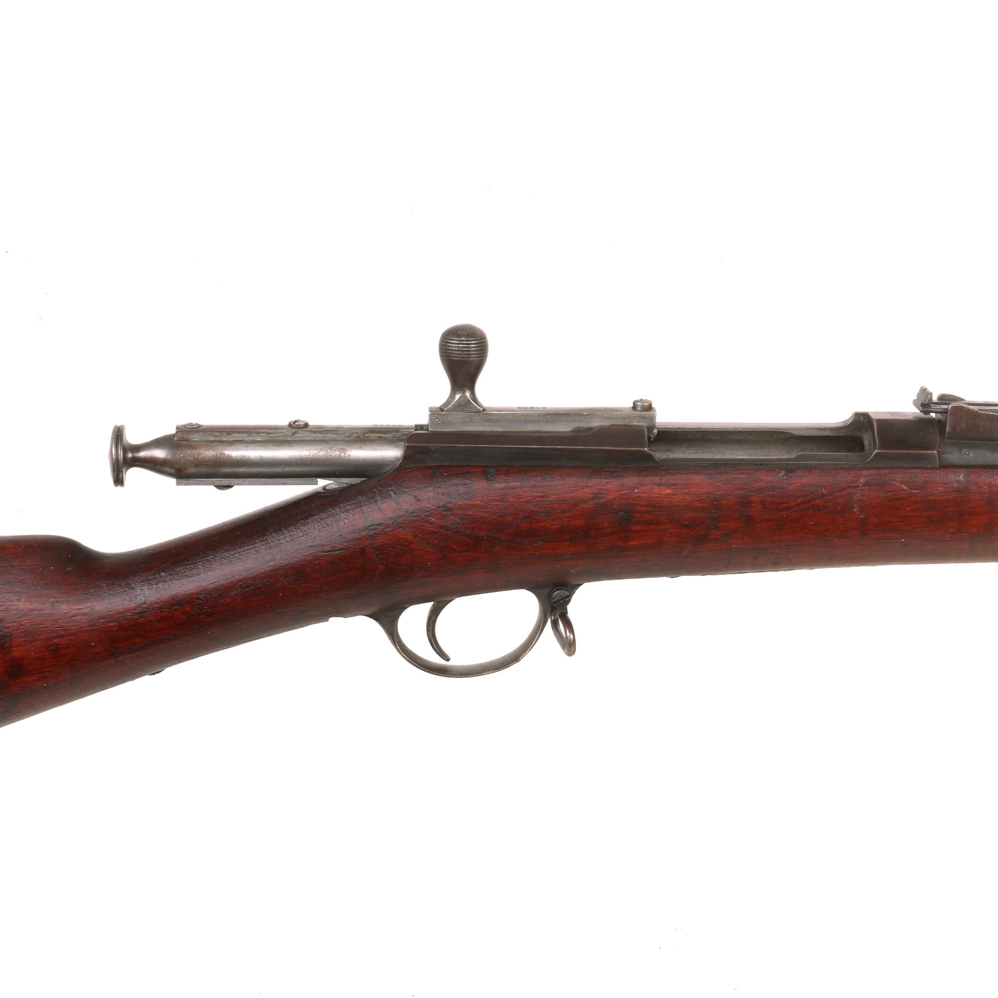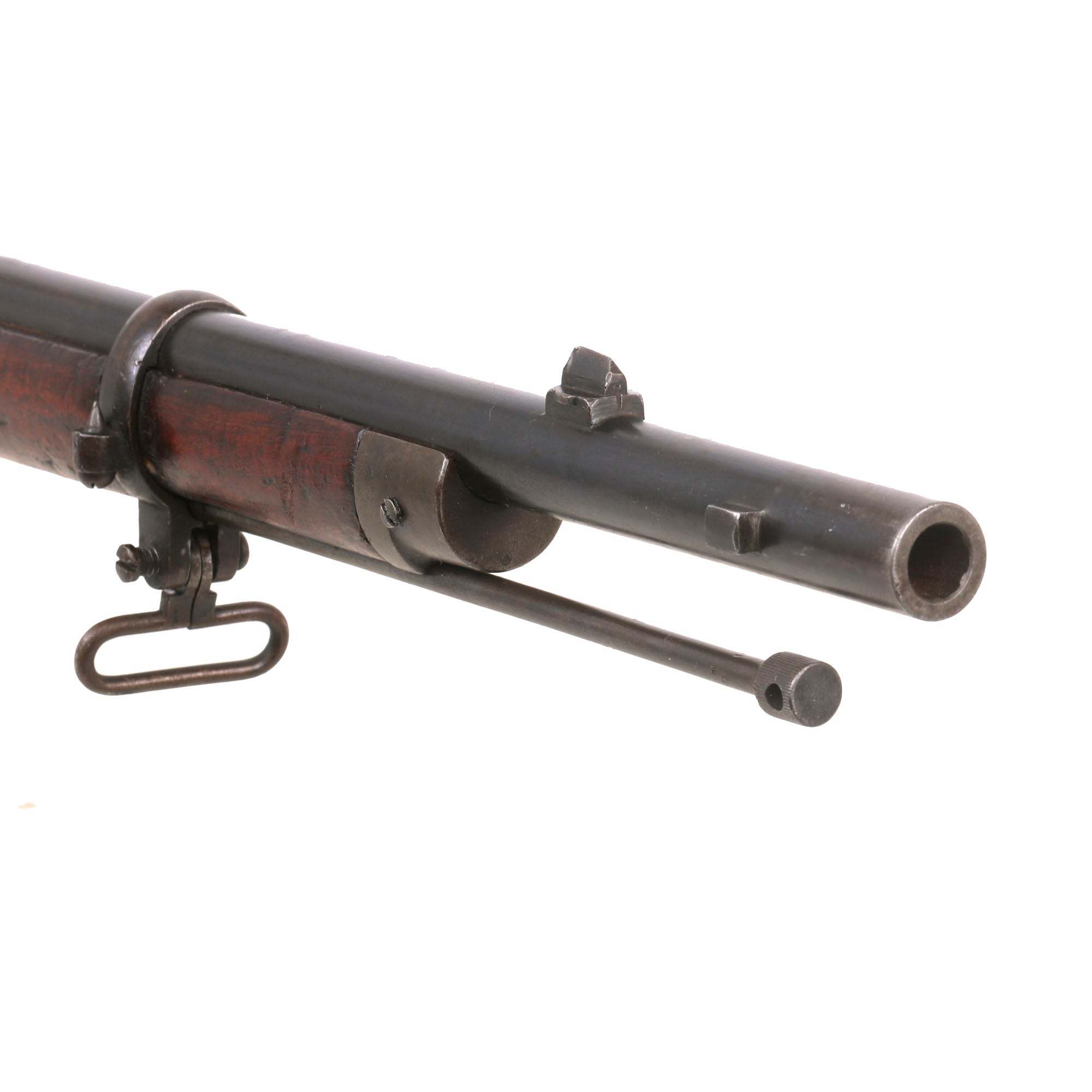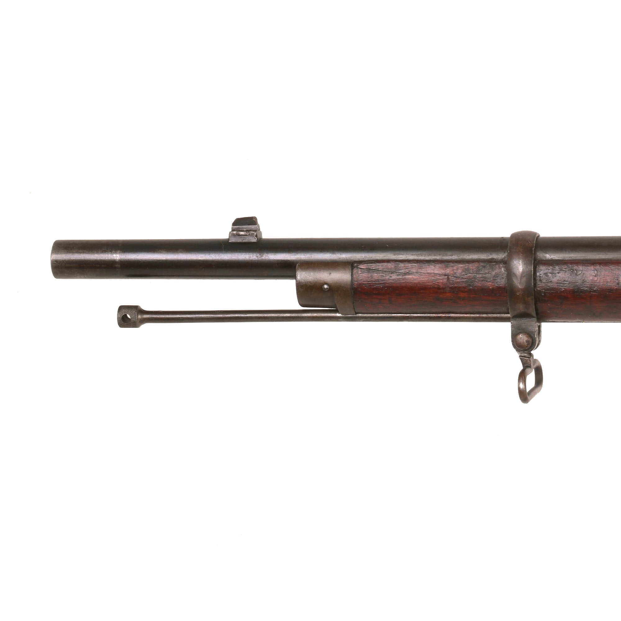 The action is strong and functions correctly, though it is finicky, as these always were. The bolt does not "lock" closed like most bolt action rifles, so it is relatively easy to open the bolt even when it is cocked. The bore is in excellent barely used condition, showing a bright finish with crisp lands and grooves. It does not show much sign of ever having been used. The rear sight is present and fully functional, and it even retains the "volley sight" on the right side, which is used with the small cone on the right of the front barrel band. Both sling swivels are present and correct.