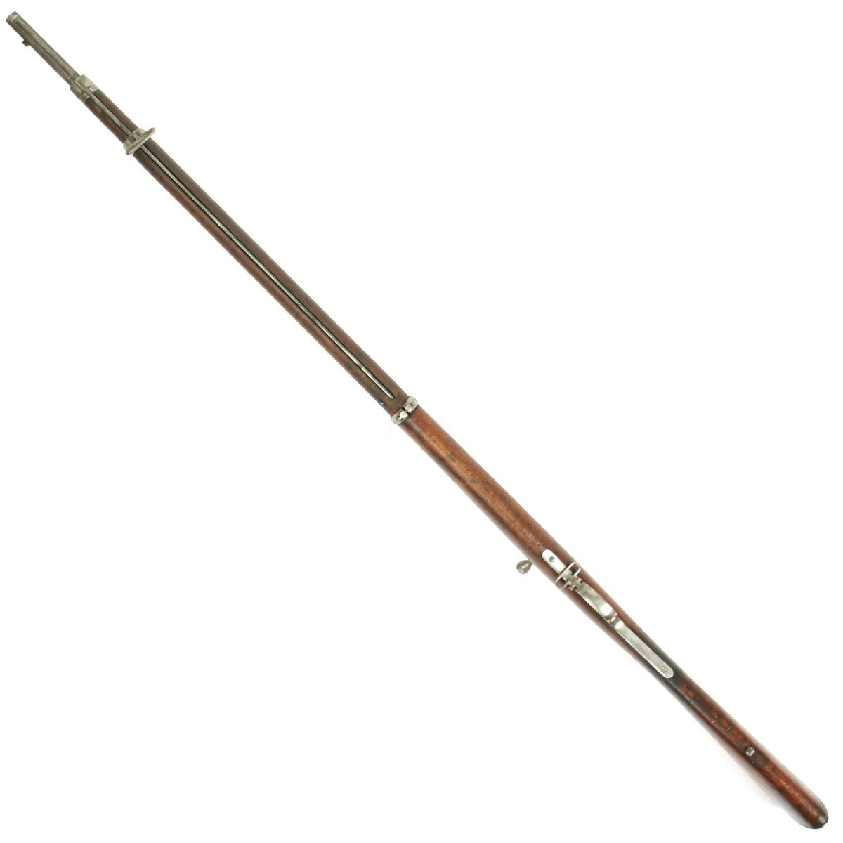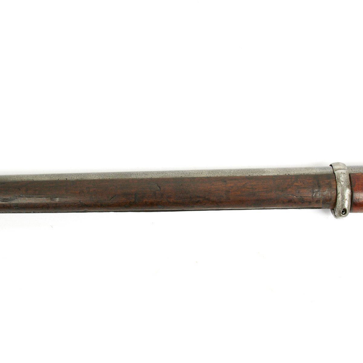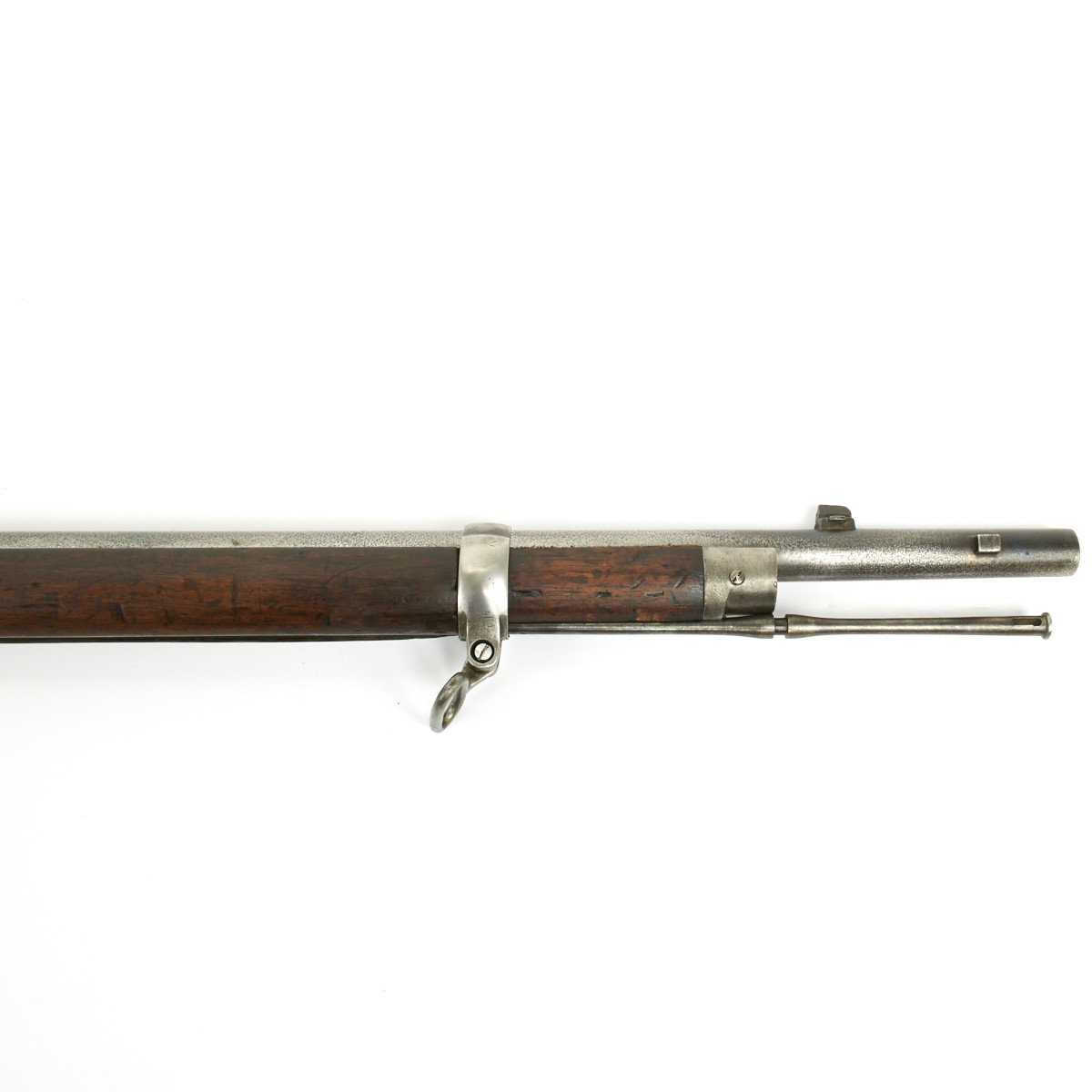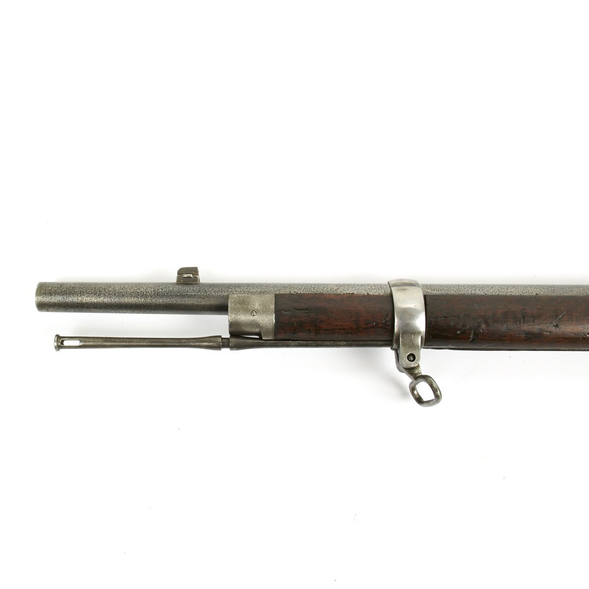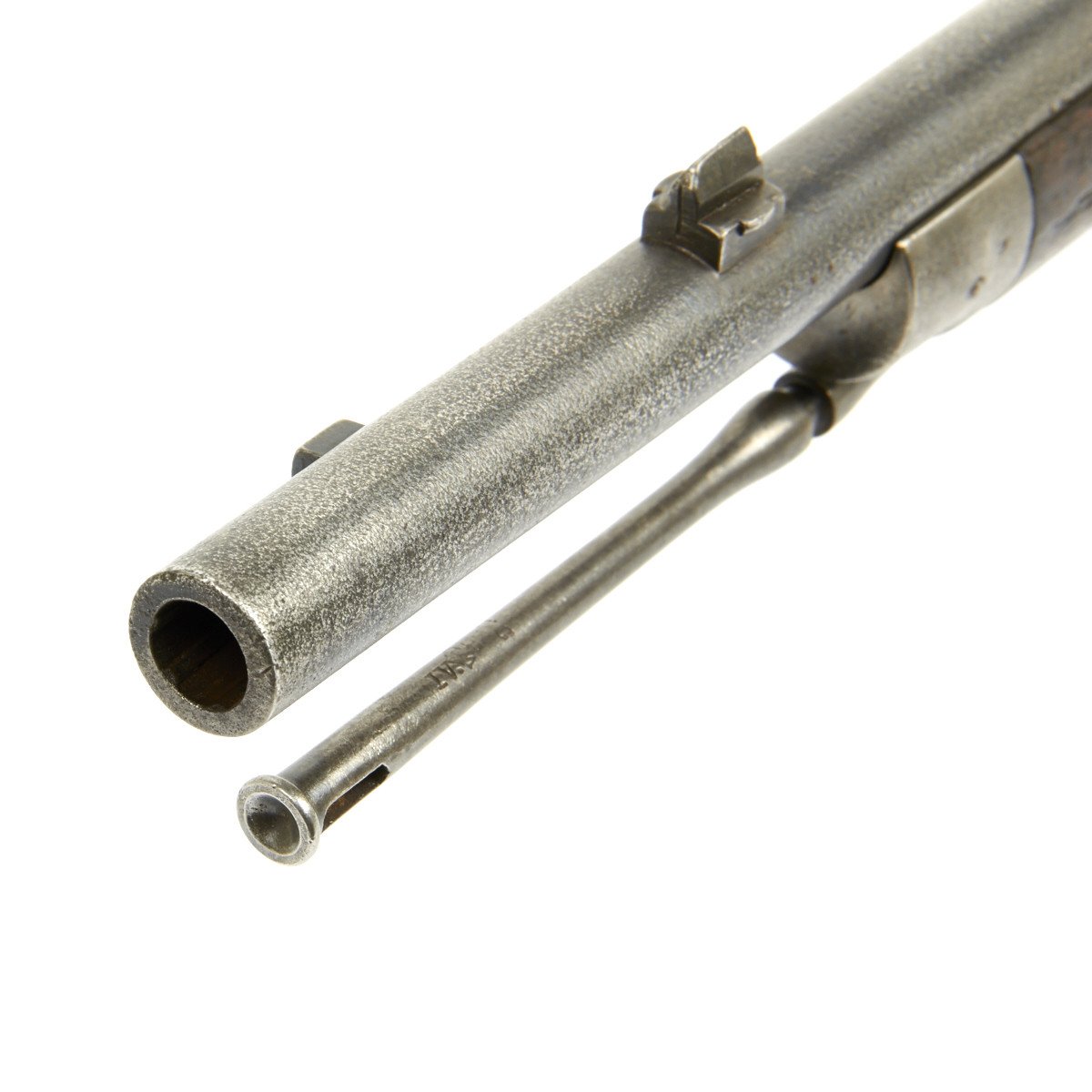 The rifle comes with the original cleaning rod, which is threaded on the lower end and screws into the stock. All metal parts are fine dark gray patina in overall very good condition, with almost no pitting visible. Bore is in very good plus condition with very strong rifling. The action is strong.