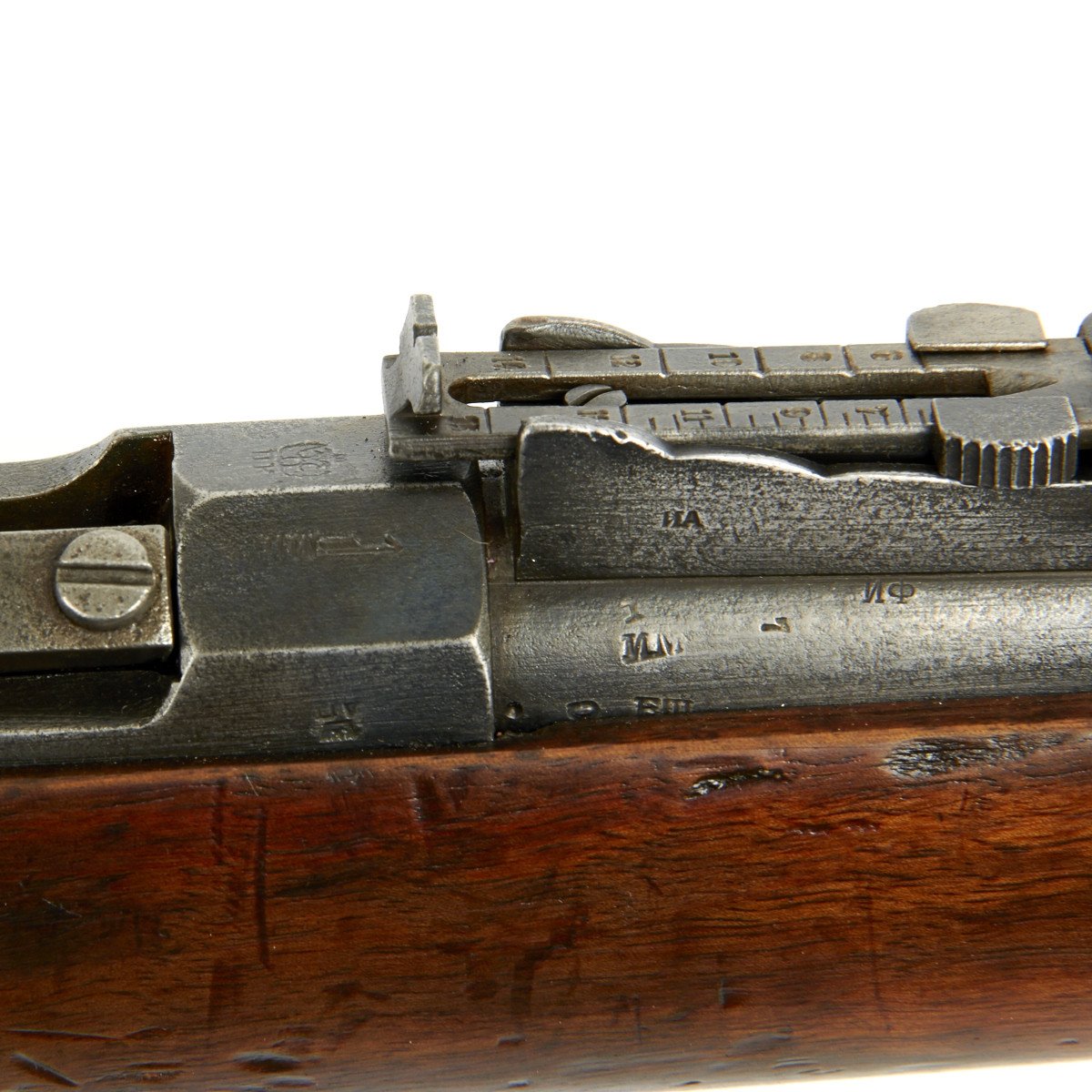 The rifle is 1350mm long, indicating that this is truly an Infantry rifle. There is a faded factory cartouche on the right side of the stock. There is a bow and arrow stamped into the top of the buttplate. The receiver displays an Imperial Russian Double Headed Eagle and Cyrillic letters. Mismatched serial numbers. Different serial numbers are stamped on the barrel (15921), bolt (12814) and buttplate (20055). No serial numbers are present on all the remaining parts, as is correct for this model of rifle.