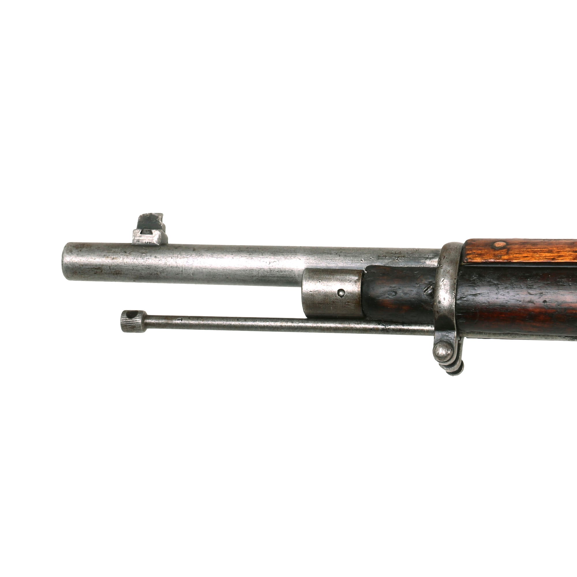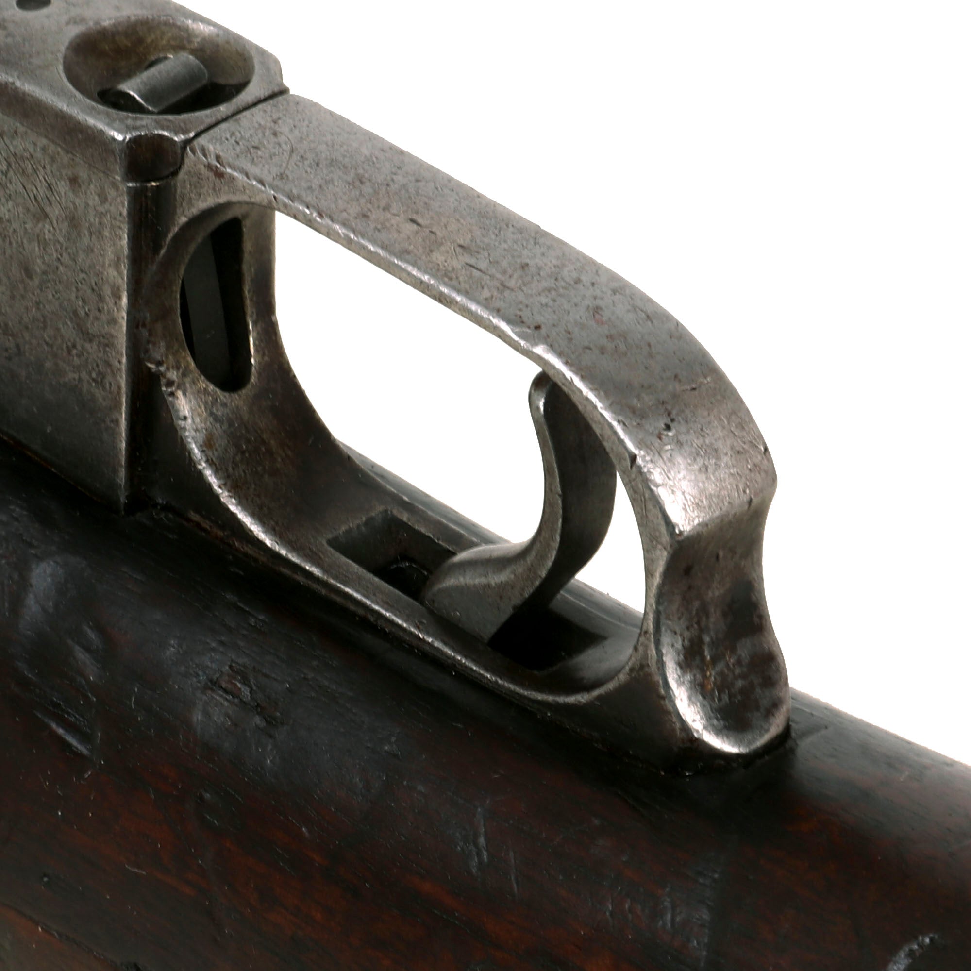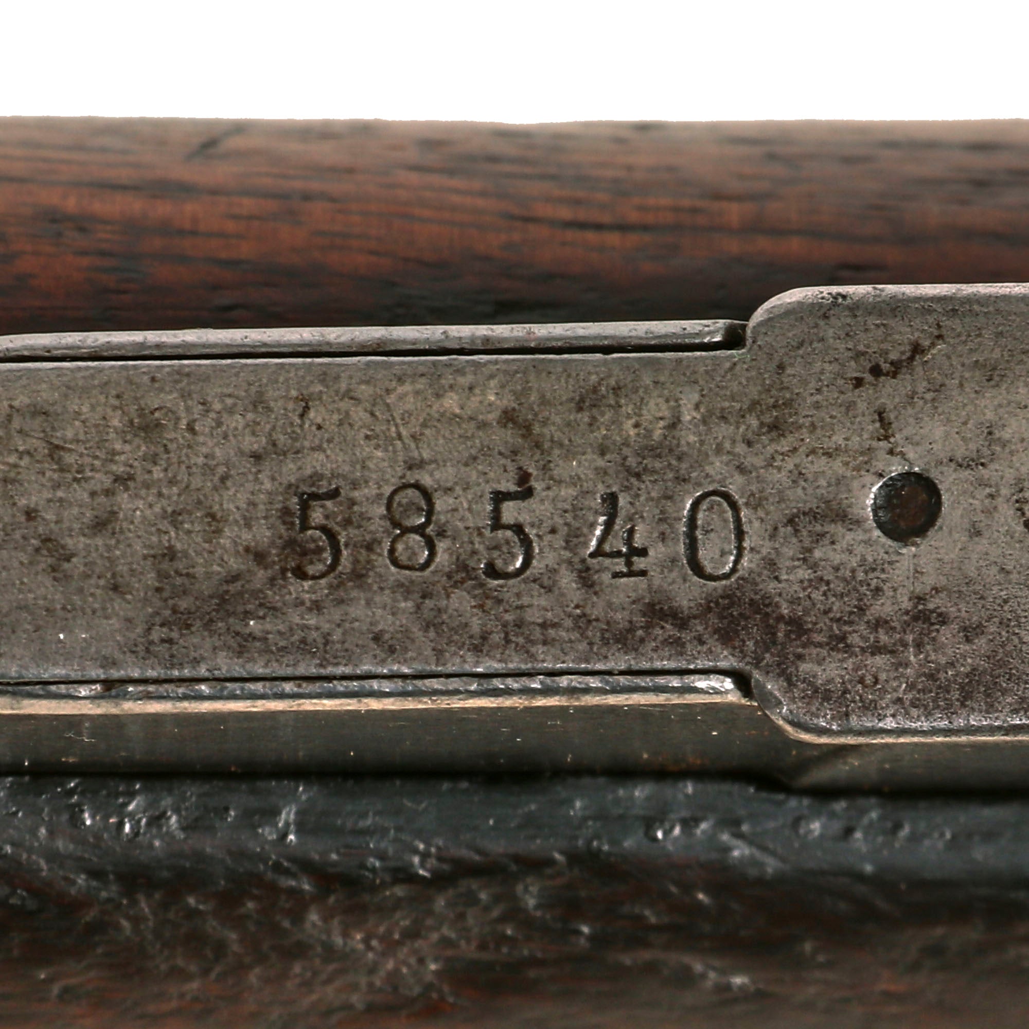 Condition of the rifle is very good, especially considering the age and amount of service it must have seen. The stock is in good condition, with the expected dents, dings, and other damage from long service. It probably has been cleaned and refinished, possibly several times, but it was definitely well cared for over the decades. There is a hole drilled through the lower for stock, so there may have been some type of other swivel installed at the time. The metalwork is in good shape, with much of the original bluing faded to a gray peppery patina on the barrel and receiver, with the bolt still bright steel. It still retains the original cleaning rod, which is in good shape, still threading properly into the stock, however it can be difficult to remove.
