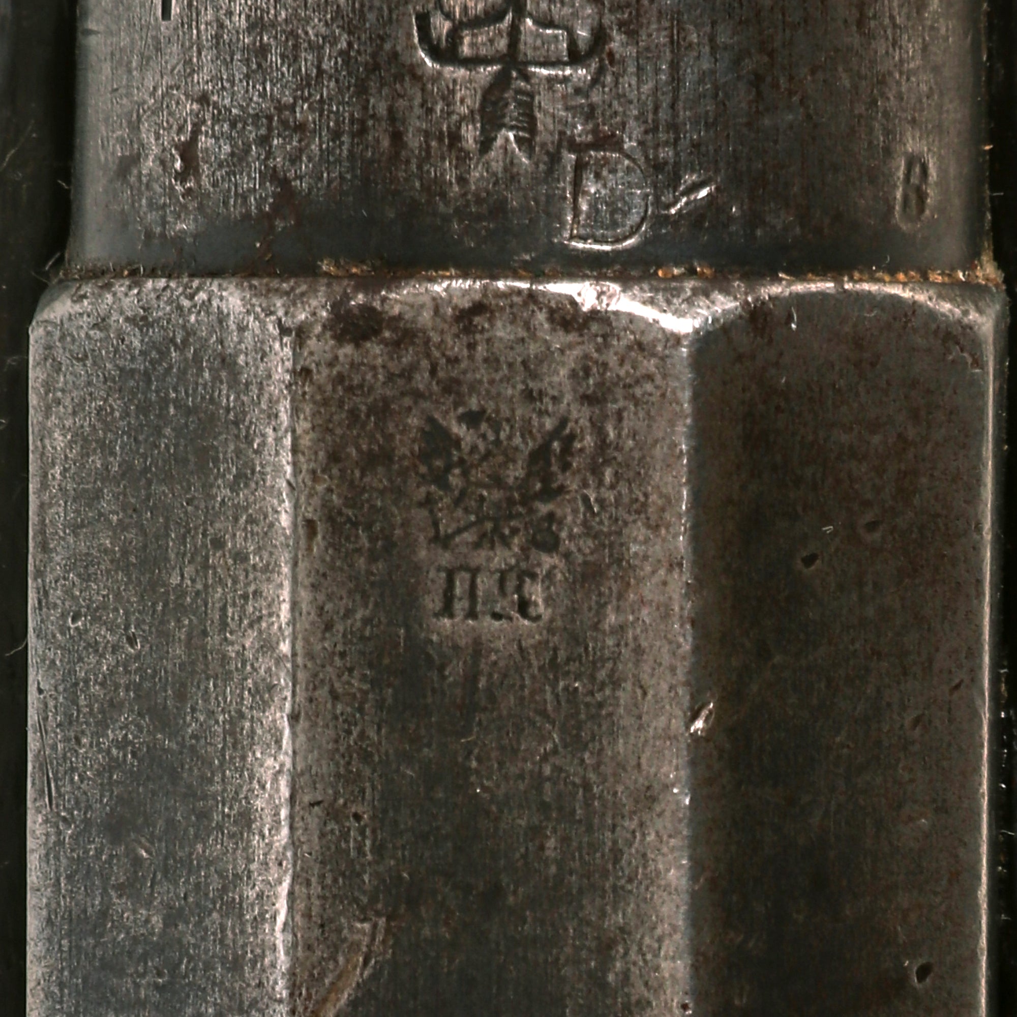 The barrel displays an Imperial Russian Double Headed Eagle over Cyrillic letters Л К just below the rear sight on the base of the barrel, and the same marking is repeated on the top front of the receiver.