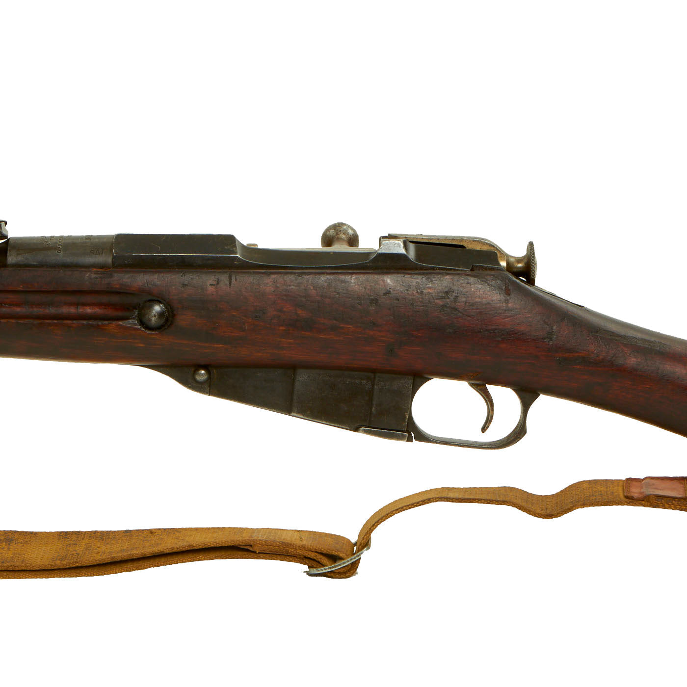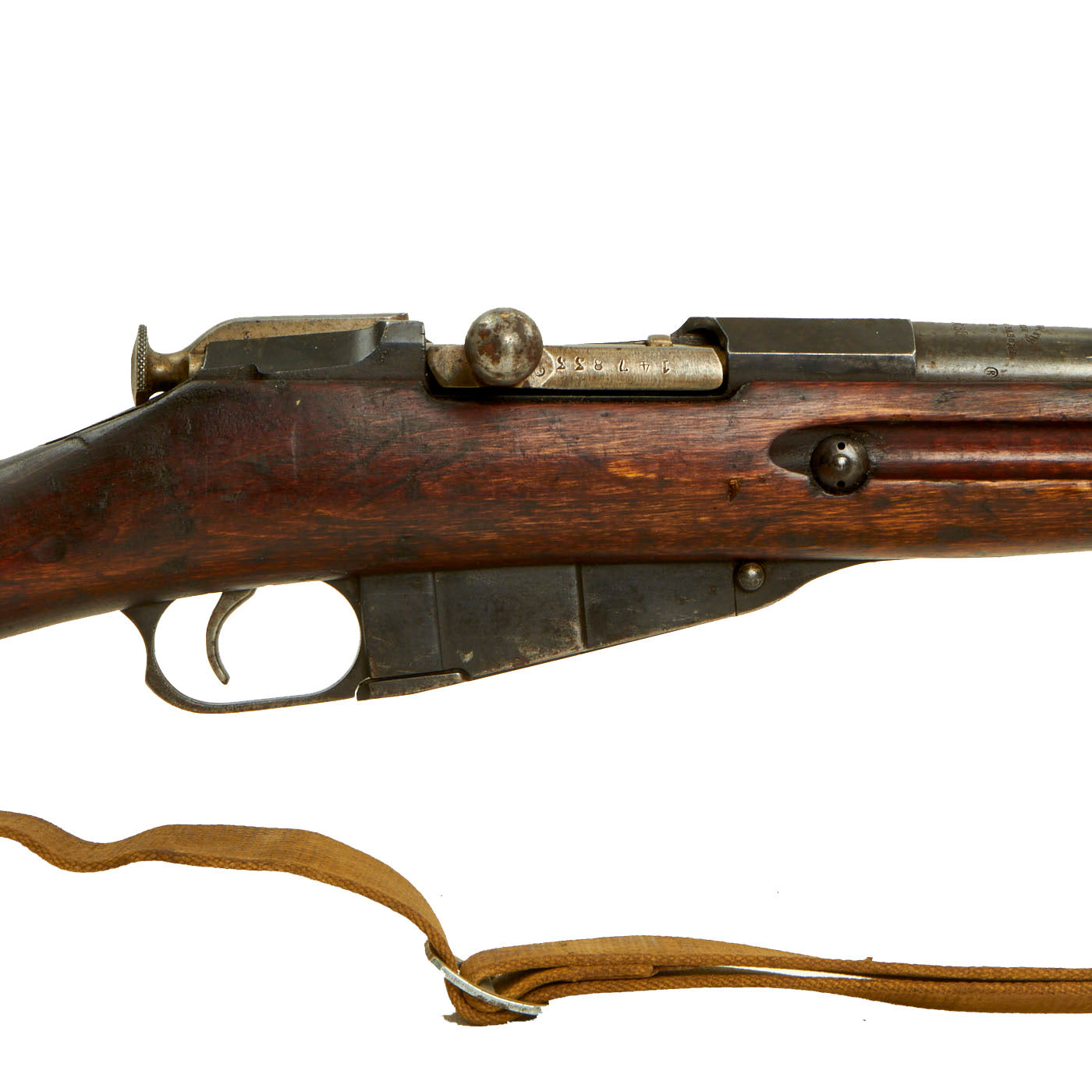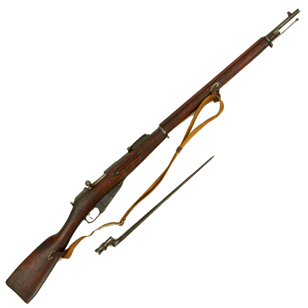 Original Item: Only One Available. These are so very rare, and this is only the third example that we have had in decades. A real pre-1899 Antique Russian Mosin-Nagant M1891 Full Length Rifle, more officially referred to as the "Three Line Infantry Rifle, Model of 1891." This example was never converted to the 91/30 standard, and is still in the original full length. It does have the stock cross bolt for use with the heavier "Spitzer" bullets used, and has the sling slots in place of swivels. It also comes complete with an original M/91 bayonet, and a WWII type canvas and leather sling.