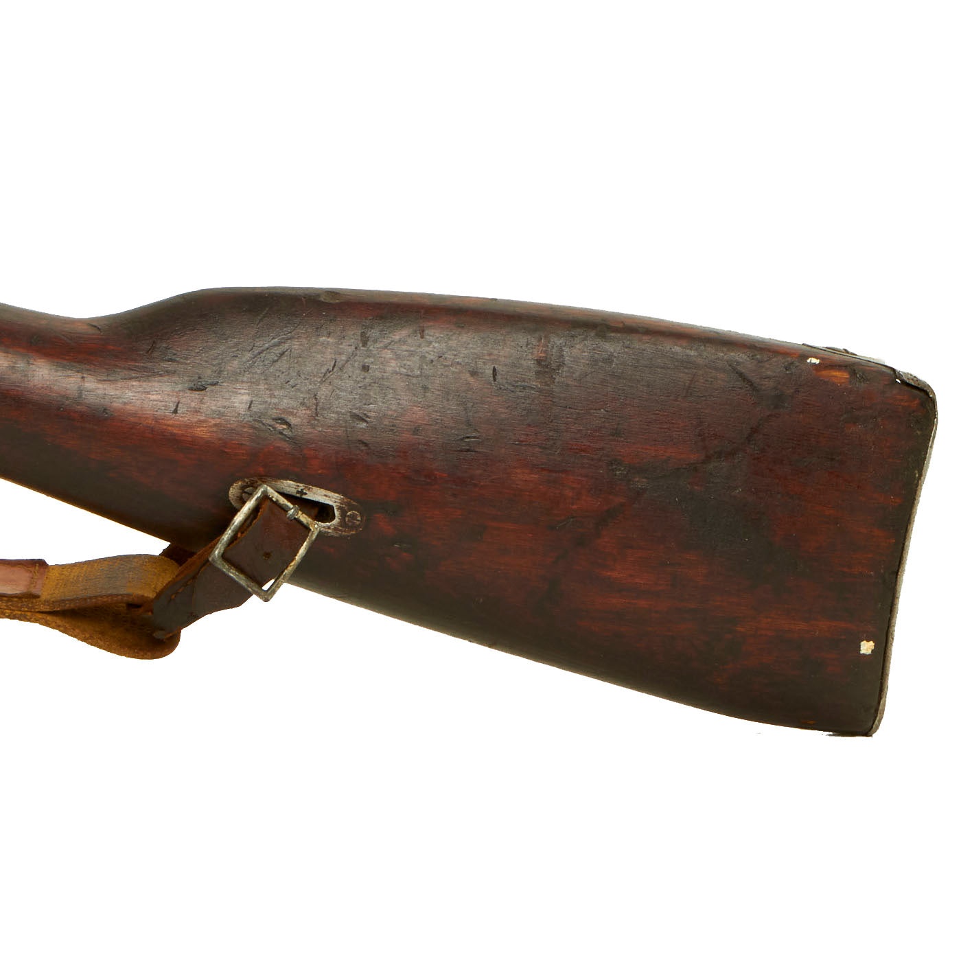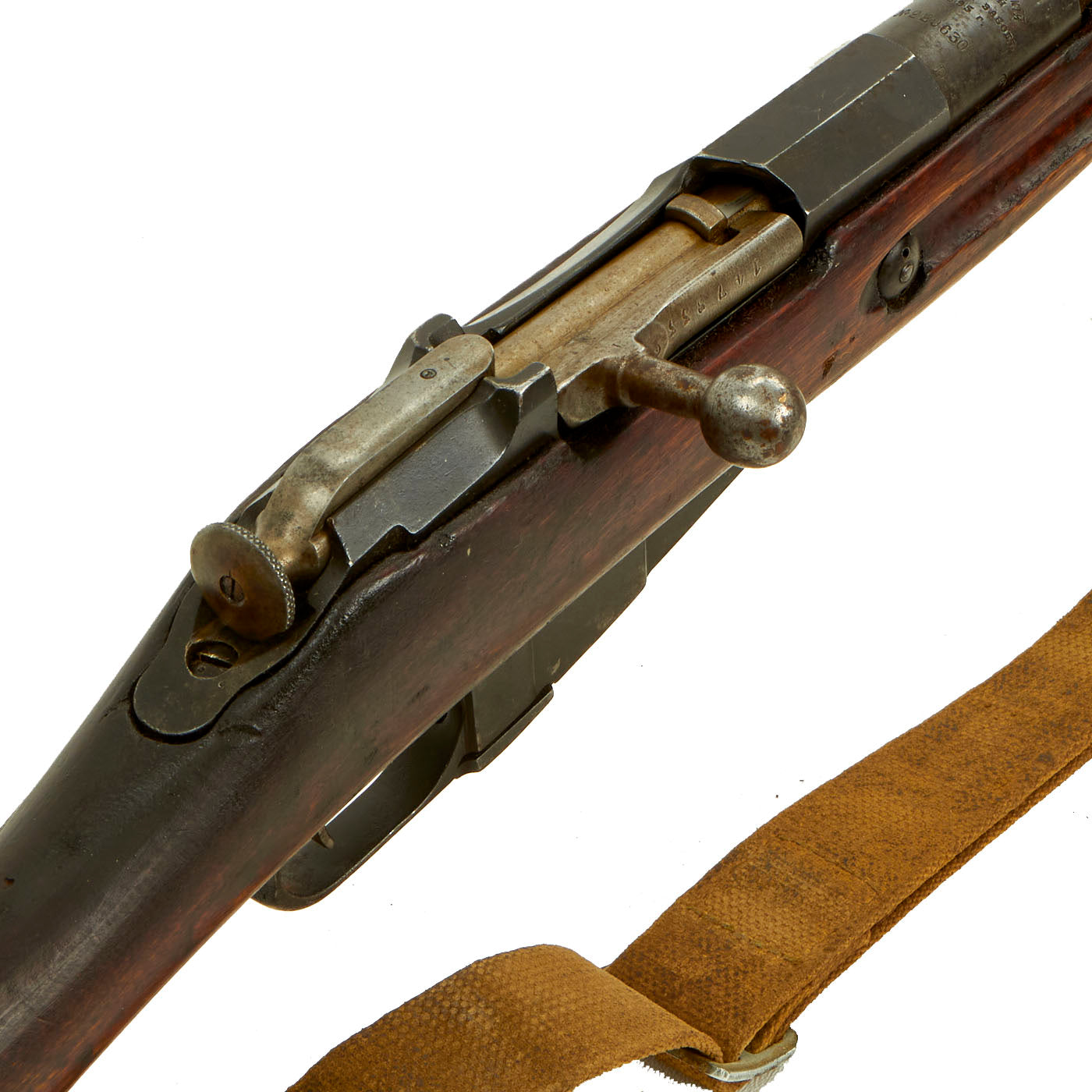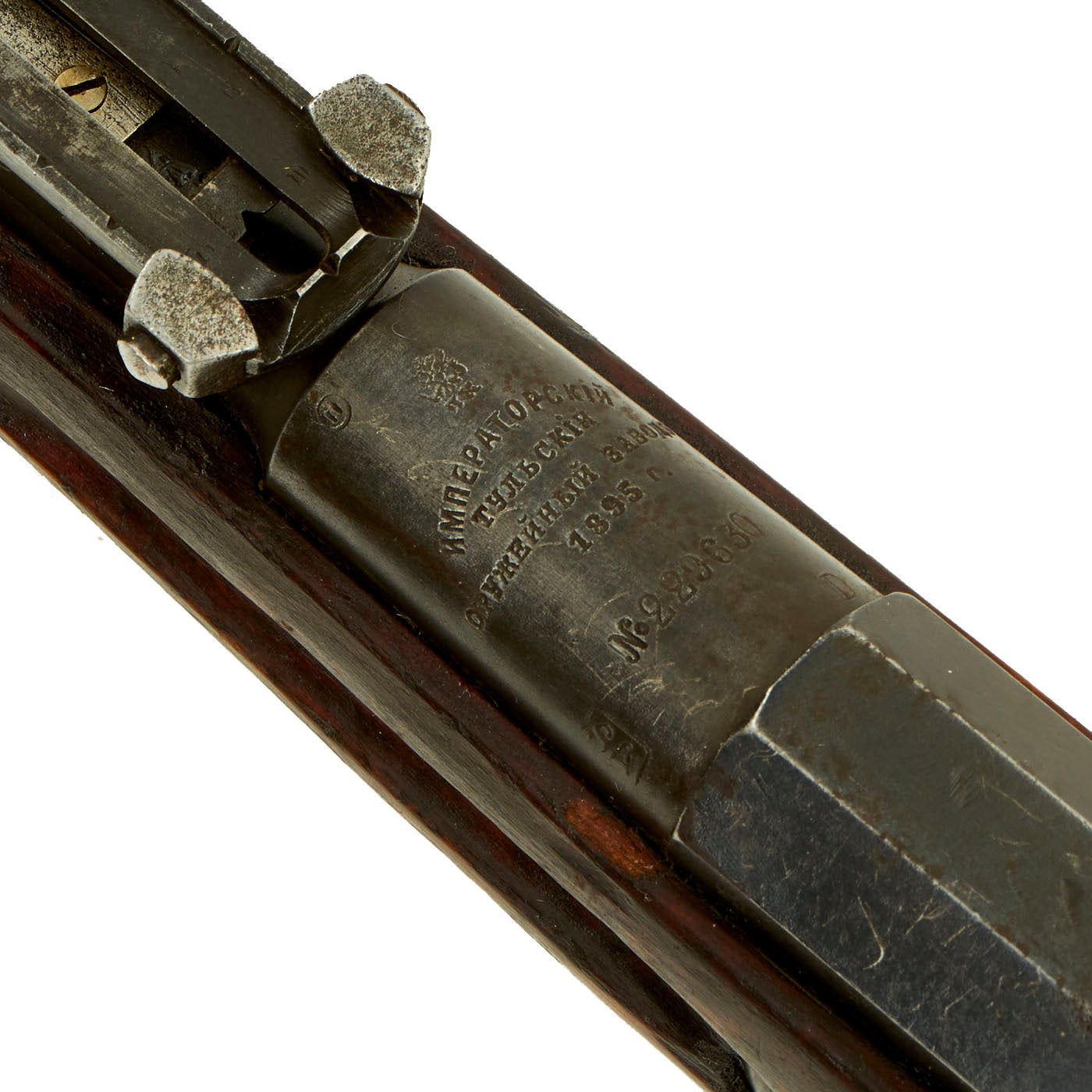 Original Item: Only One Available. These are so very rare, and this is only the third example that we have had in decades. A real pre-1899 Antique Russian Mosin-Nagant M1891 Full Length Rifle, more officially referred to as the "Three Line Infantry Rifle, Model of 1891." This example was never converted to the 91/30 standard, and is still in the original full length. It does have the stock cross bolt for use with the heavier "Spitzer" bullets used, and has the sling slots in place of swivels. It also comes complete with an original M/91 bayonet, and a WWII type canvas and leather sling.