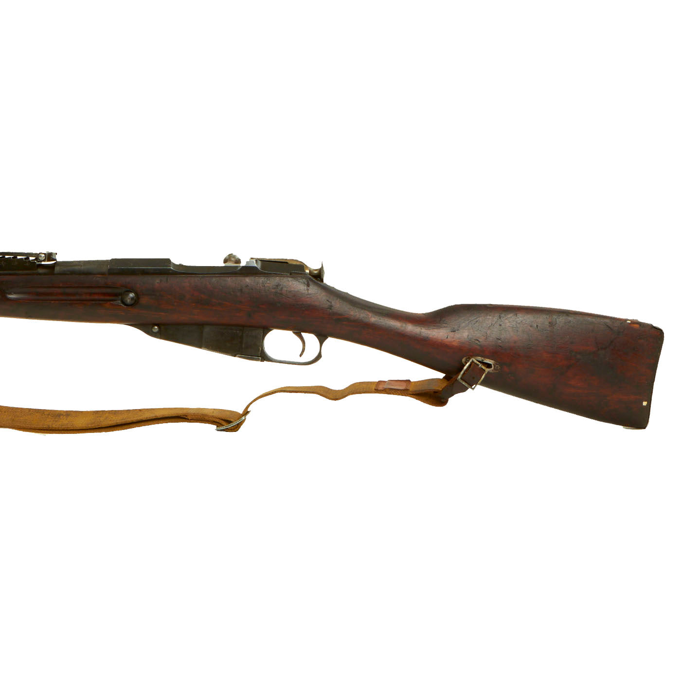 The rifle comes complete with an original early pattern M/91 Socket bayonet, marked with the "Arrow" proof of Tula Arsenal. It is in very good condition, with a lovely aged patina and scattered rust peppering. Also included is an original WWII Era sling, made from heavy canvas with leather fittings. There is a stamp on the inside of the sling, however we are not able to make out what it says.
