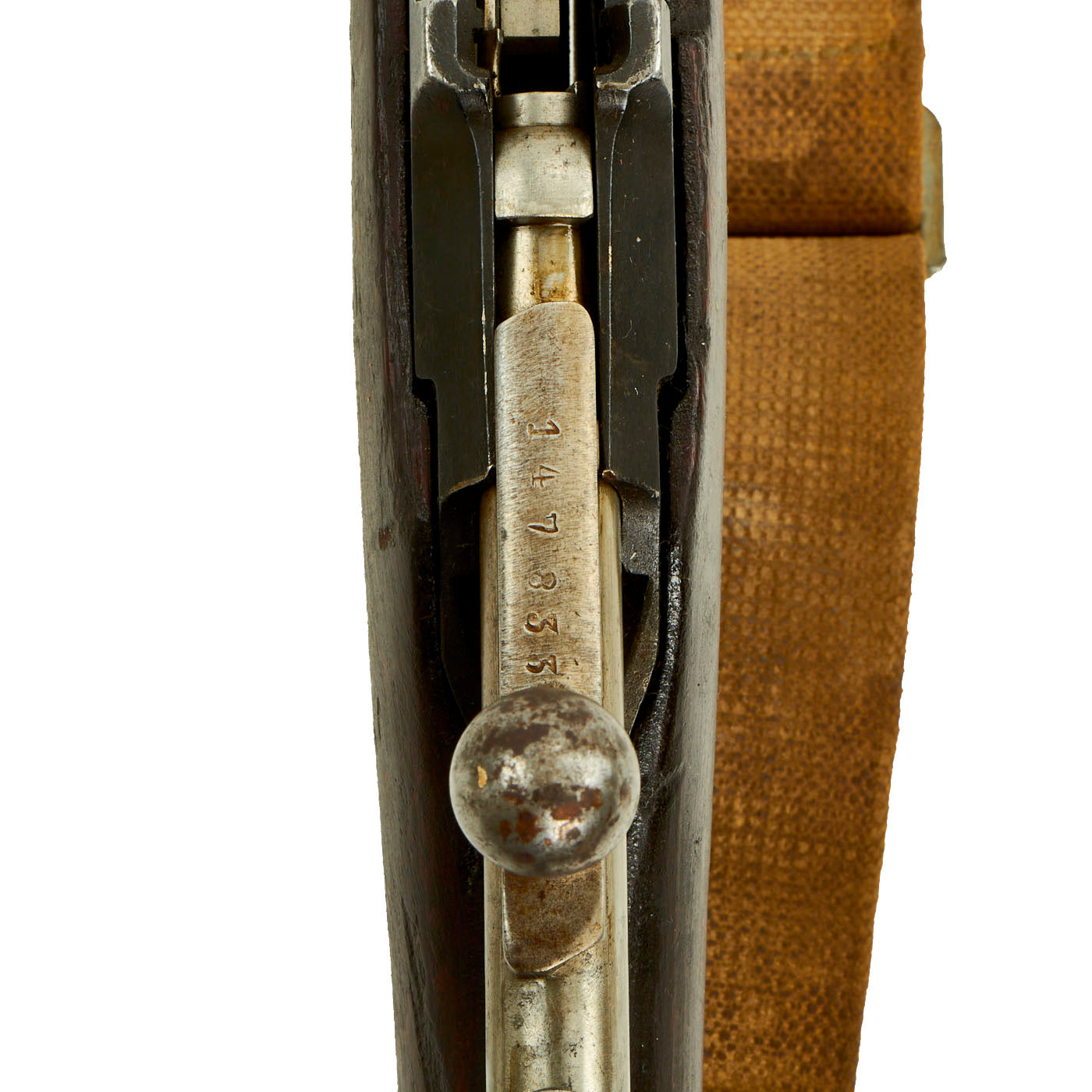 Condition of the rifle is very good, especially considering the age and amount of service it must have seen. The stock is in good condition, with the expected dents, dings, and other damage from long service. It has been refinished, probably several times, and currently has a lovely dark brown color to it. The metalwork is in good shape, with much of the original bluing present on the barrel and receiver, with the bolt still mostly bright steel. It still retains the original cleaning rod, which is in good shape, still threading properly into the stock. The rifle cycles well, with a crisp dry fire.