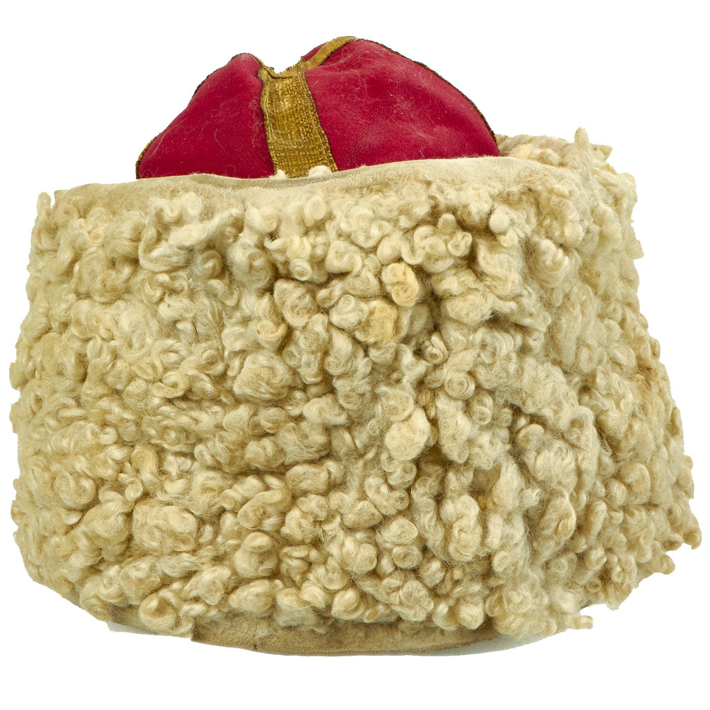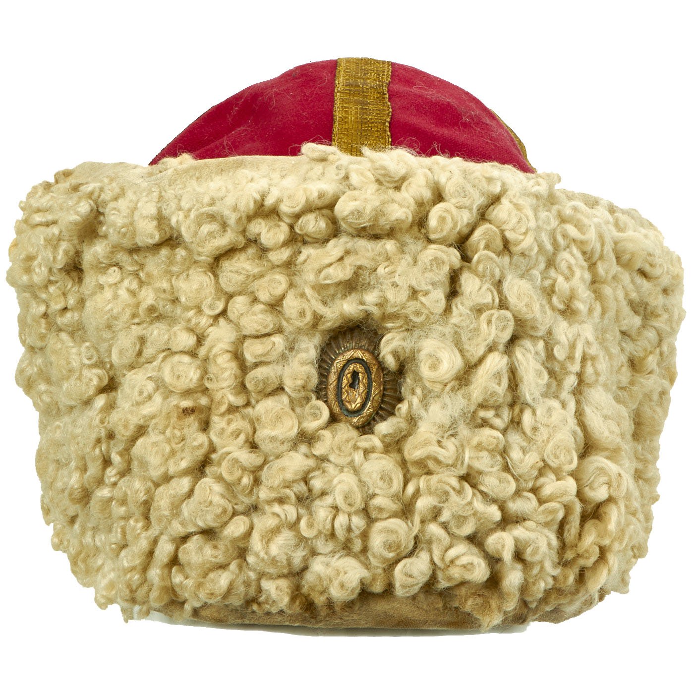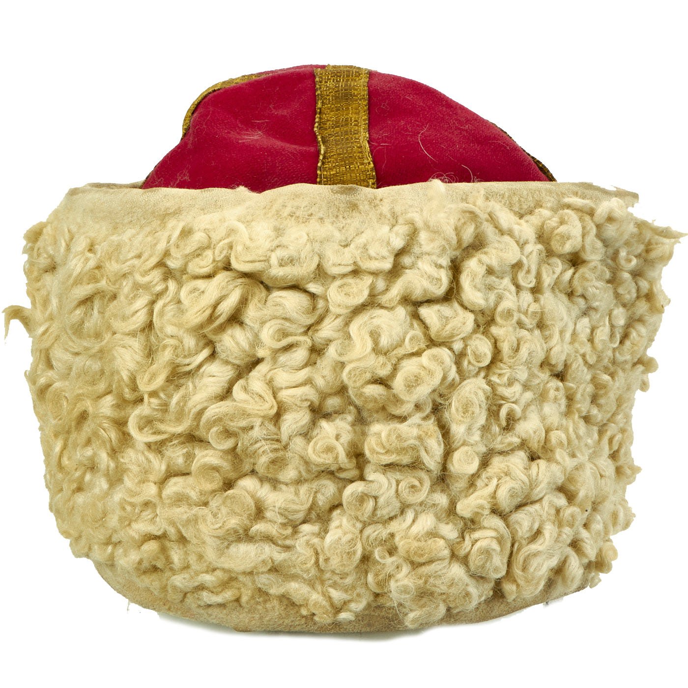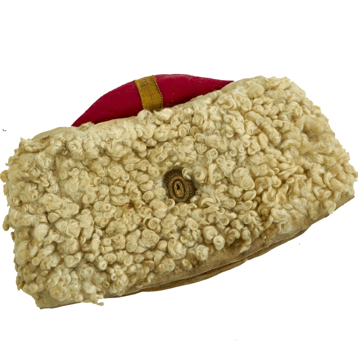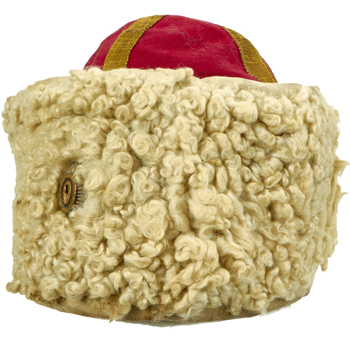 This is a genuine WWI Imperial Russian officer issue Papakha, offered in good condition in approximately a size 7 US (56cm). This is the simplified "kubanka" version, without the fold down side flaps. It features a red top indicating the Don Cossacks, with a gold bullion cross on the crown, which would indicate an officer’s rank. A silver and brass front Russian Imperial cockade is on the front. The exterior fleece is in good condition, with a nice gray and off white pattern. The interior is lined with coarse linen type fabric.