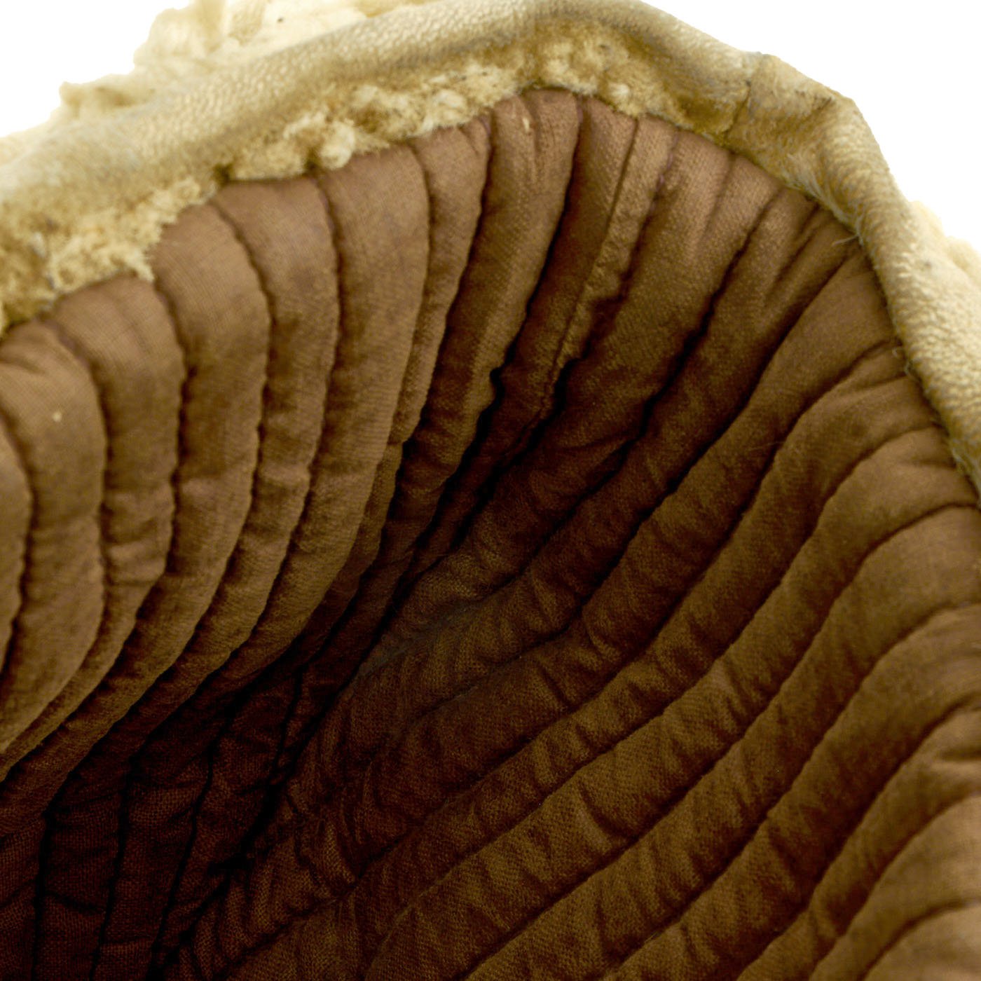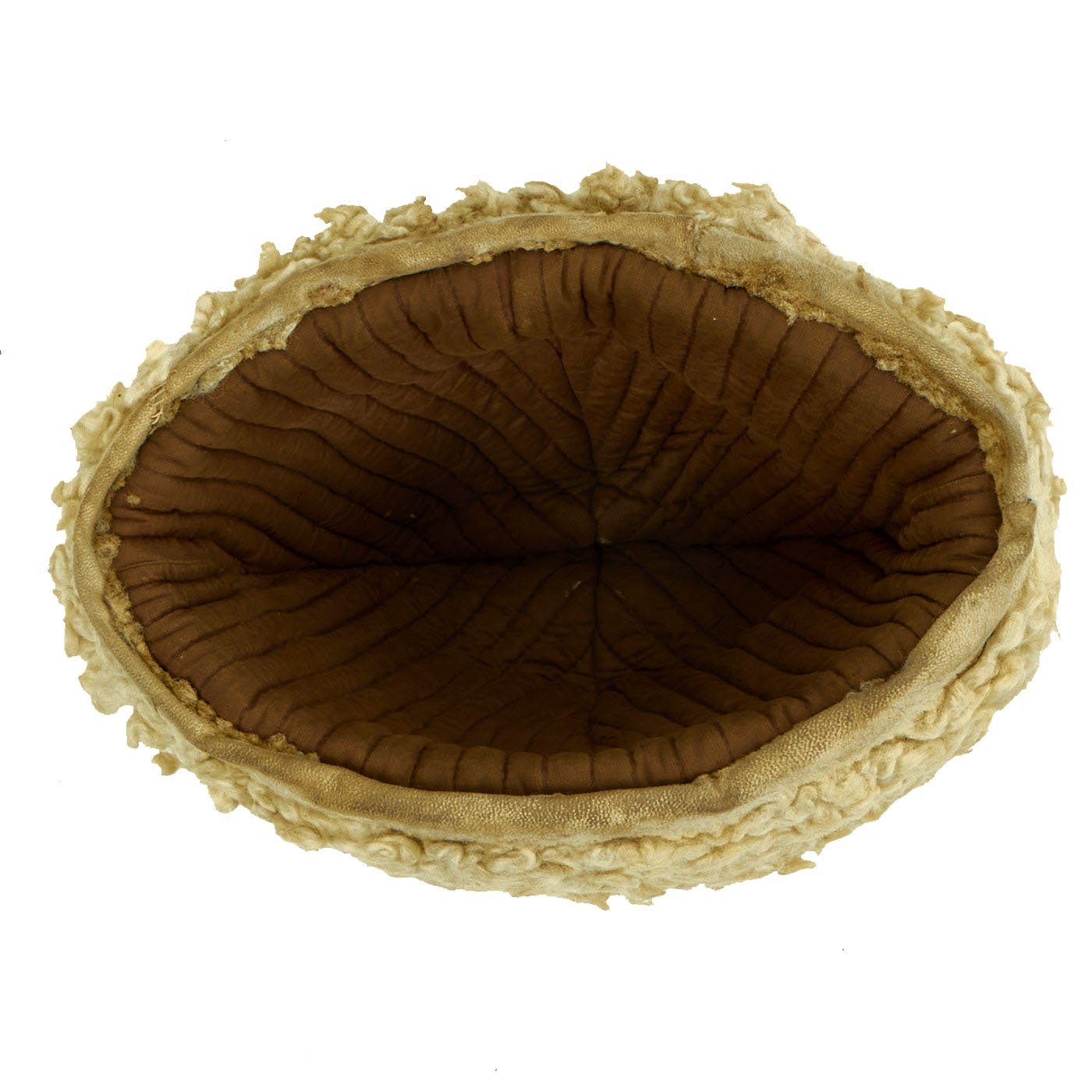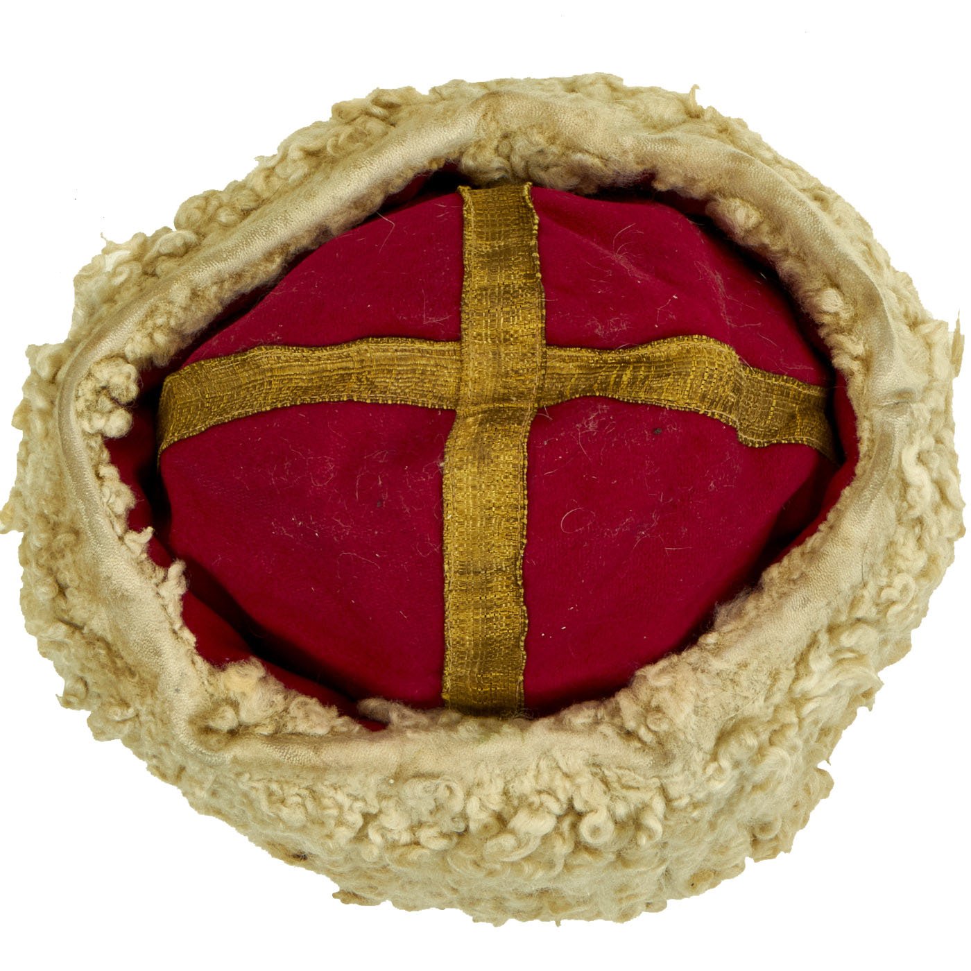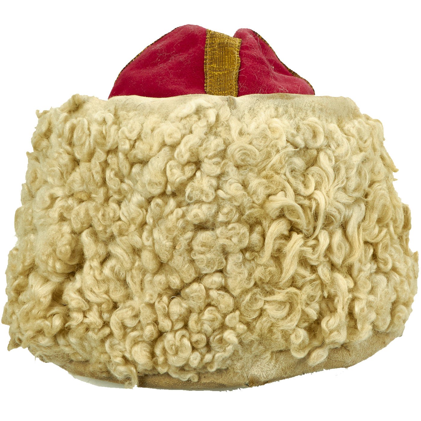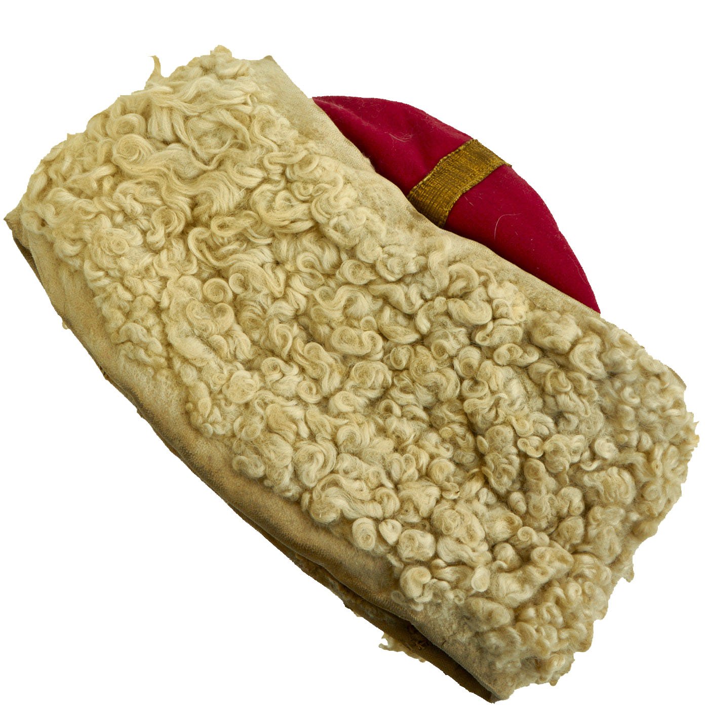 This is a genuine WWI Imperial Russian officer issue Papakha, offered in good condition in approximately a size 7 US (56cm). This is the simplified "kubanka" version, without the fold down side flaps. It features a red top indicating the Don Cossacks, with a gold bullion cross on the crown, which would indicate an officer’s rank. A silver and brass front Russian Imperial cockade is on the front. The exterior fleece is in good condition, with a nice gray and off white pattern. The interior is lined with coarse linen type fabric.